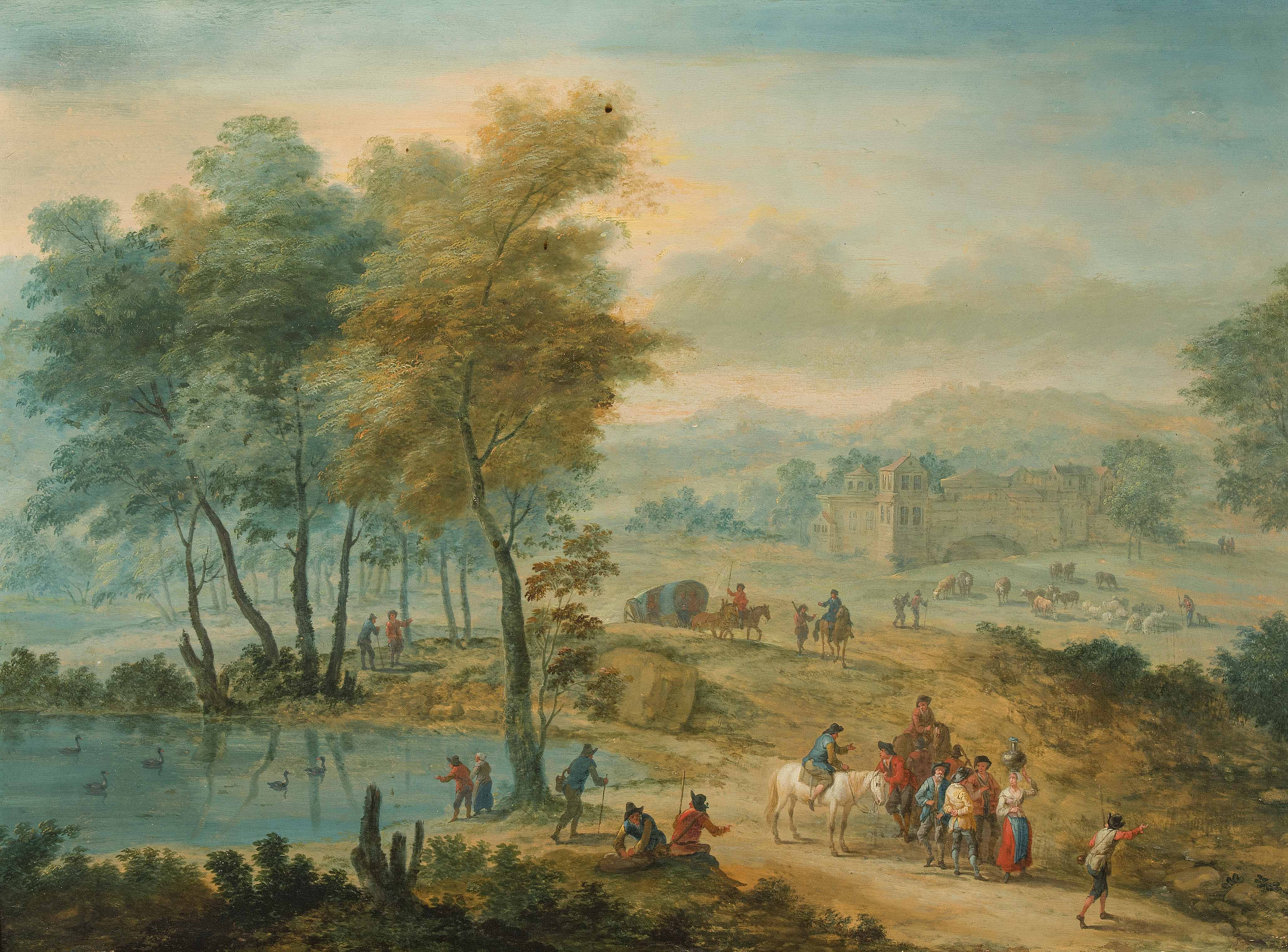 Weite Landschaft mit Handelstreibenden. Öl auf Holz. 43,2x58,3 cm.