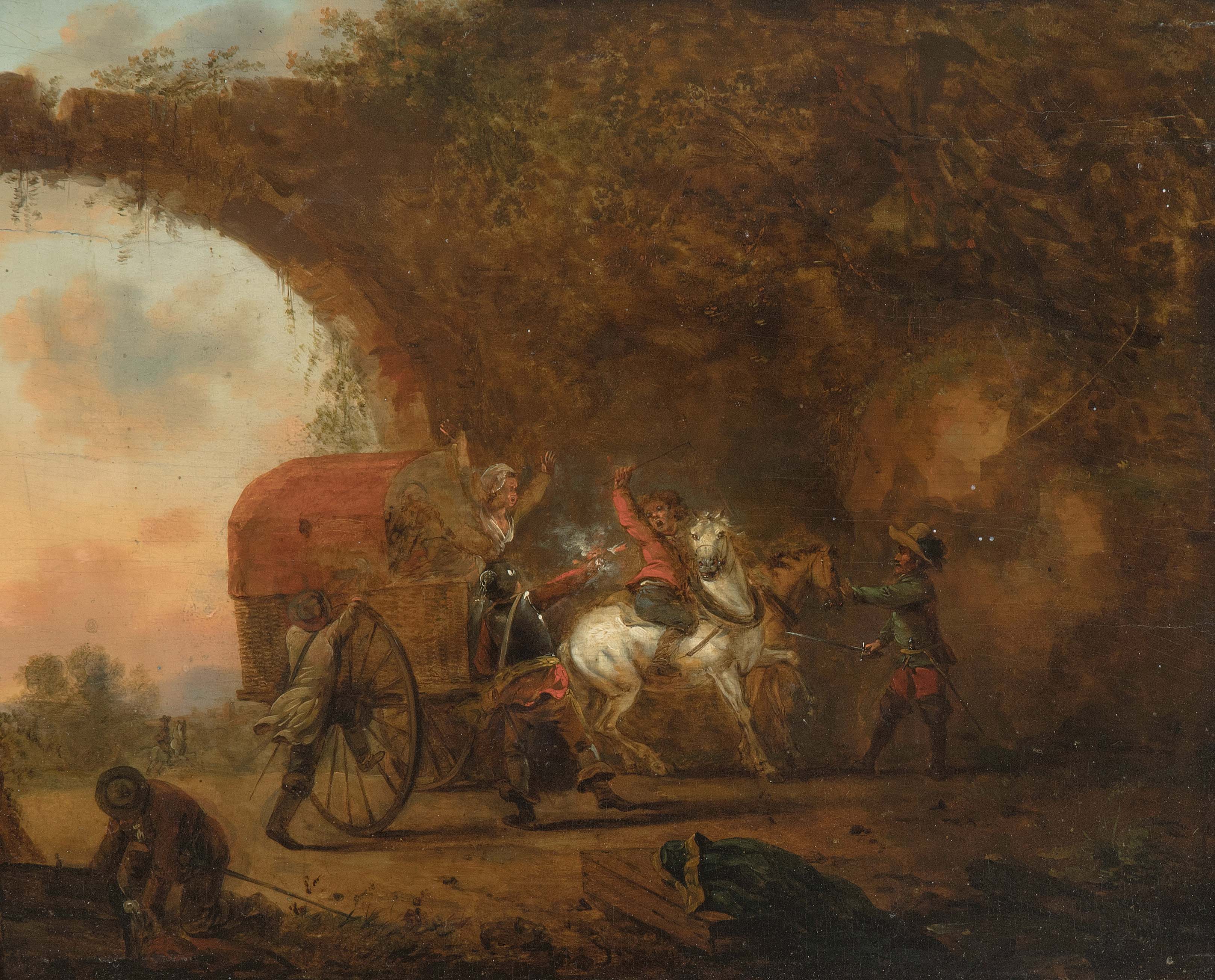 Überfall auf einen Reisewagen. Öl auf Holz. 25,5x34 cm.