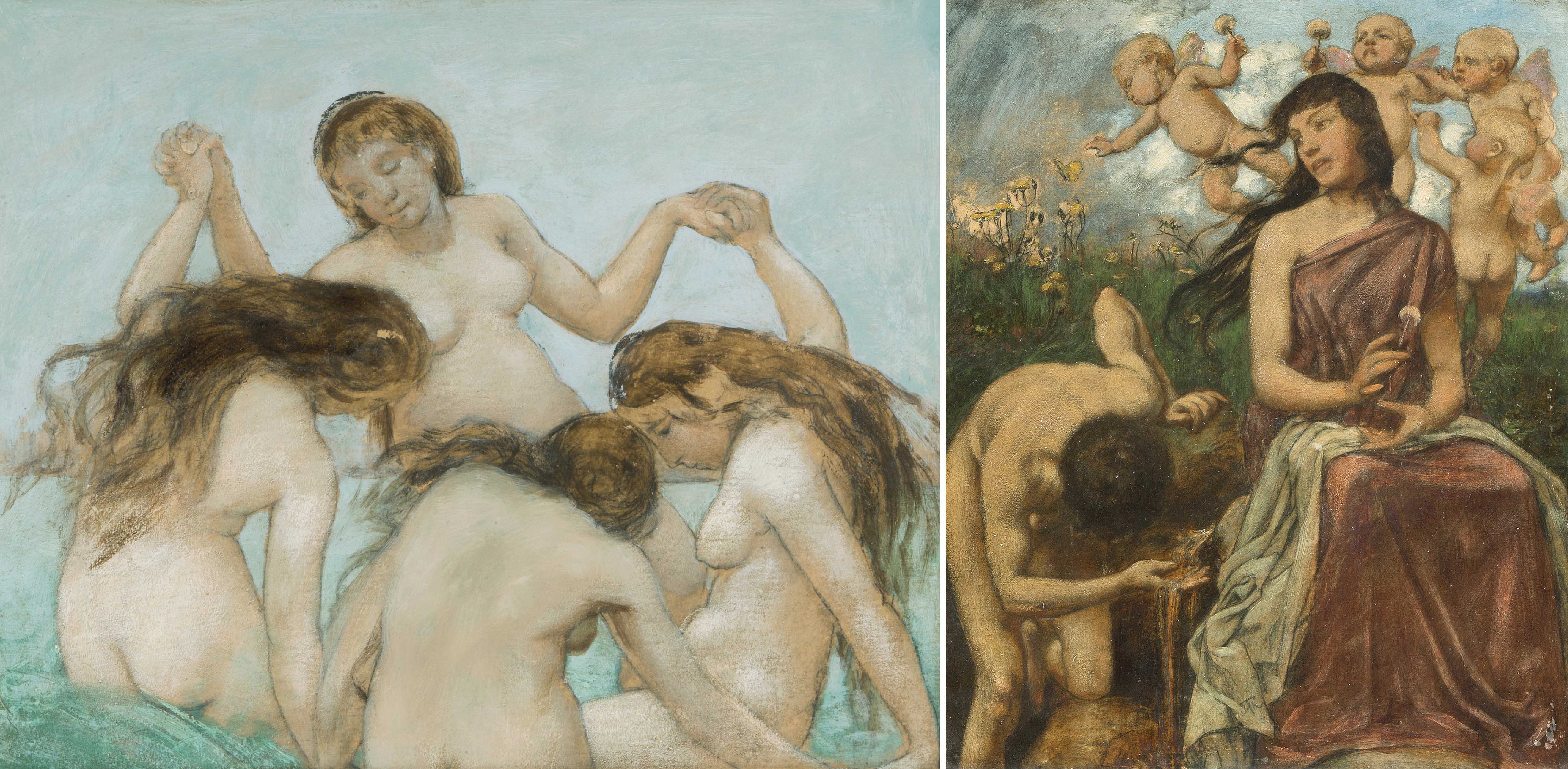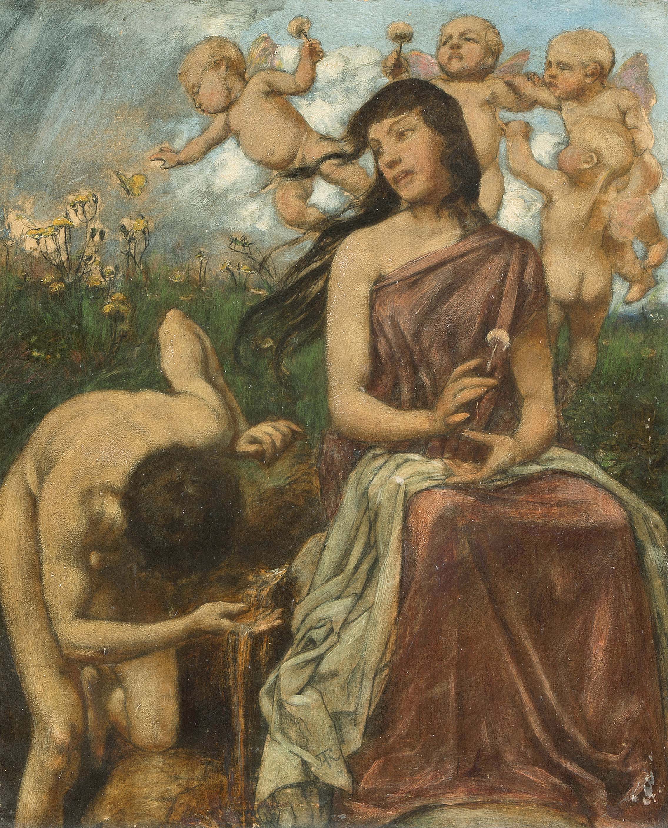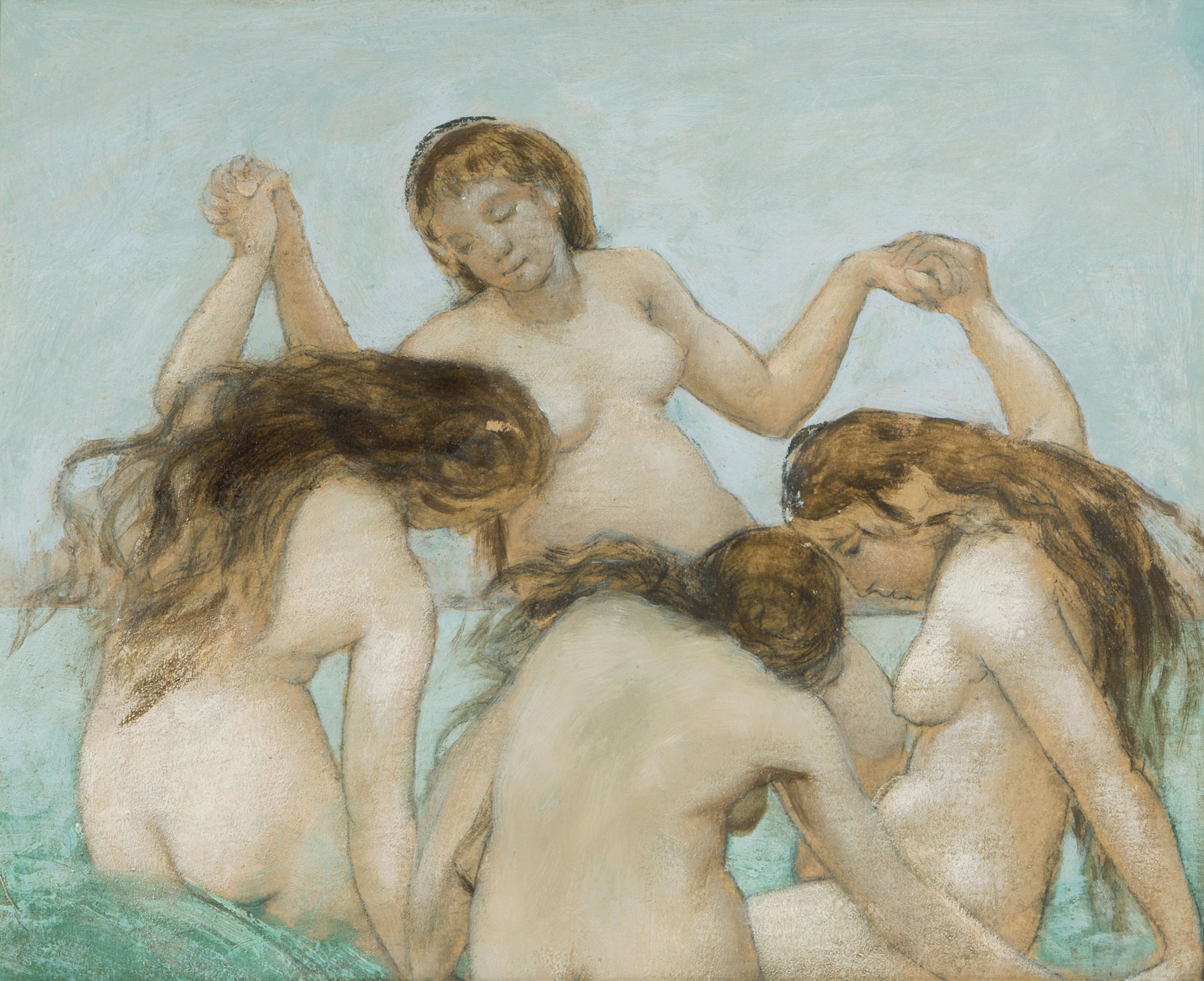 Quellnymphe (recto) / Rheintöchter (verso). Ölstudie auf Papier über Karton, bzw. auf Karton. Recto unten in der Mitte monogrammiert. Lichtmass 35x28,5 cm, bzw. 34,5x28 cm.