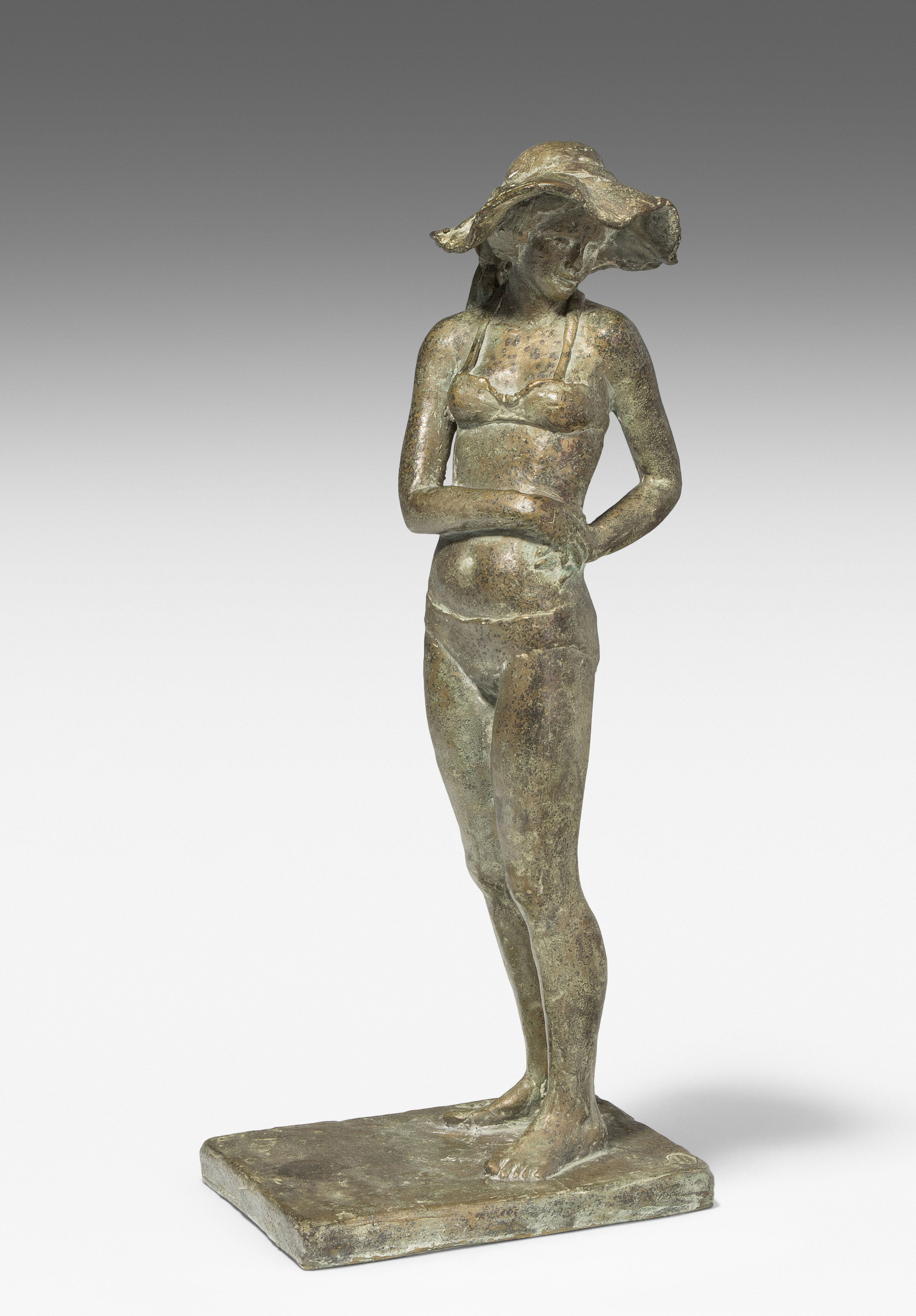 Stehendes Mädchen im Bikini mit Sonnenhut. Bronze. Auf dem Bronzesockel signiert und mit Giessermarke: "Cire perdue F. Amici". H 42,5 cm. -Patina. Leicht schmutzig.