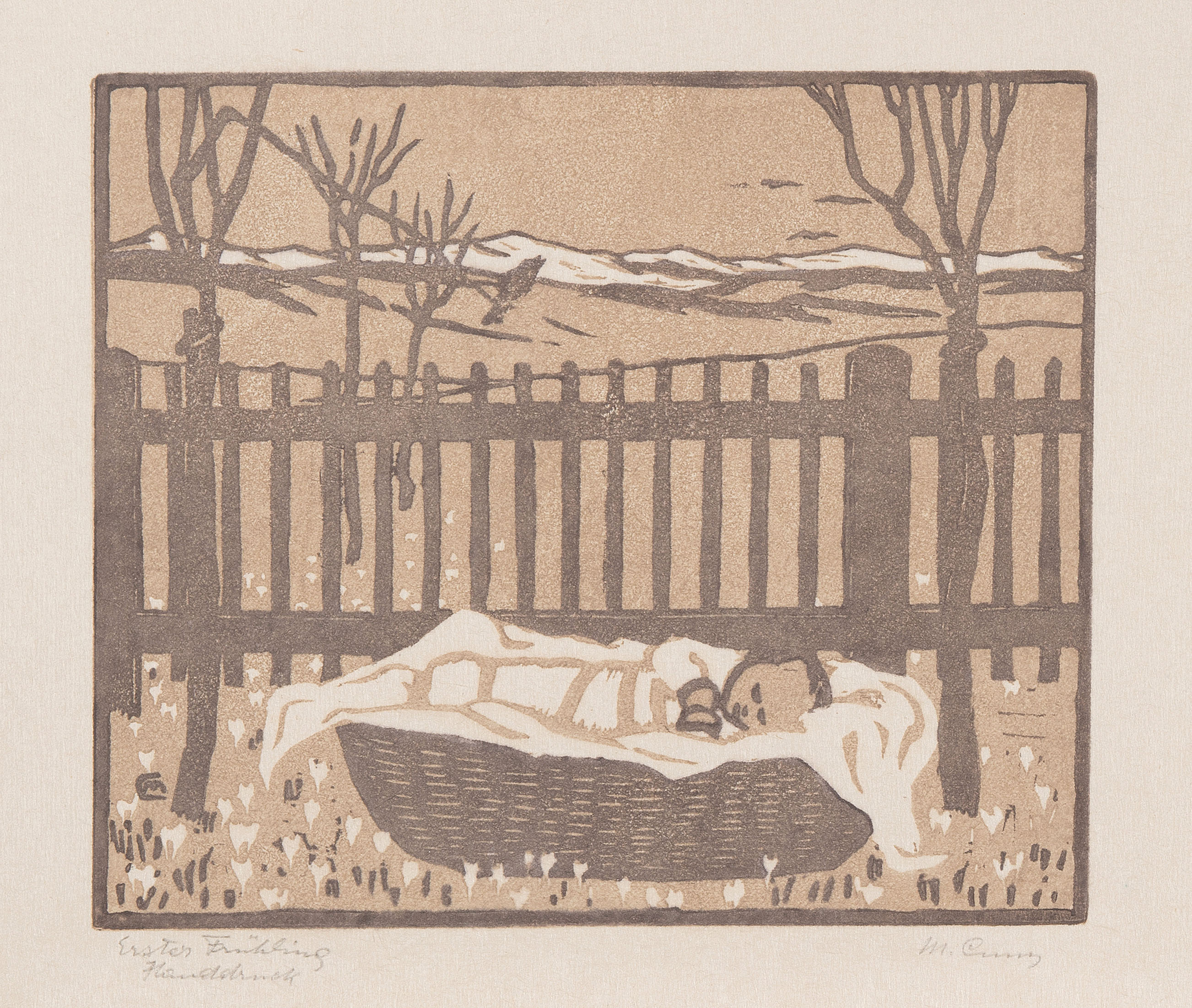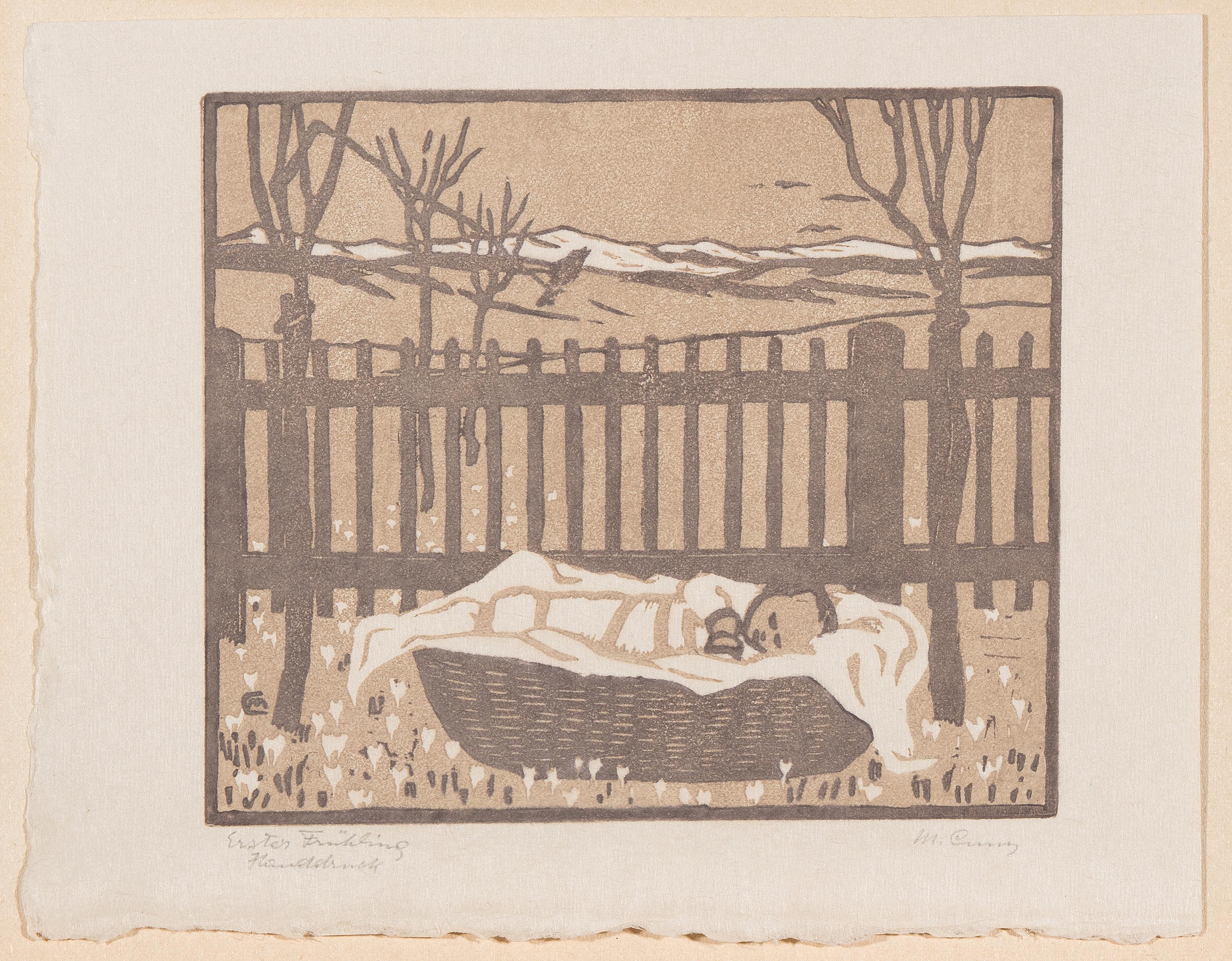 "Erster Frühling". 1925. Farbholzschnitt. Unten links im Druck monogrammiert. Unten rechts in Bleistift signiert. Unten links in Bleistift betitelt und bezeichnet: "Handdruck". Plattengrösse 13,6x15,9 cm. Blattgrösse 17x21,5 cm. -Blatt leicht gebräunt. Ränder und Ecken minimst bestossen.