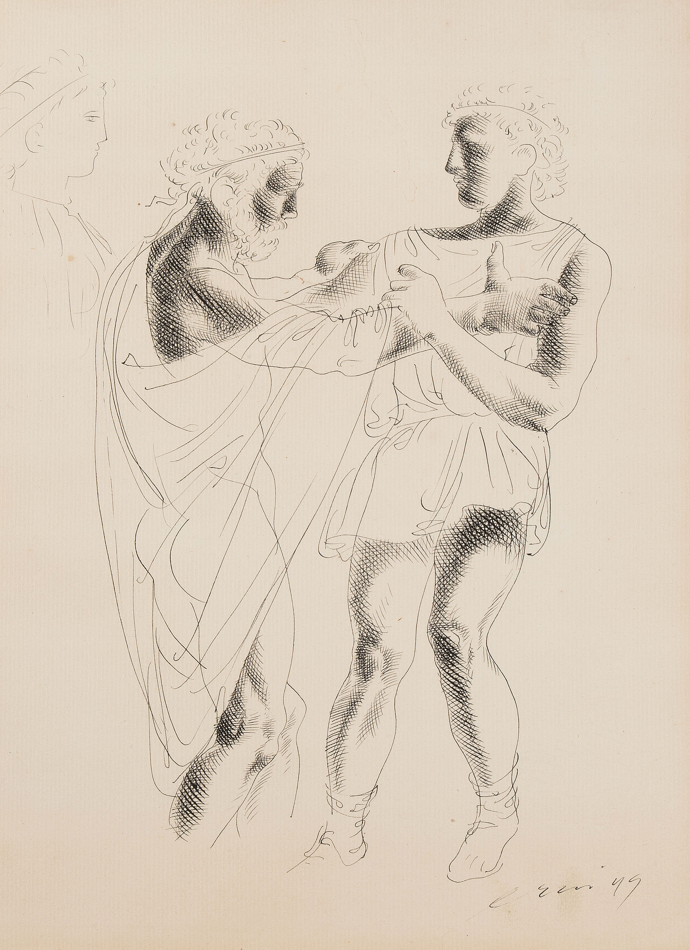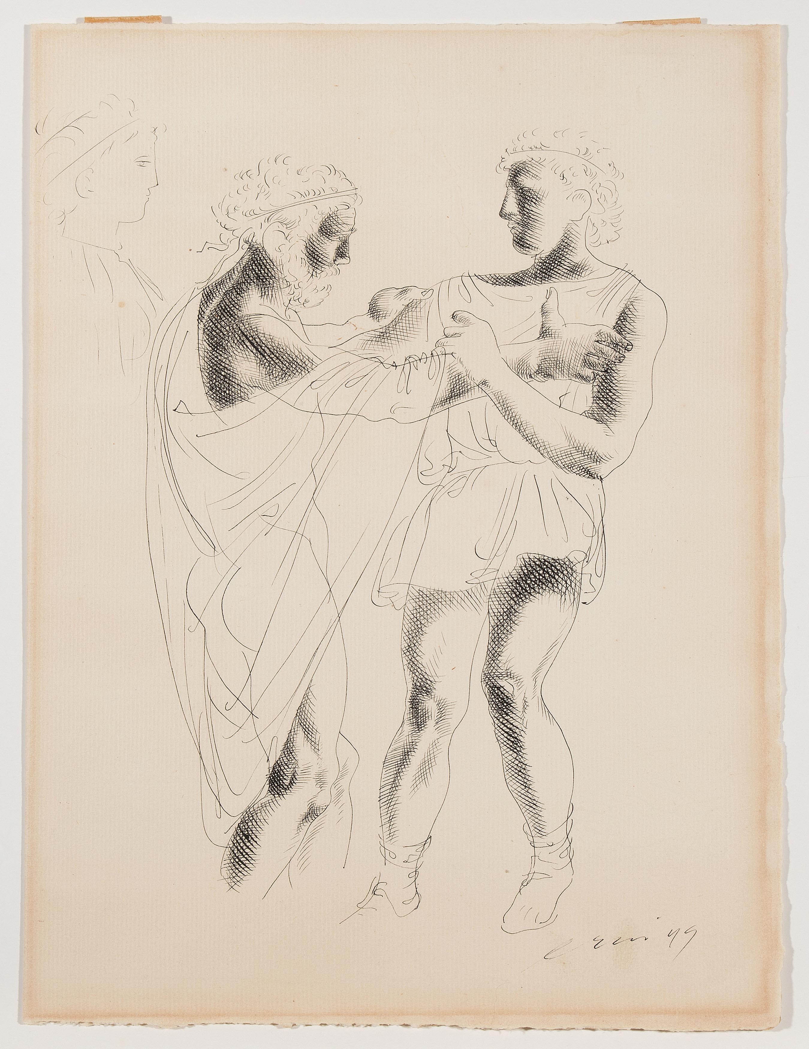 "Kreon und Haimon". 1949. Tuschfeder auf Papier. Unten rechts in Tusche signiert und datiert. Blattgrösse 38,5x57,4 (gefaltet 38,5x28,7) cm. -Blatt gebräunt. Hellerer Lichtrand. Leicht braunfleckig. Verso am oberen Rand mit Klebspurresten.