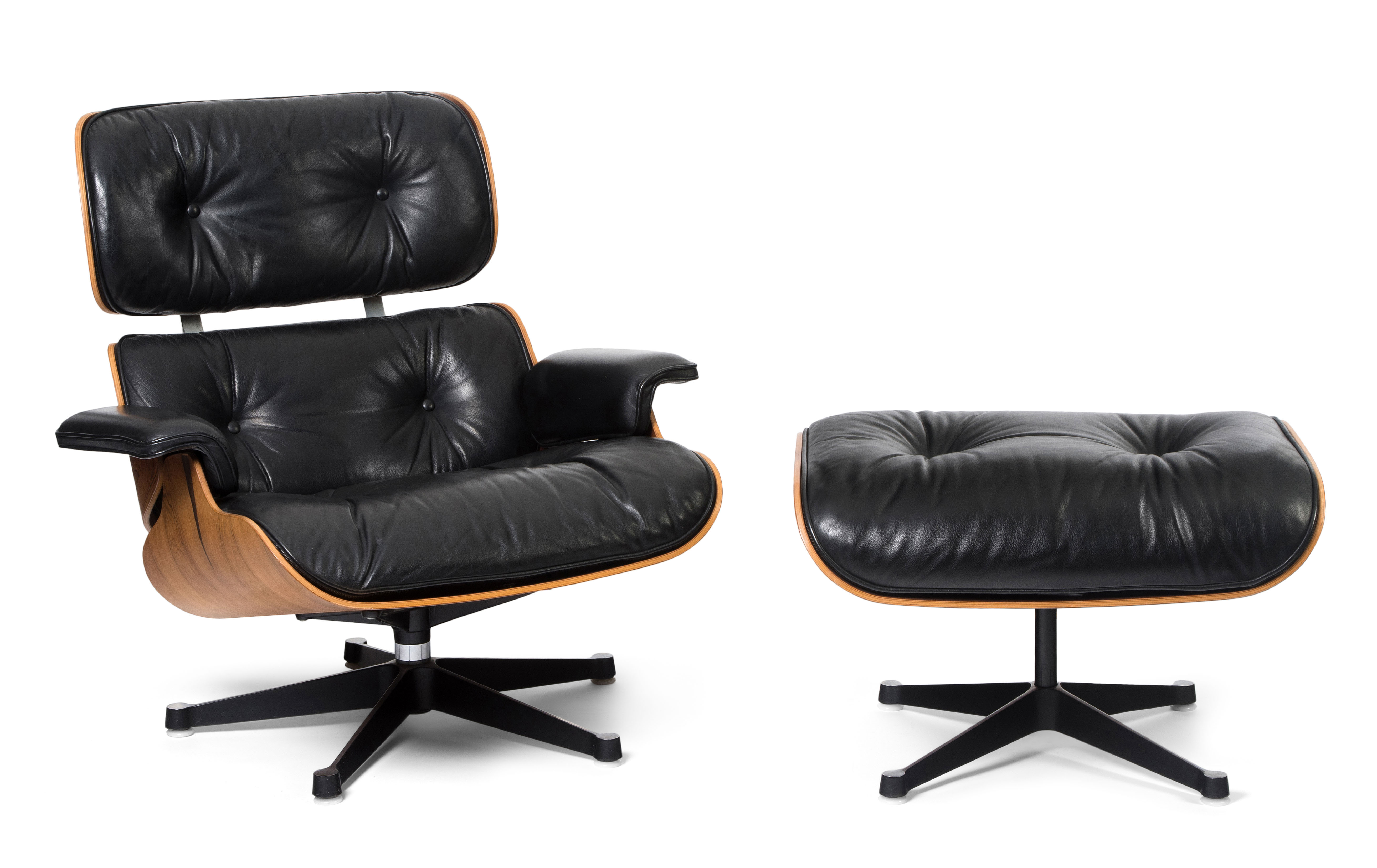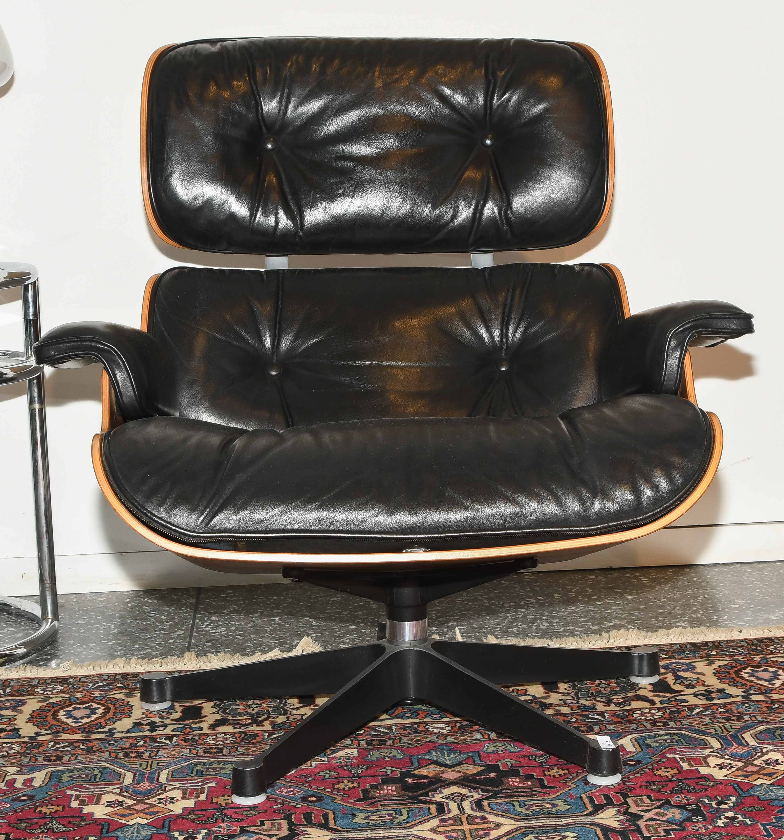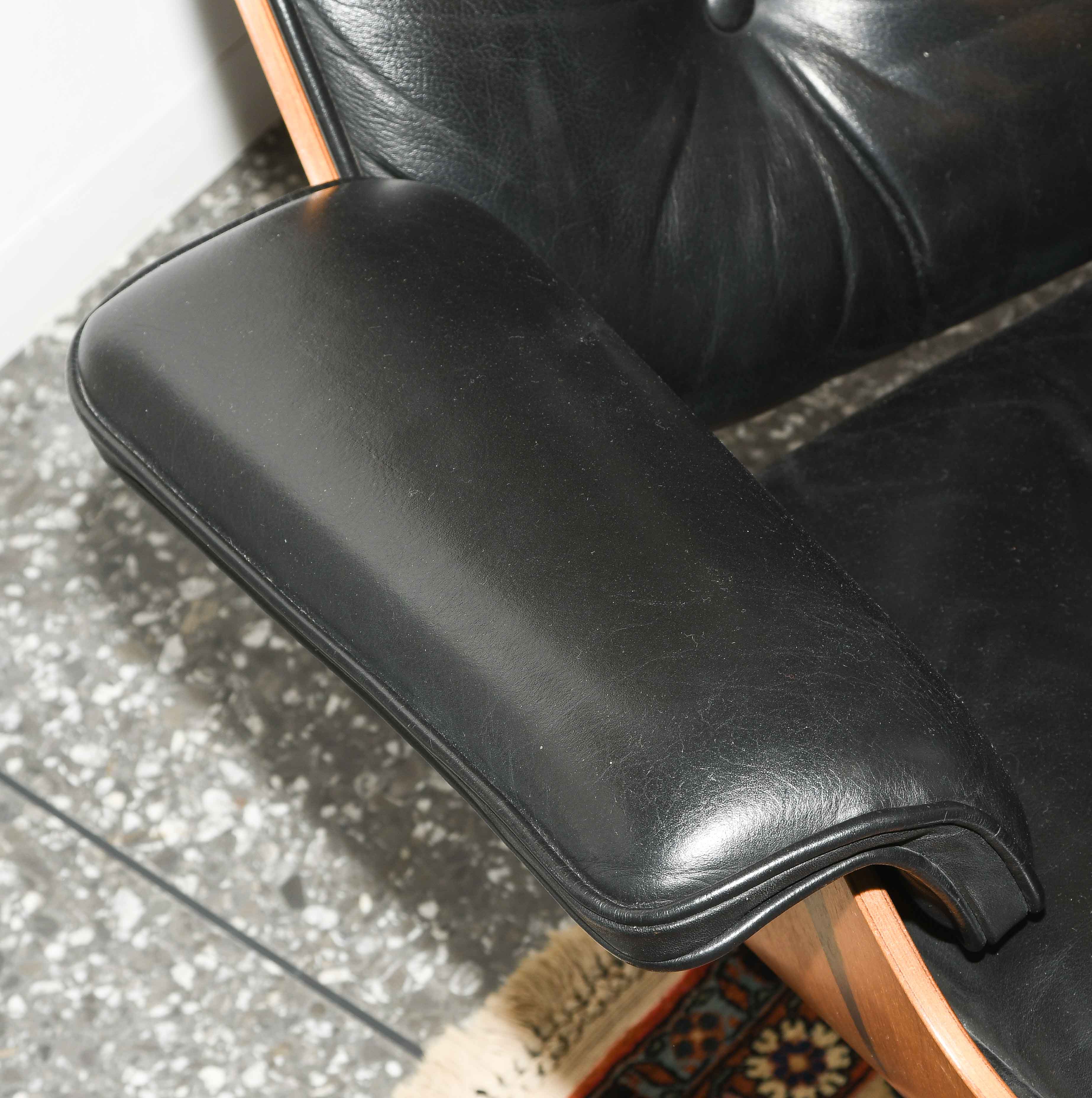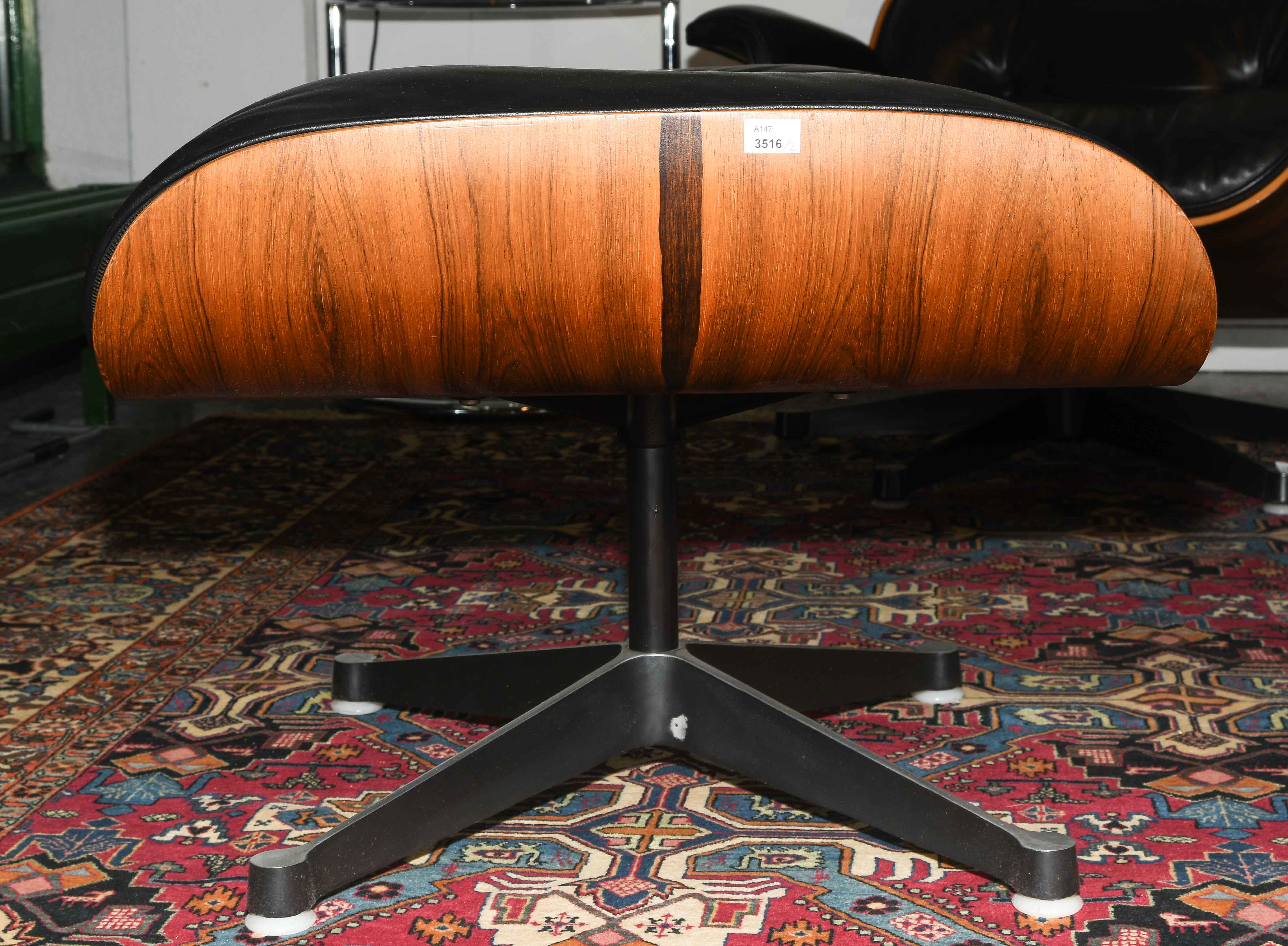 Lounge Sessel mit Ottoman, Modell Nr. 670. Entwurf 1956. Ausführung Vitra, ohne Bezeichnung. Sitzschale aus Palisander und gepolsterter Lederbezug, schwarz. Gebrauchsspuren. Guter Zustand. 86x85x84 cm. Sitzhöhe ca. 38 cm.