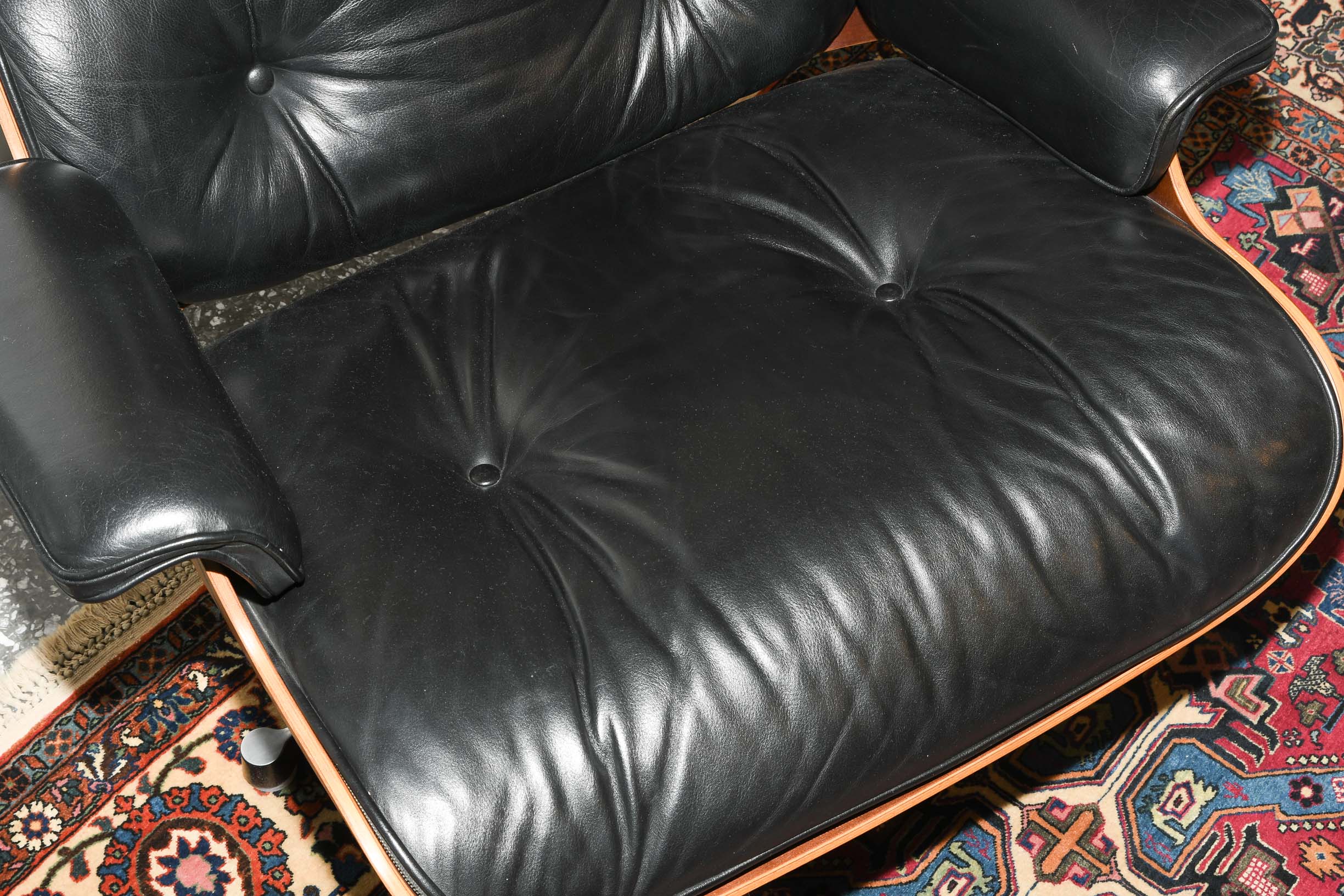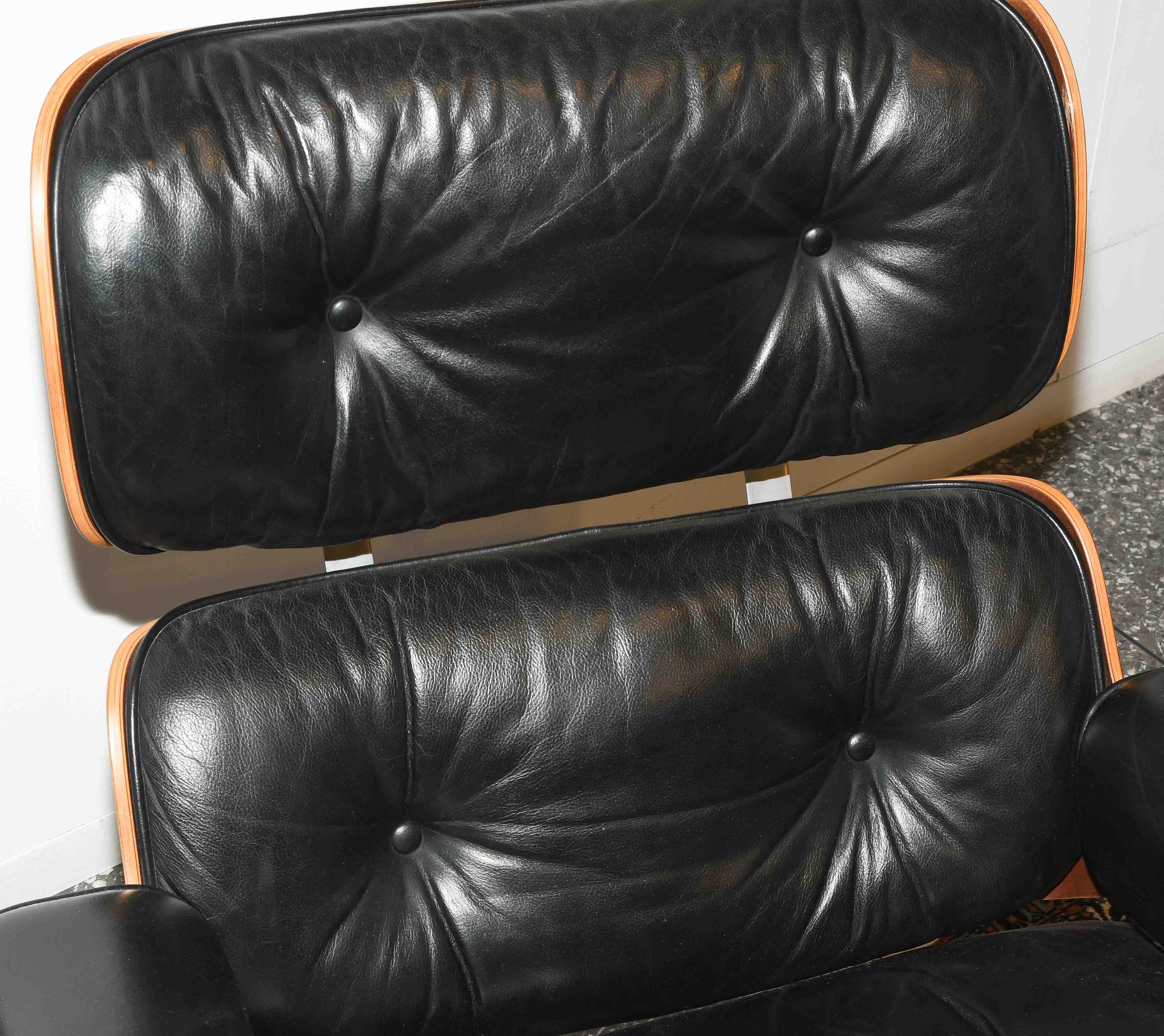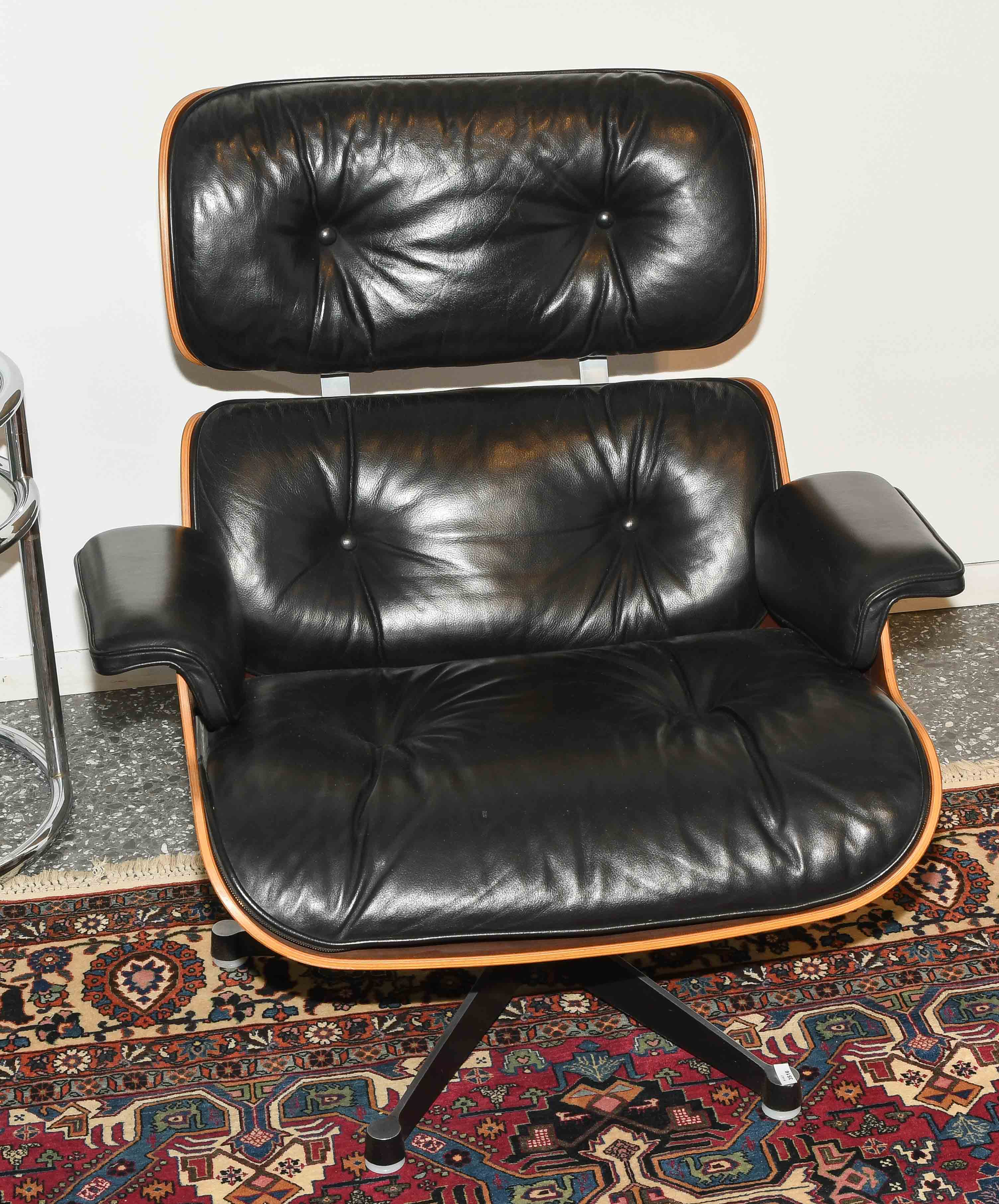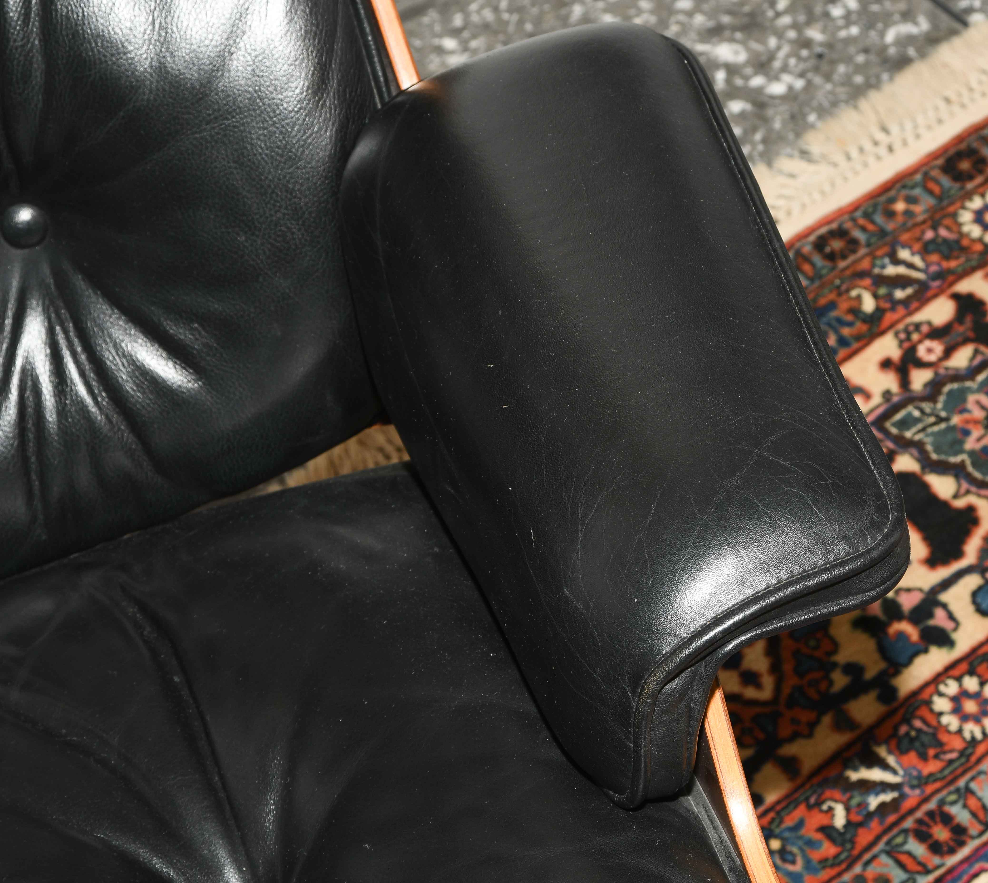 Lounge Sessel mit Ottoman, Modell Nr. 670. Entwurf 1956. Ausführung Vitra, ohne Bezeichnung. Sitzschale aus Palisander und gepolsterter Lederbezug, schwarz. Gebrauchsspuren. Guter Zustand. 86x85x84 cm. Sitzhöhe ca. 38 cm.