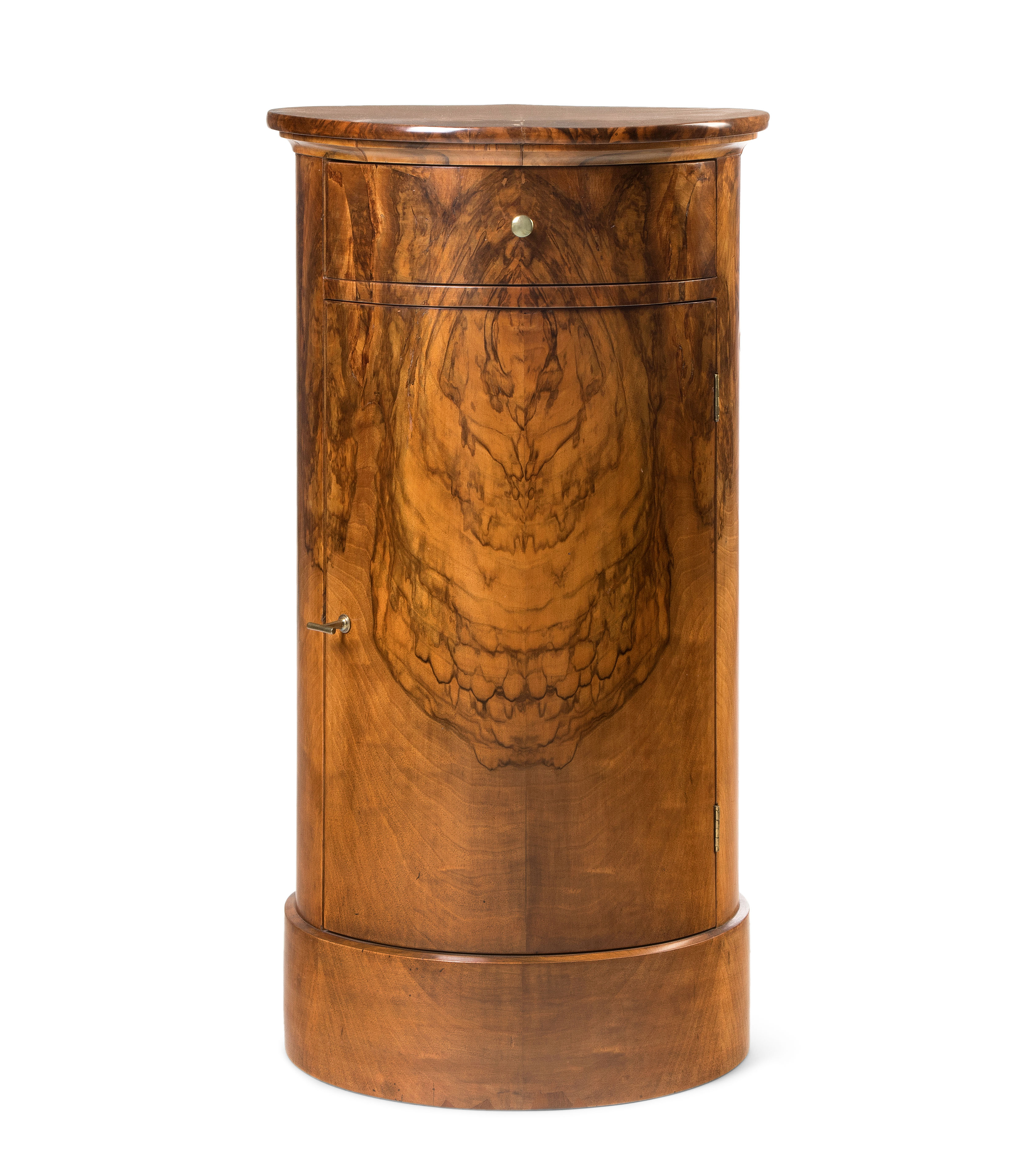 Biedermeier ca. 1820. Nussbaum. Eintüriger runder Korpus, auf hoher Sockelleiste mit obenliegender Schublade. Kleine Gebrauchsspuren. 42x42x80 cm.