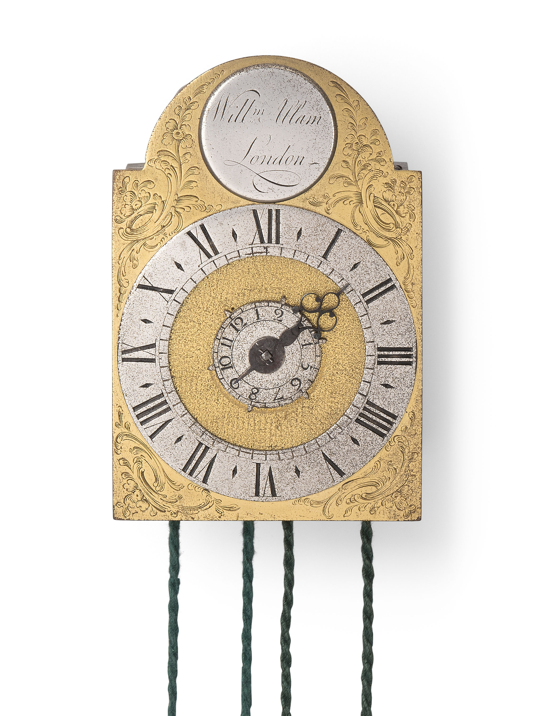 England, 18.Jh. Vergoldetes Messinggehäuse. Floral ziselierte Frontseite Signaturplakette im Arkus "William Allan London". Aufgesetzter, versilberter Zifferring mit römischen Ziffern. Weckzeiteinstellung im Zentrum. Spindelwerk mit kleinem Birnenhinterpendel. Weckerfunktion auf Glocke. Gehfähig. 12,5x8 cm.