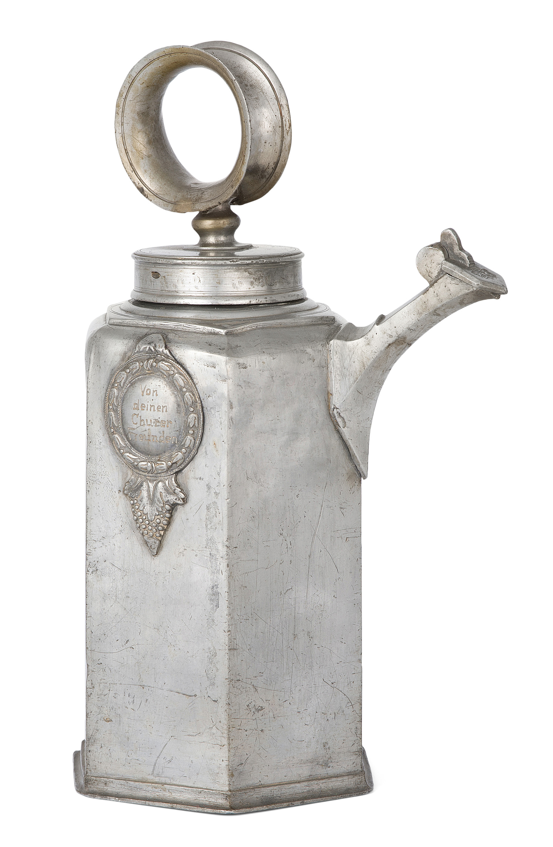 Chur, 1.Hälfte 19.Jh. Zinn. Marke und Bodenrosette des Johann Jakob Ulrich Bauer (1781–1850). Sechsseitig. Ringhenkel mit Schraubverschluss. Profilierter Bodenrand. Typisches Schild der Familie Bauer, später graviert "Von deinen Churer Freunden". H 34 cm.