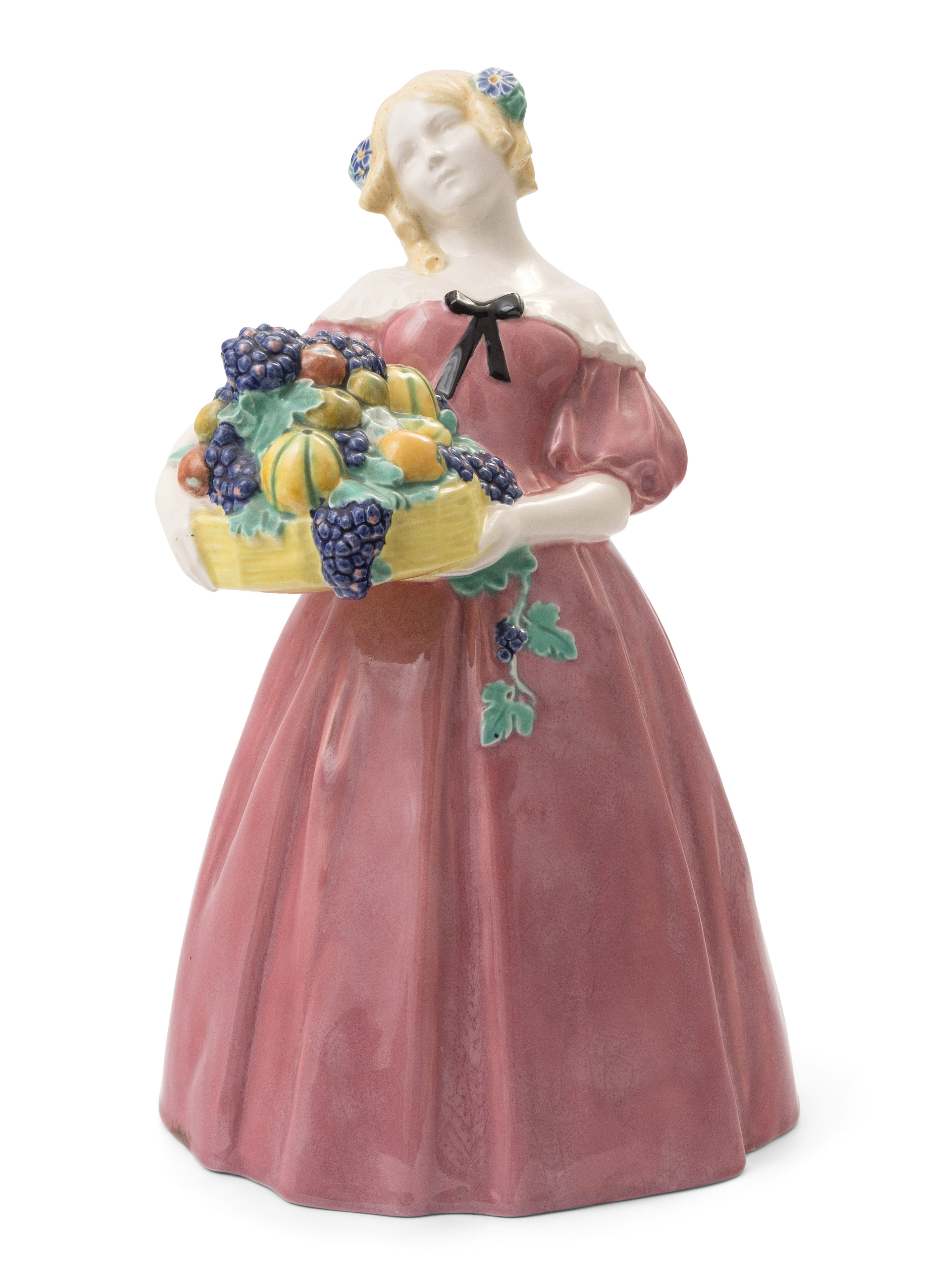 Um 1912. Junge Frau mit Korb voller Früchte, den Herbst darstellend. Entwurf: Emil Meier (Weckelsdorf 1877–1958 Wien). Vereinigte Wiener und Gmundner Keramik. Steingut, bemalt. Bezeichnet: Manufakturmarken. H 29 cm.
