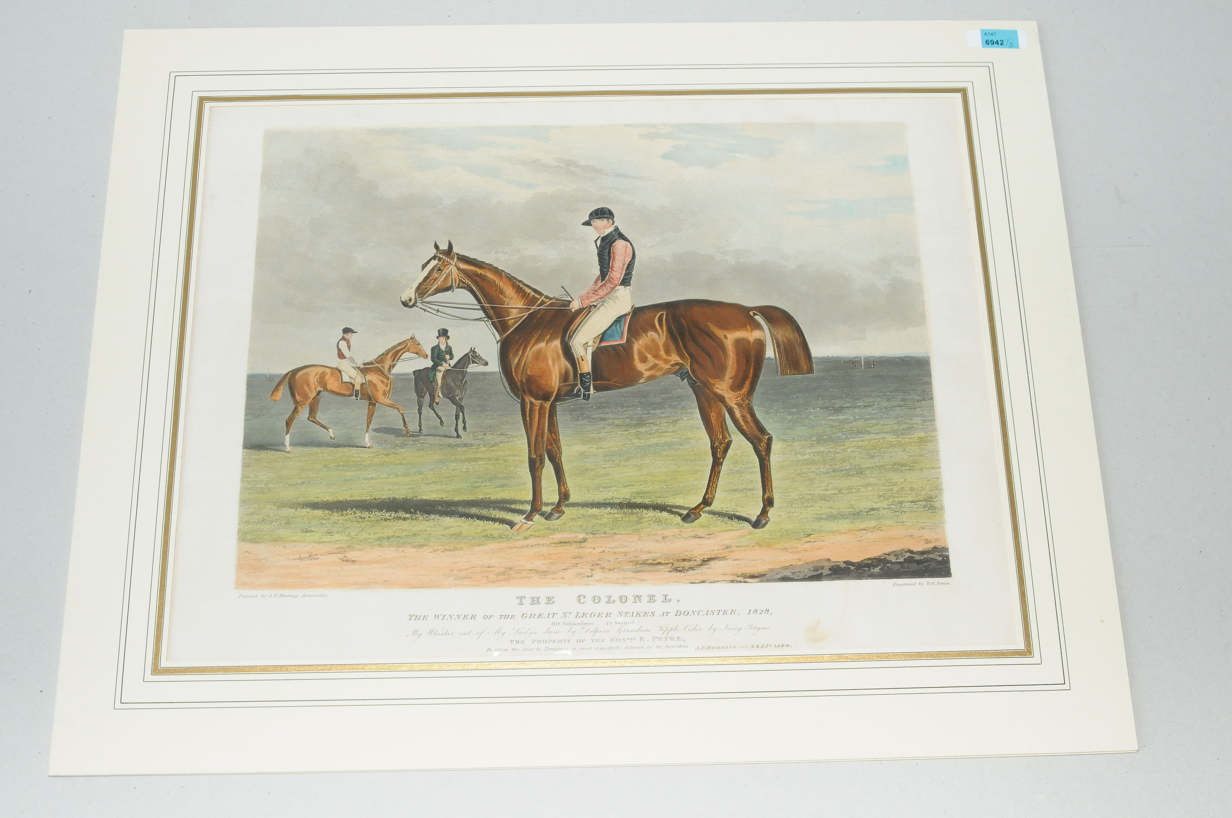 "Ebor". / "Antonio". / "The Colonel". 3 kol. Aquatintas von Sutherland und Reeve aus der Serie The Winners of the Great St. Leger Stakes at Doncaster, 1817, 1819 und 1828. Je ca. 30,5x41 cm.