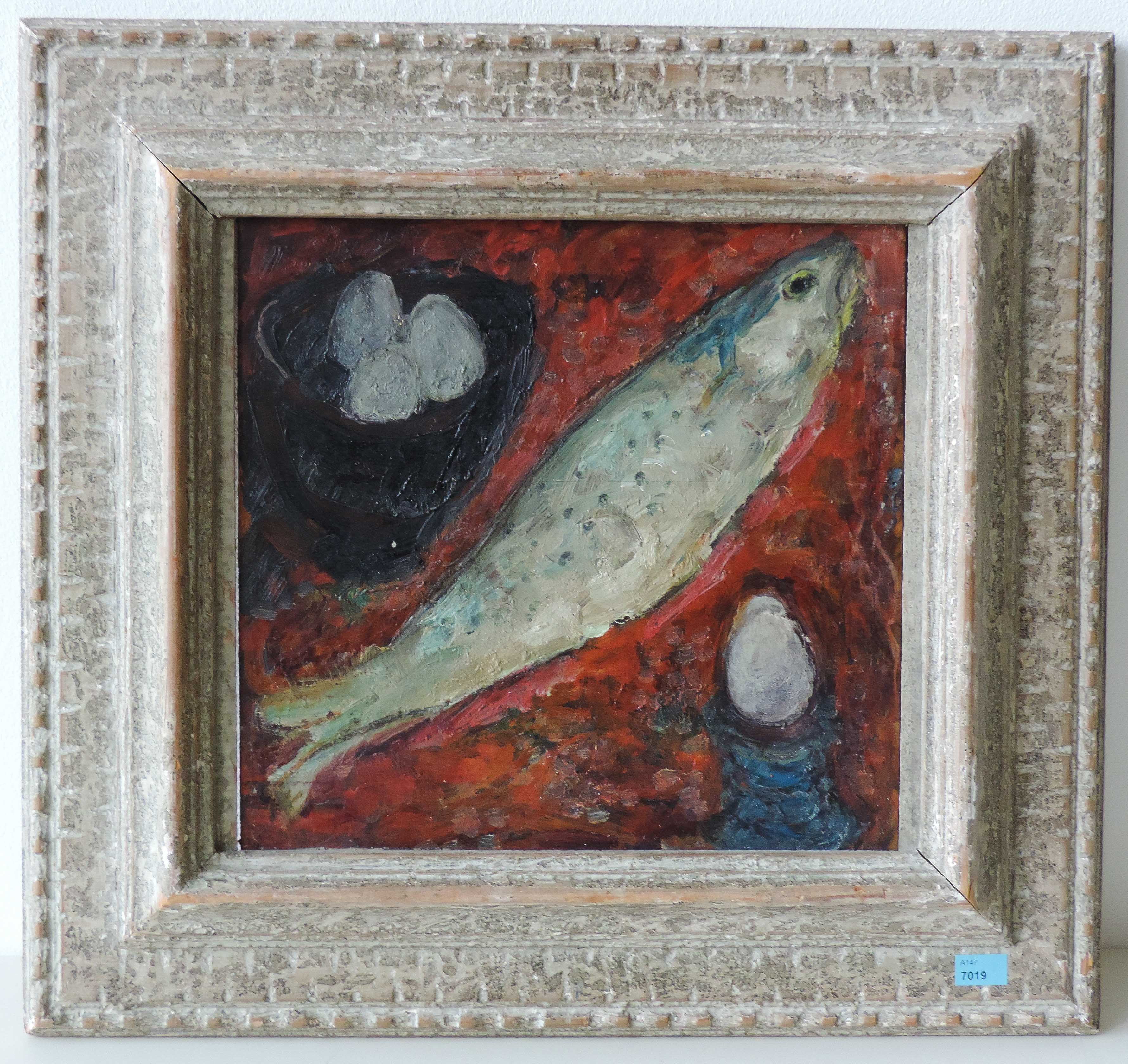 Stillleben mit Forelle. Öl auf Holz. Verso signiert. 31,5x31 cm.