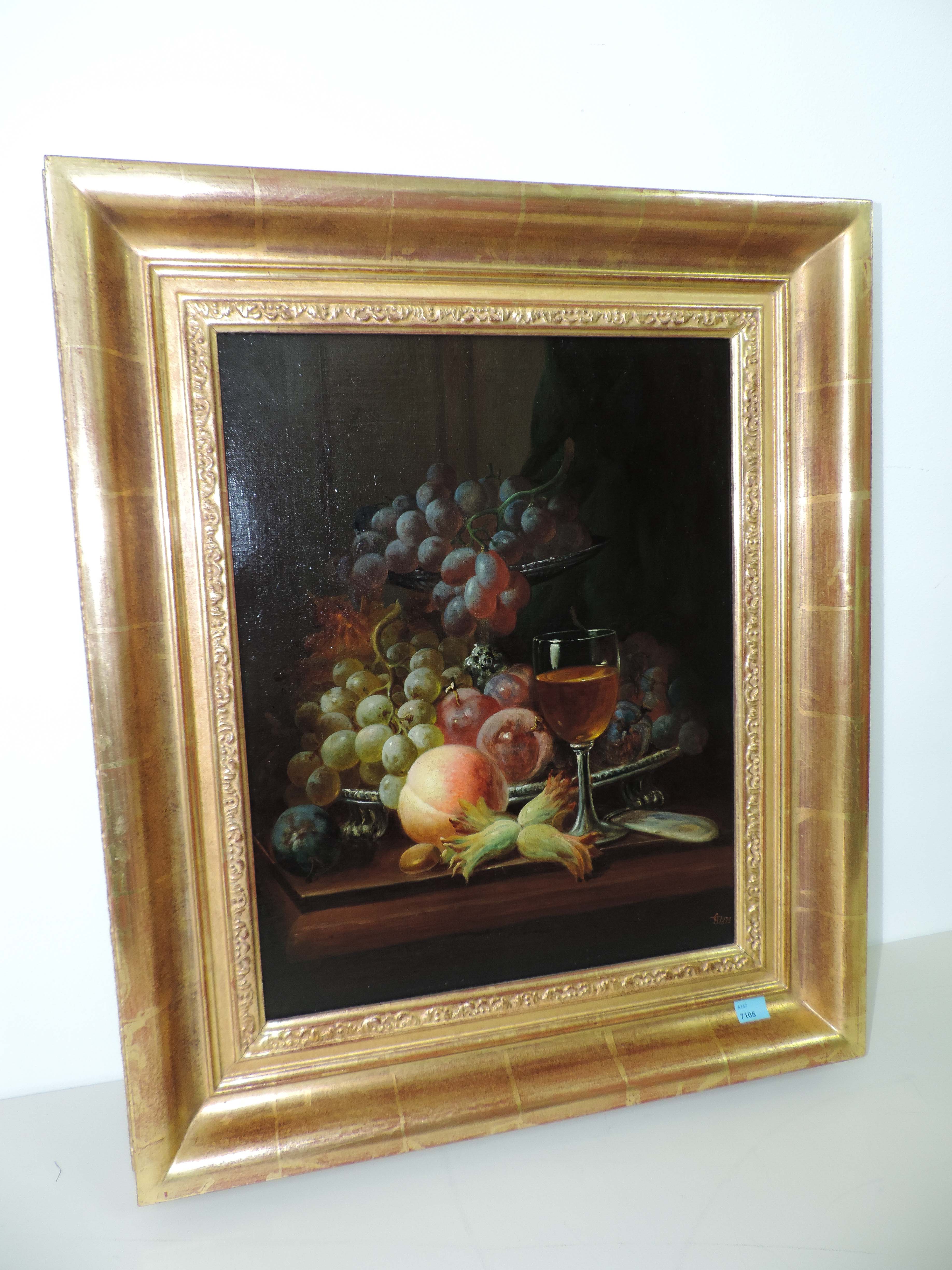 Stilleben mit Trauben, Pflaumen und Haselnüssen. 1875. Öl auf Leinwand über Karton. Unten rechts monogrammiert und datiert. 45,7x35,5 cm.