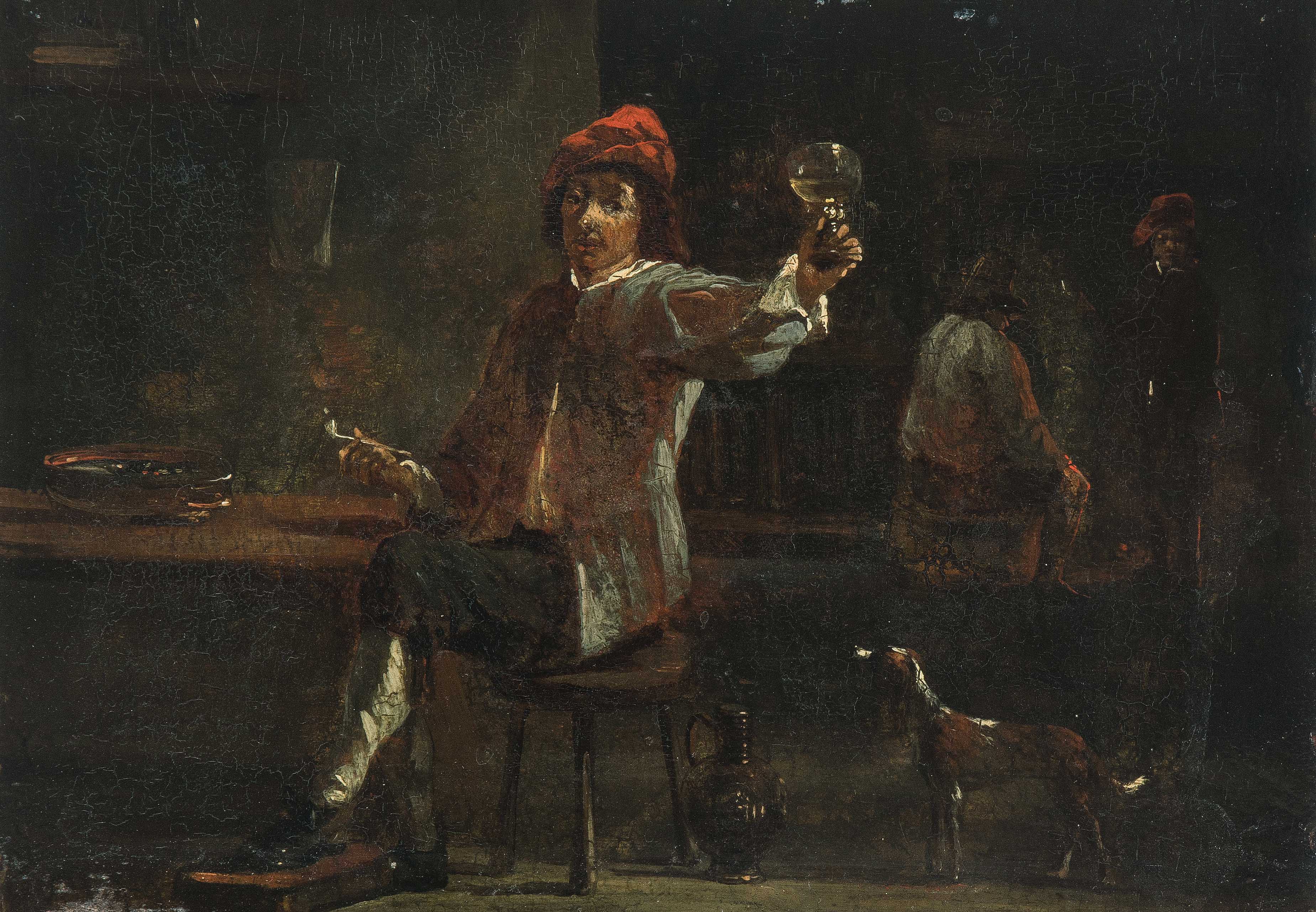Trinker in einer Taverne. Öl auf Holz. 16x21,4 cm.