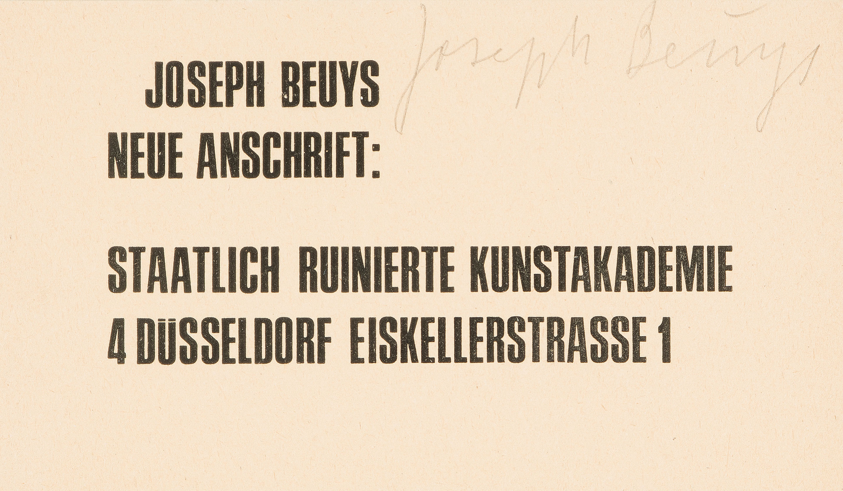 "Joseph Beuys Neue Anschrift: Staatlich ruinierte Kunstakademie 4 Düsseldorf Eiskellerstrasse 1". 1973. Buchdruck auf Pappe. Eines von 300 Exemplaren. Oben rechts in Bleistift signiert. Kartongrösse 12x20,5 cm. Gerahmt.