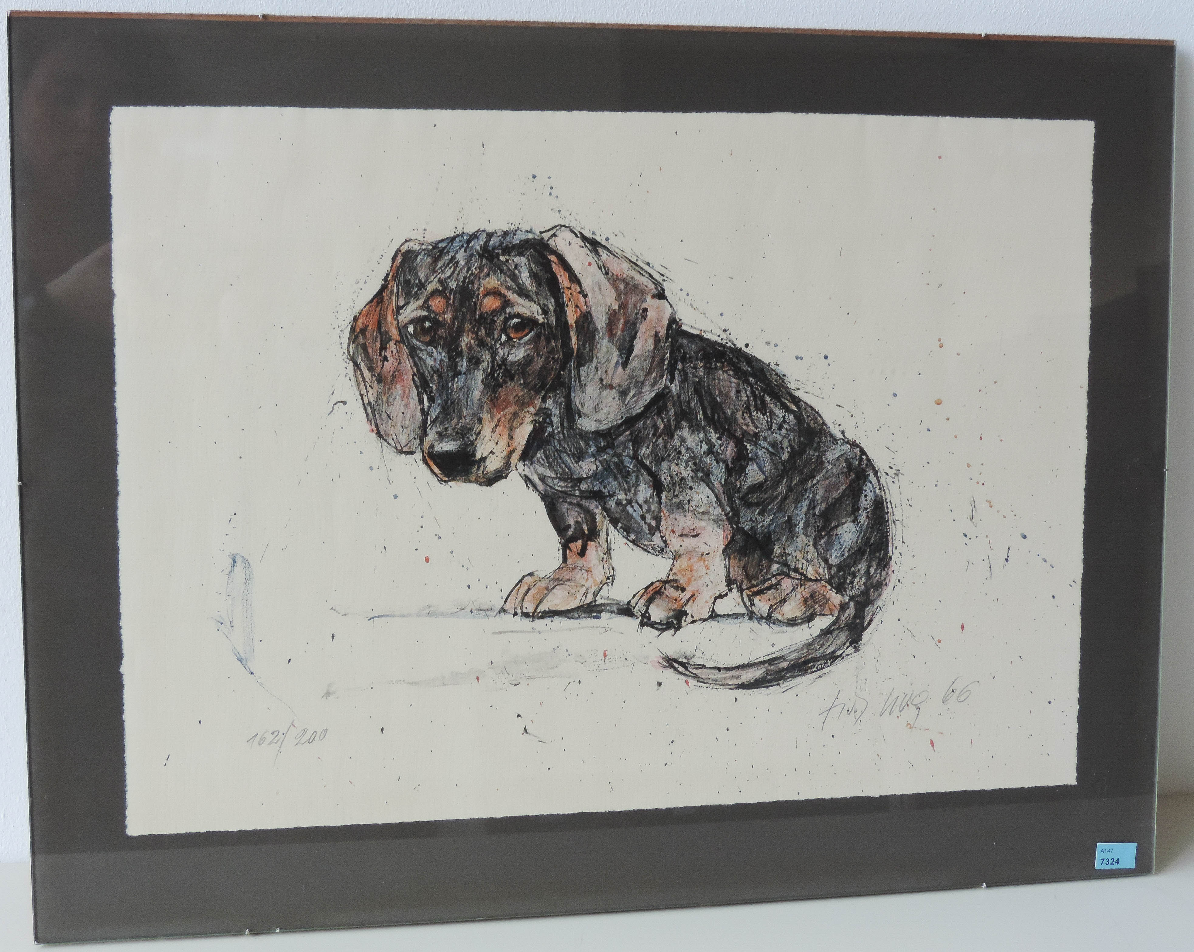 Dackel. 1966. Farblithographie. 162/200. Unten rechts signiert und datiert. Blattgrösse 38x54 cm. Gerahmt.