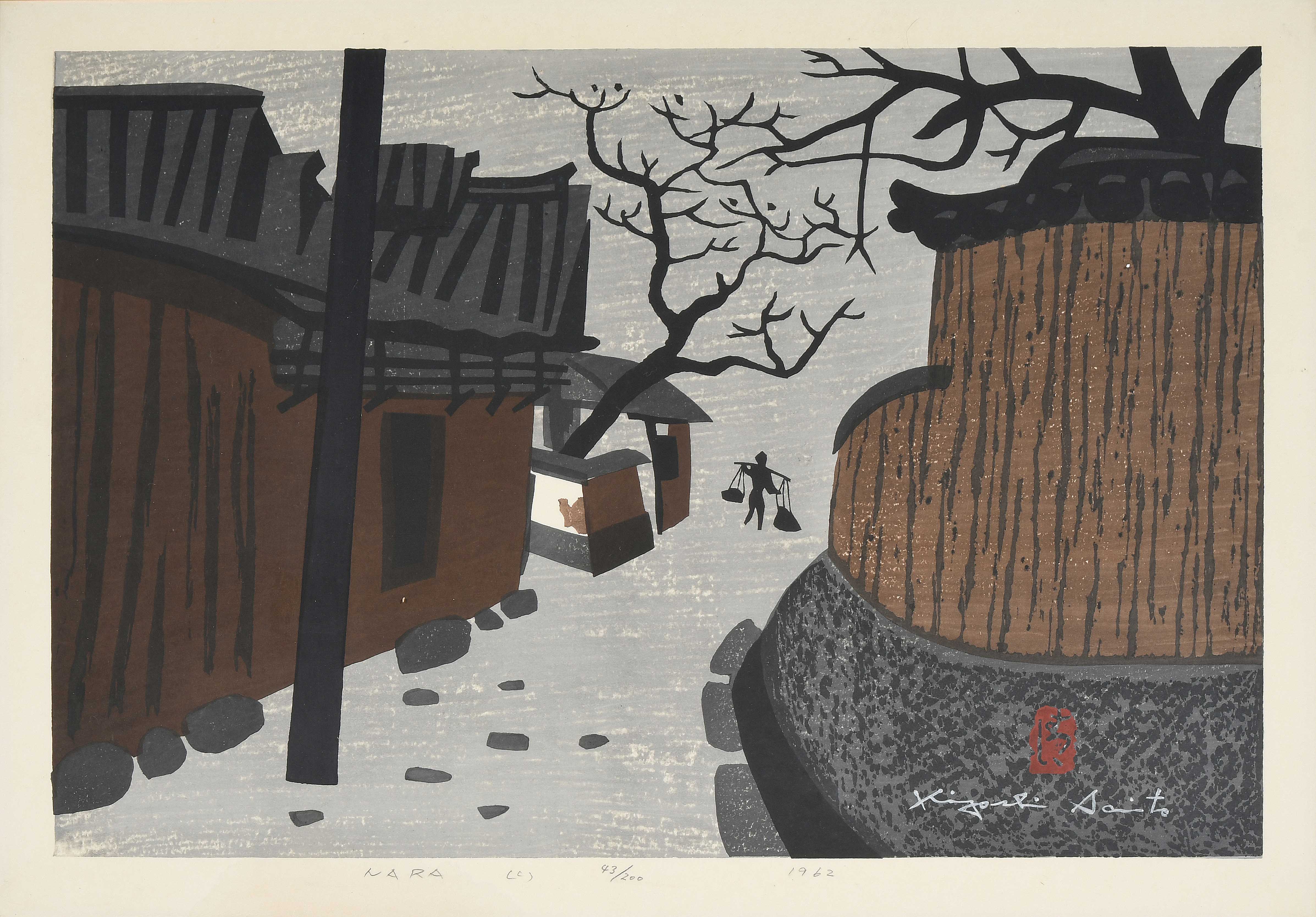Farbholzschnitt. Nara (c). Signiert. Betitelt und nummeriert 43/200, datiert 1962 in Bleistift. Mit Wasserzeichen. 43x59 cm. Gerahmt.