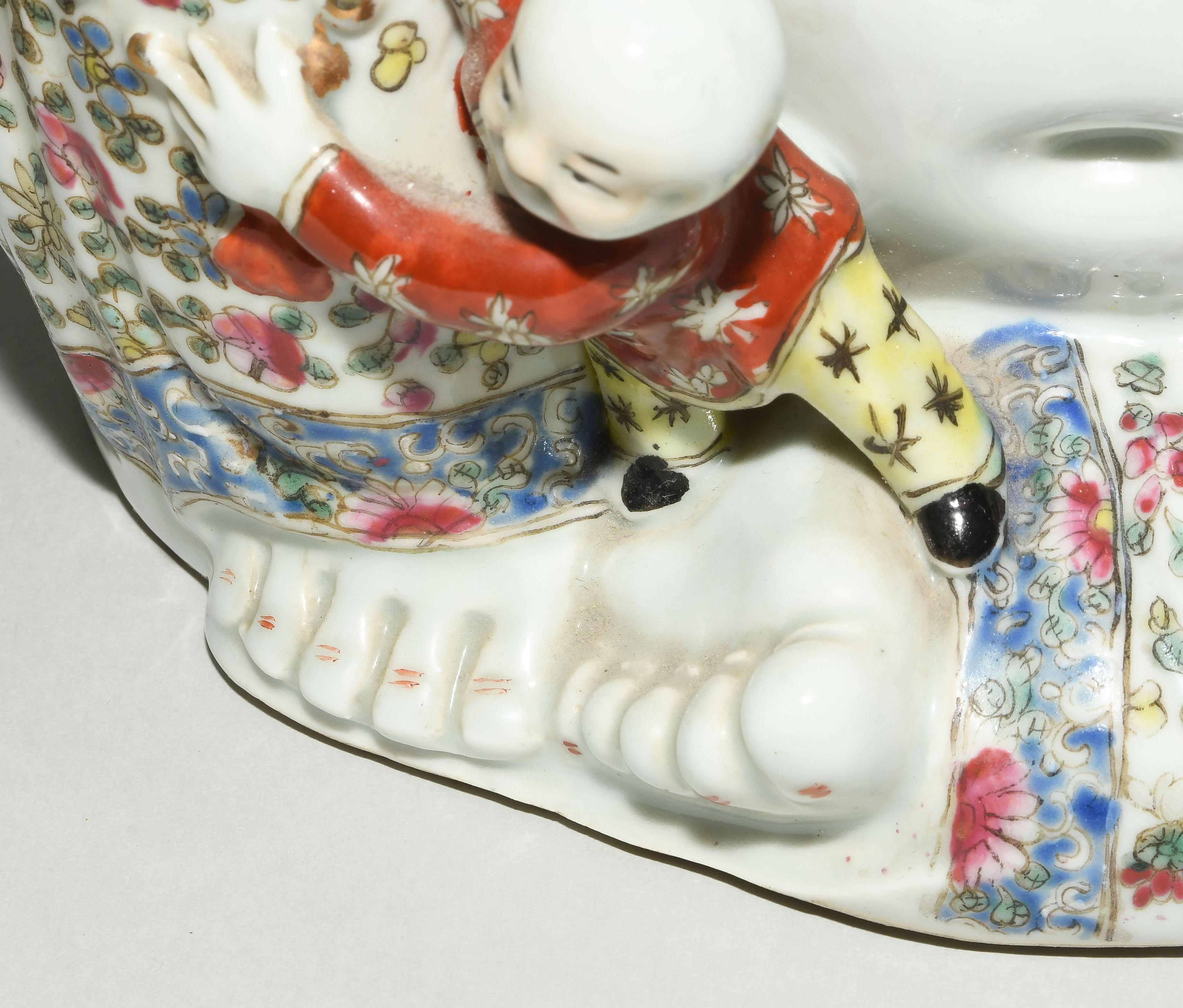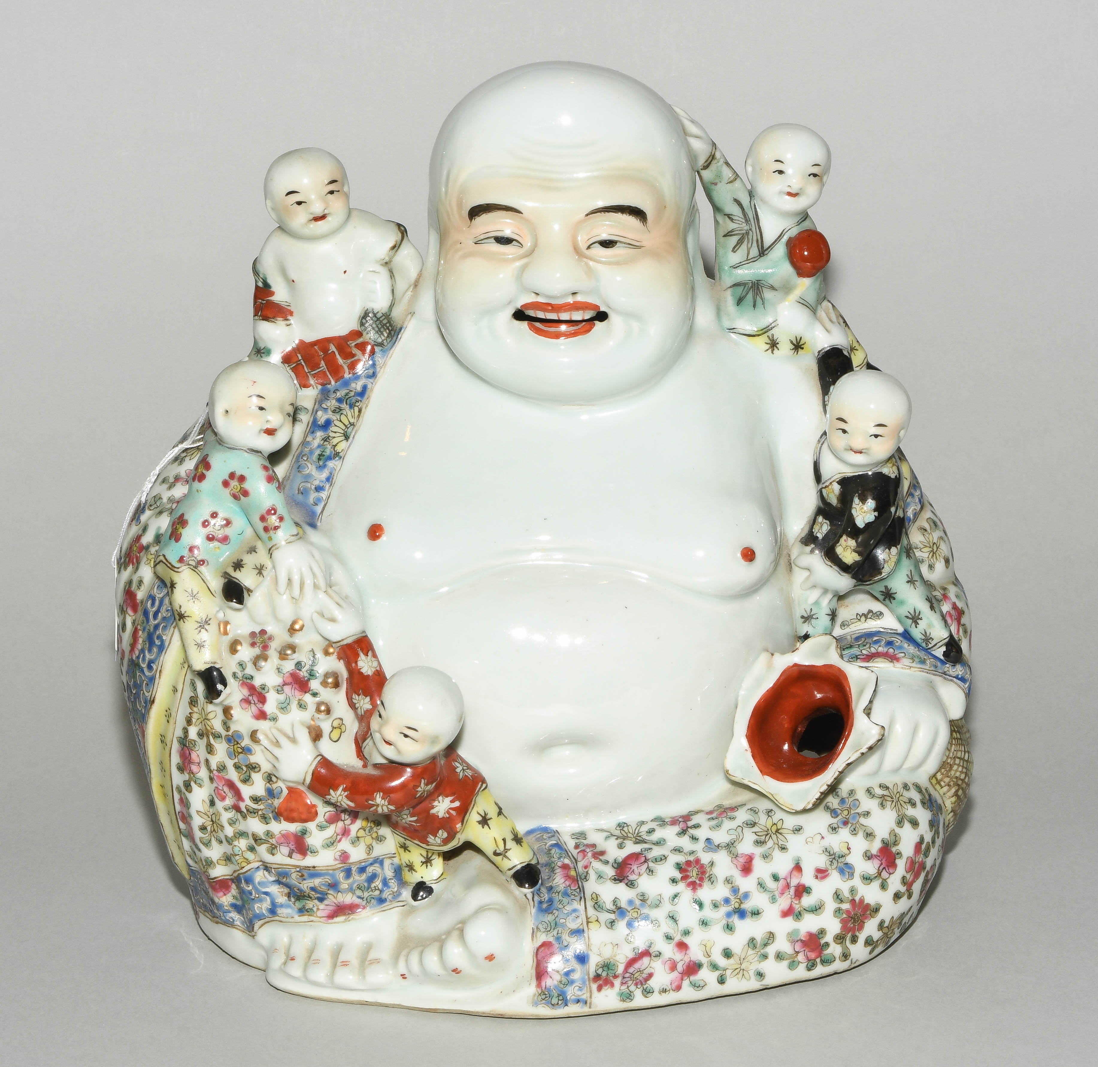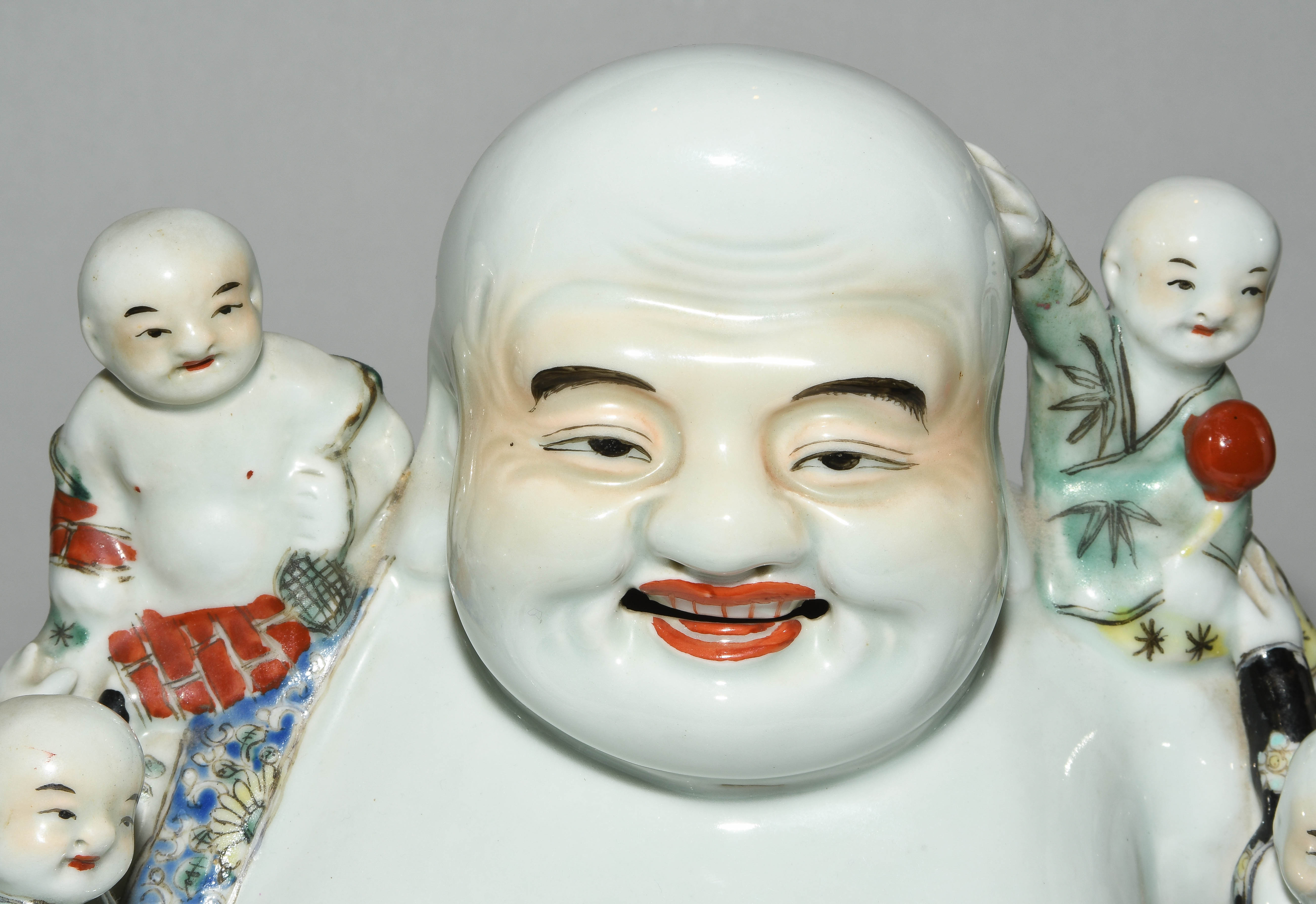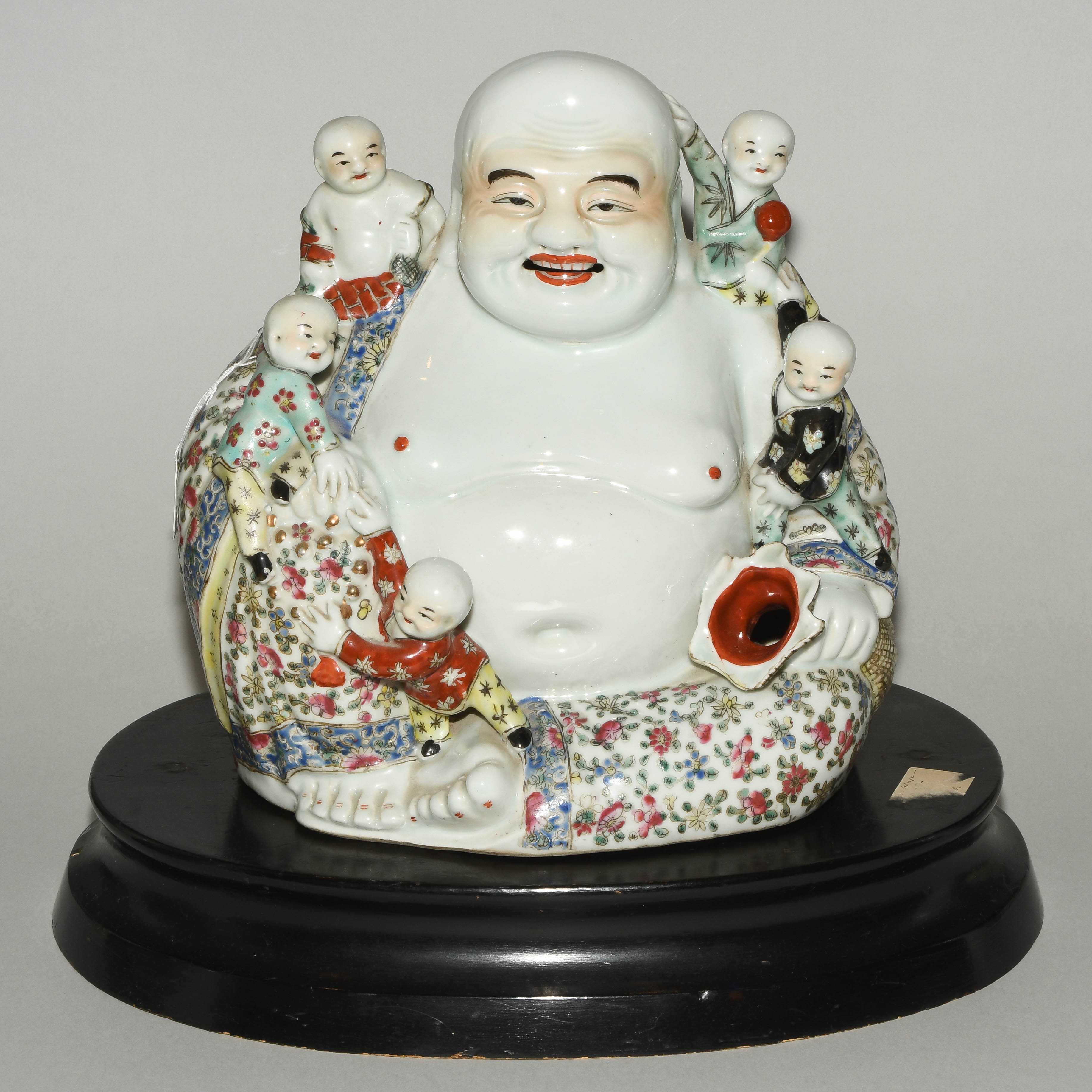 China, 20.Jh. Porzellan. Sitzender, herzhaft lachender Budai bemalt in den Farben der Famille Rose, umgeben von fünf Jungen. Boden mit Prägemarke. H 26 cm. Mit Holzstand.