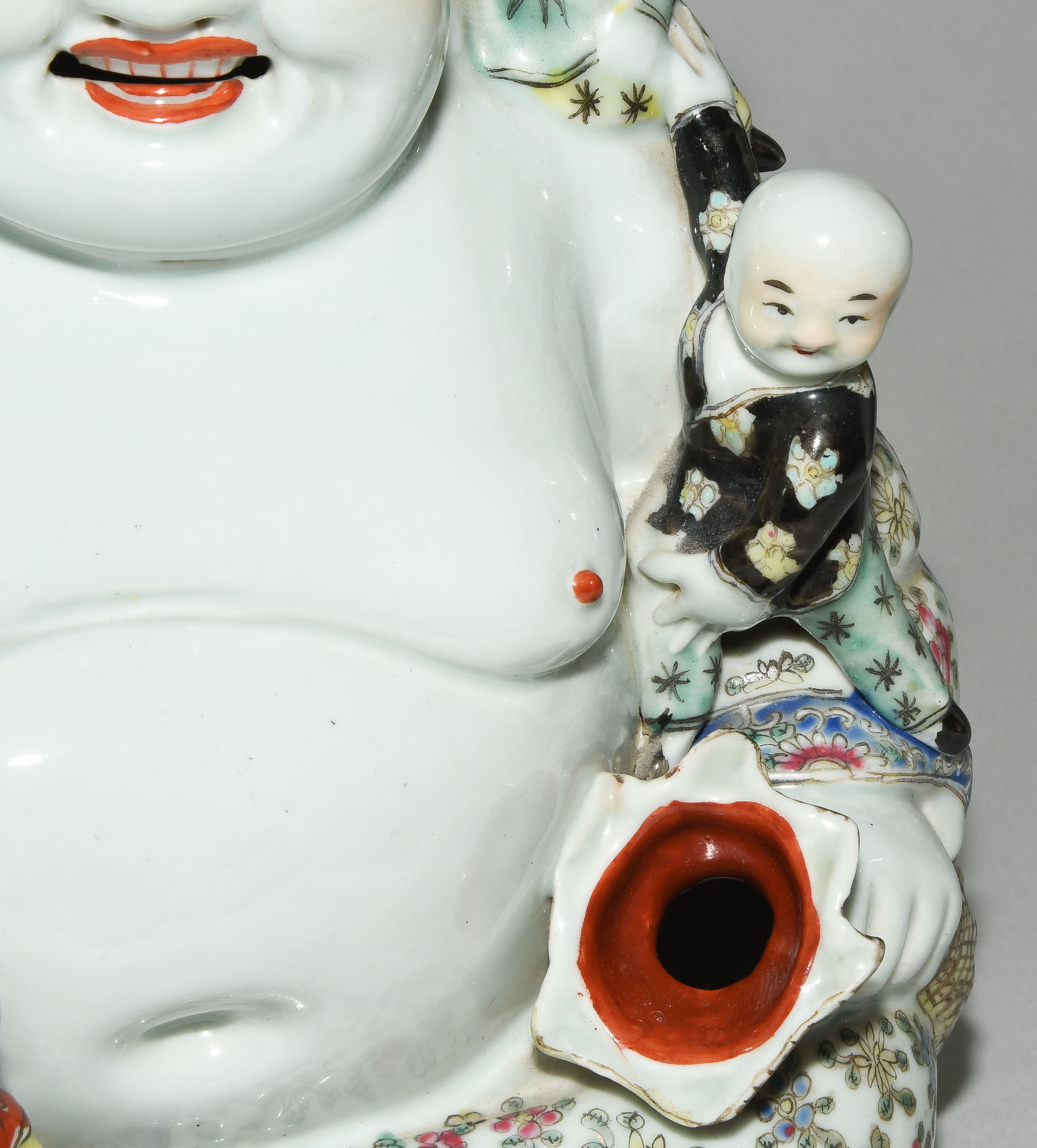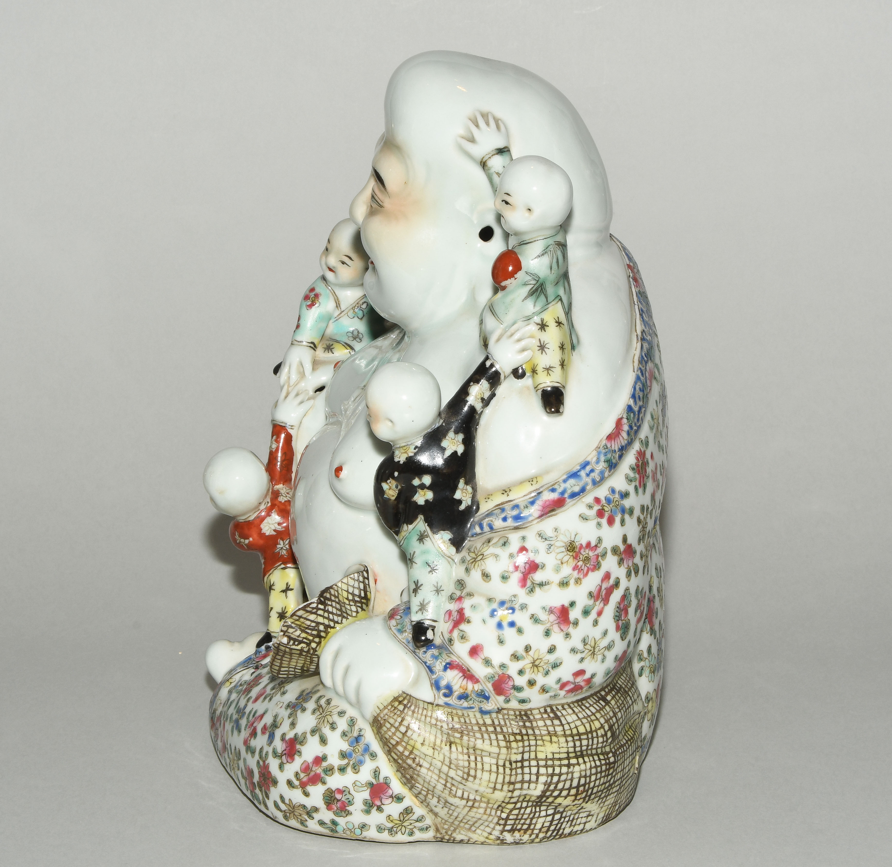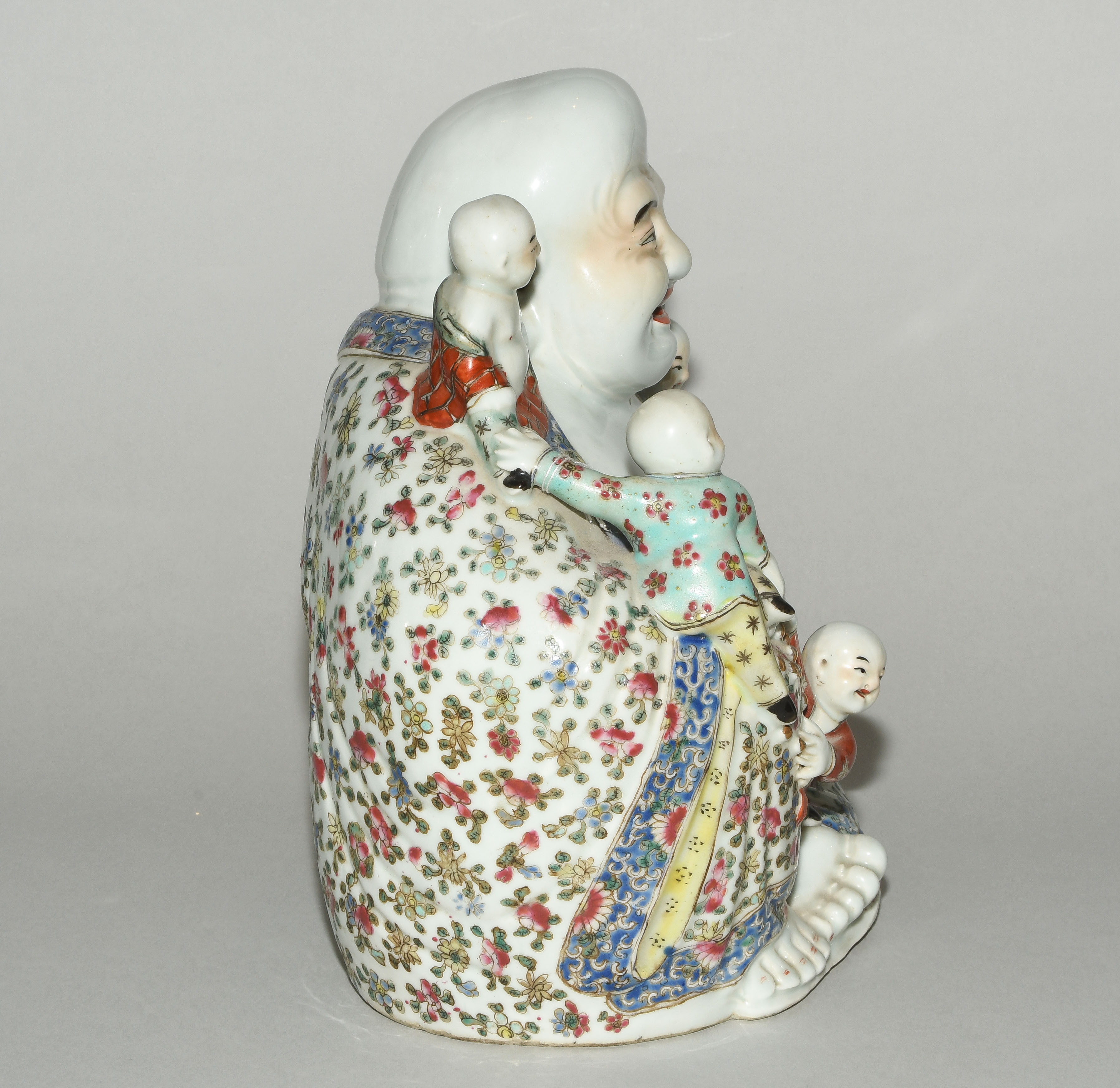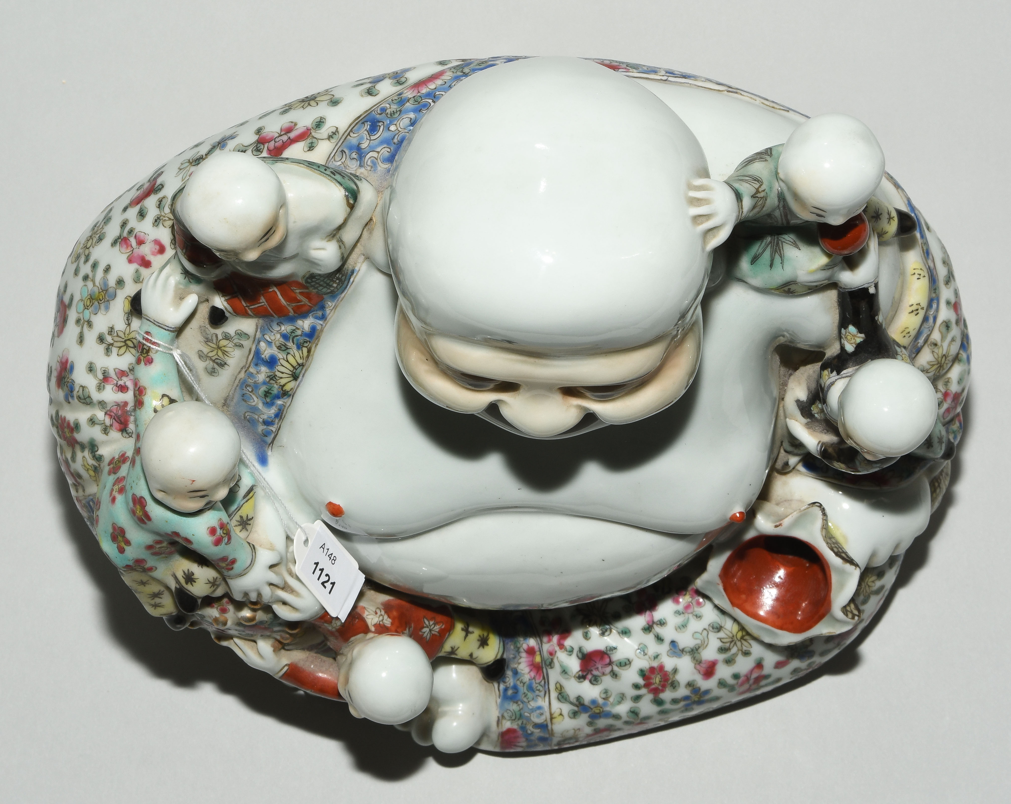 China, 20.Jh. Porzellan. Sitzender, herzhaft lachender Budai bemalt in den Farben der Famille Rose, umgeben von fünf Jungen. Boden mit Prägemarke. H 26 cm. Mit Holzstand.