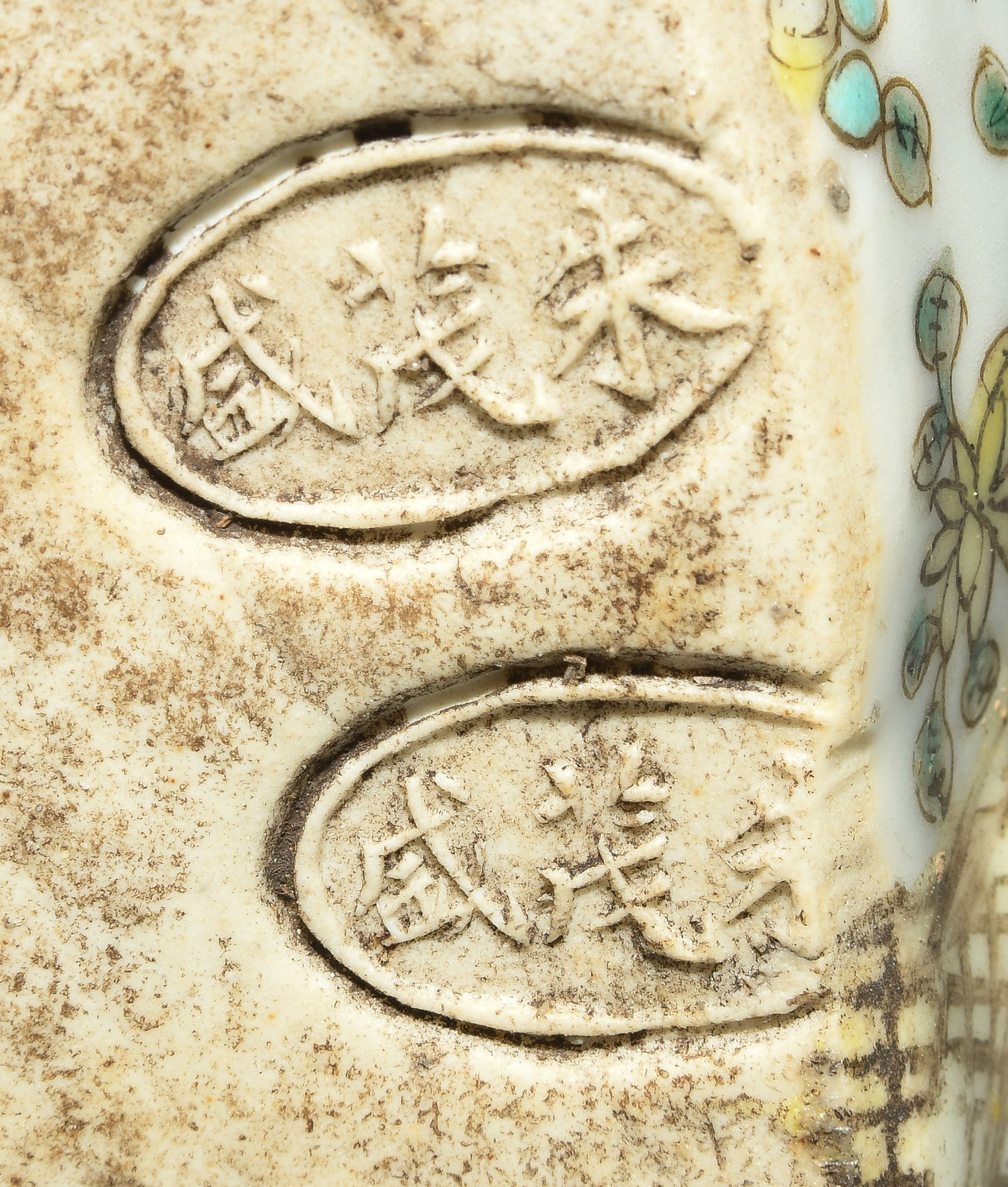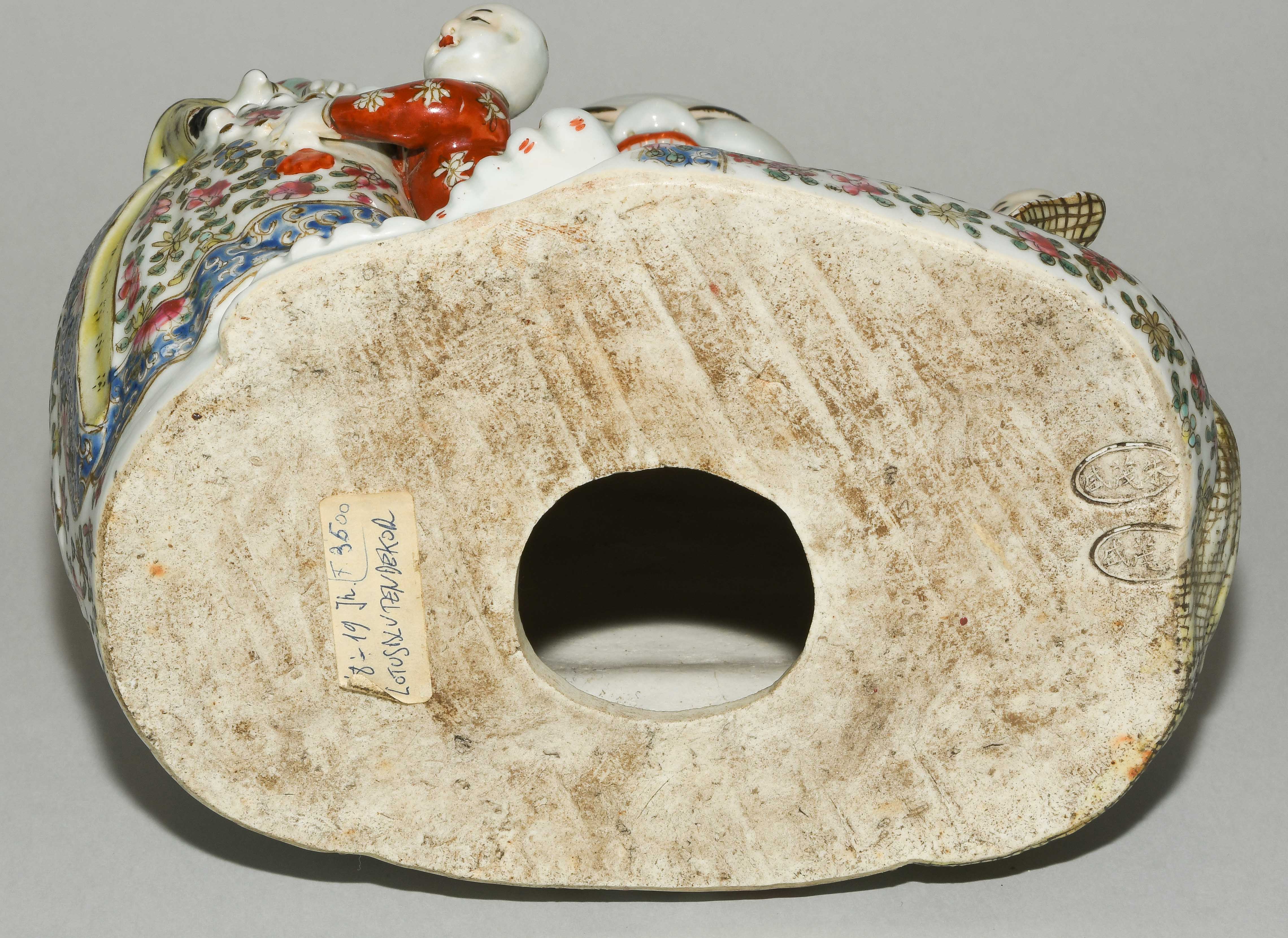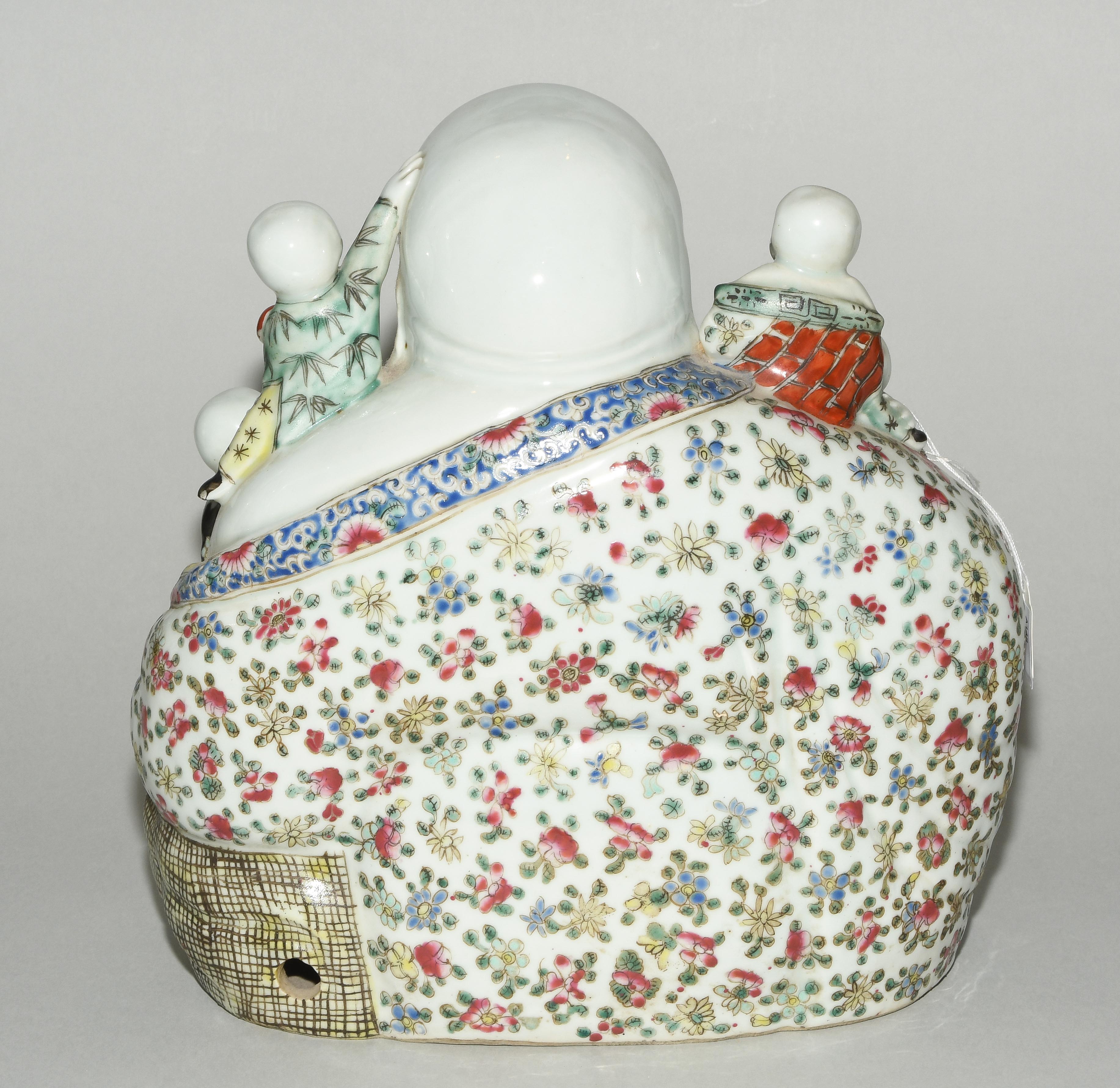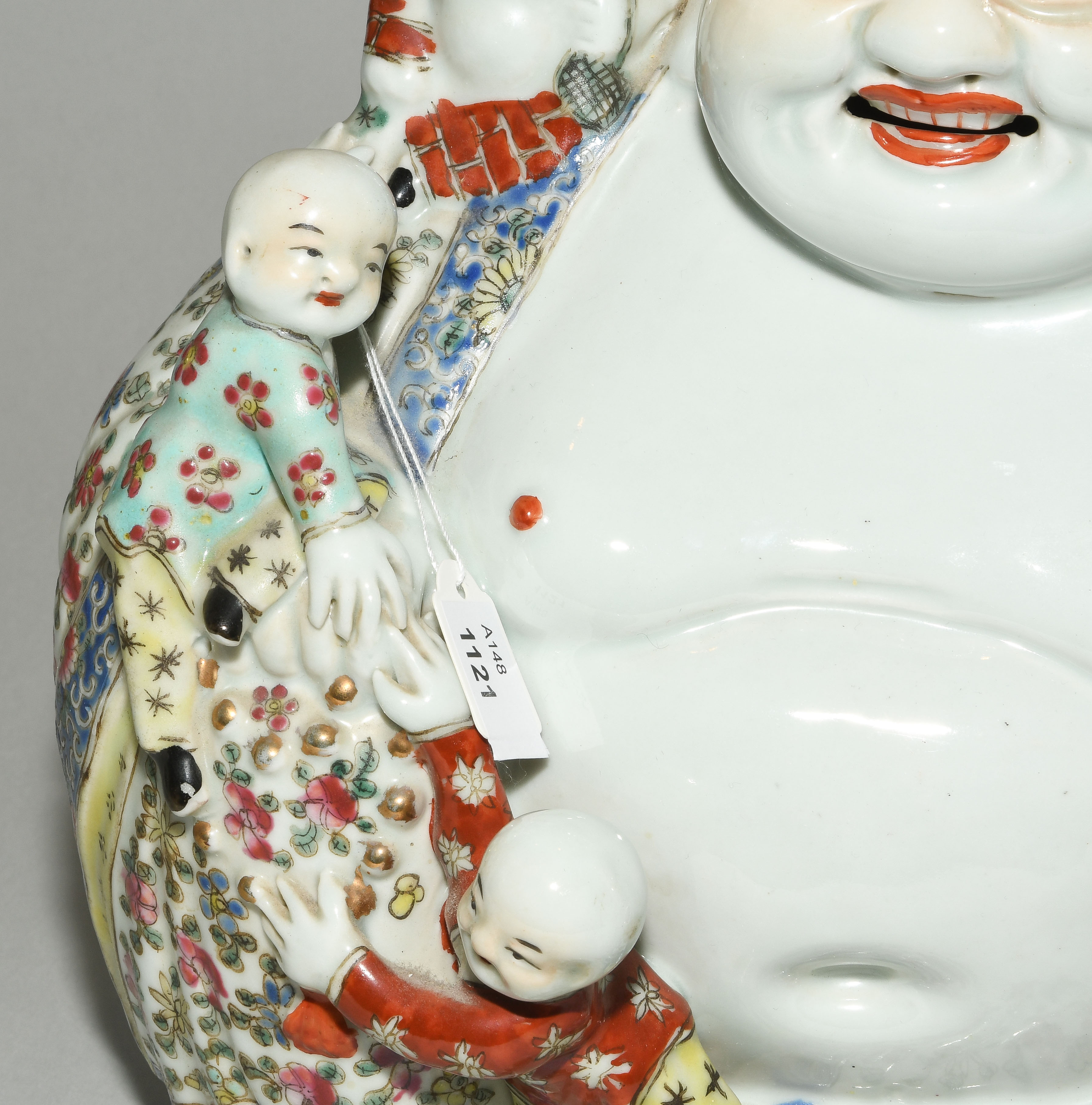 China, 20.Jh. Porzellan. Sitzender, herzhaft lachender Budai bemalt in den Farben der Famille Rose, umgeben von fünf Jungen. Boden mit Prägemarke. H 26 cm. Mit Holzstand.