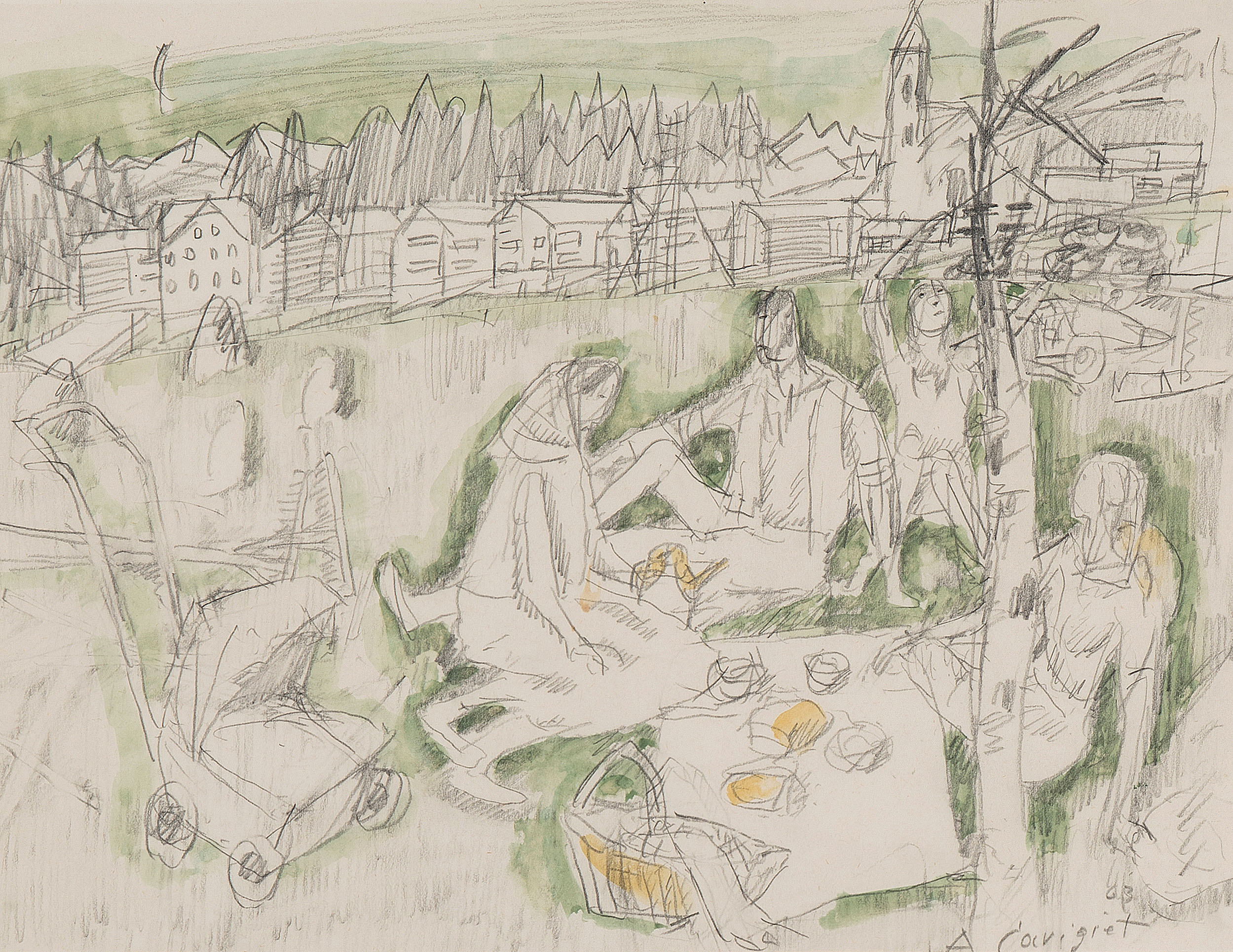 Das Picknick. 1963. Aquarellierte Bleistiftzeichnung auf zwei übereinander gelegten Papieren. Unten rechts in Bleistift signiert und datiert. Blattgrösse 24,6x31,9 cm. -Blatt minimst gebräunt. Hellerer Lichtrand. Ränder und Ecken leicht bestossen. Im Baum und am oberen Rand winziges Einstichloch. Verso am oberen Rand an Rückwand montiert.