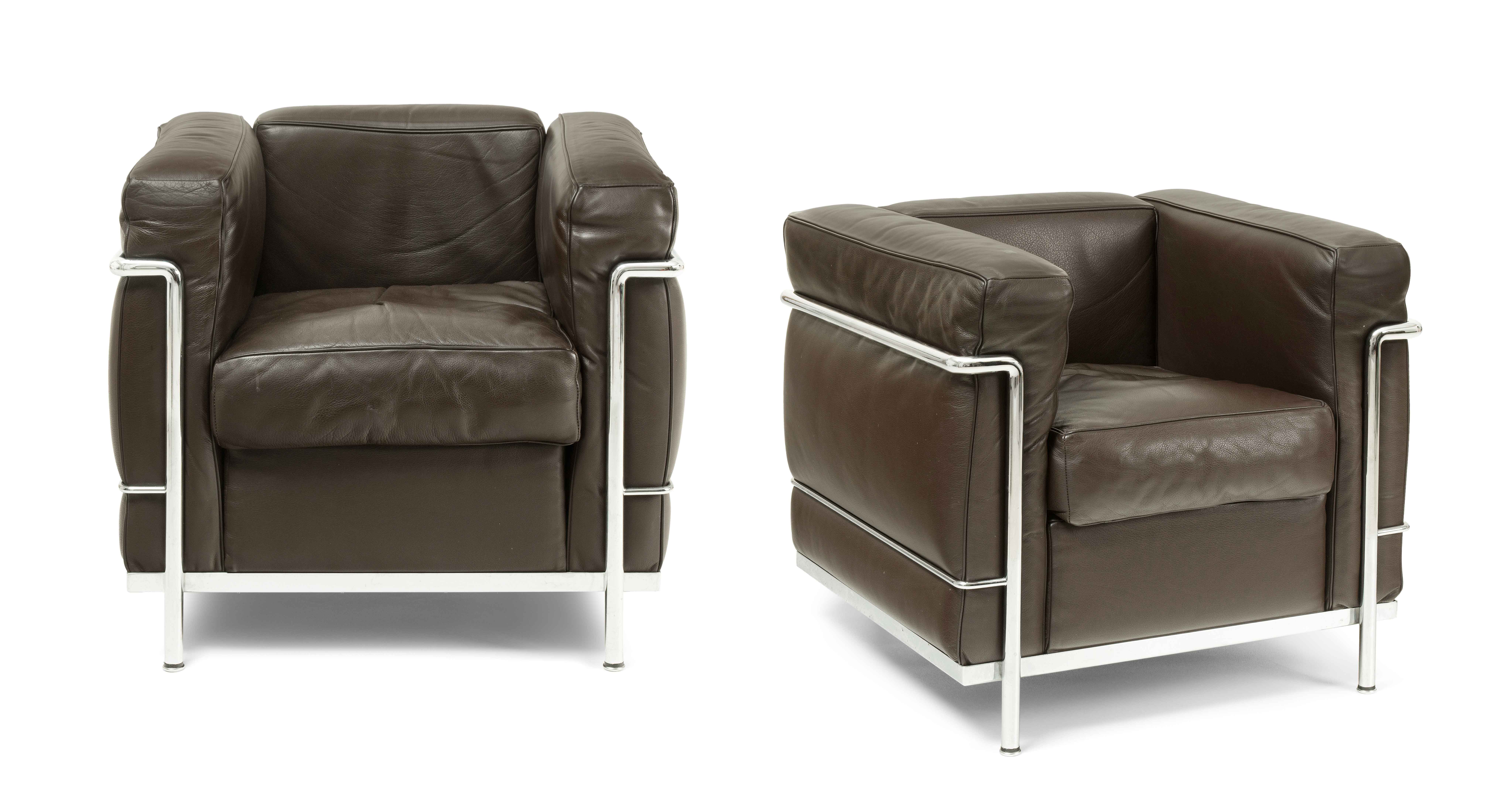 Ein Paar Sessel Grand Confort LC2. Entwurf 1928. Cassina Ausführung. Seriennummer und Hersteller Prägung. Chromstahl und Lederbezug, dunkelbraun. Gebrauchsspuren. Guter Zustand. 76x70x68 cm.
