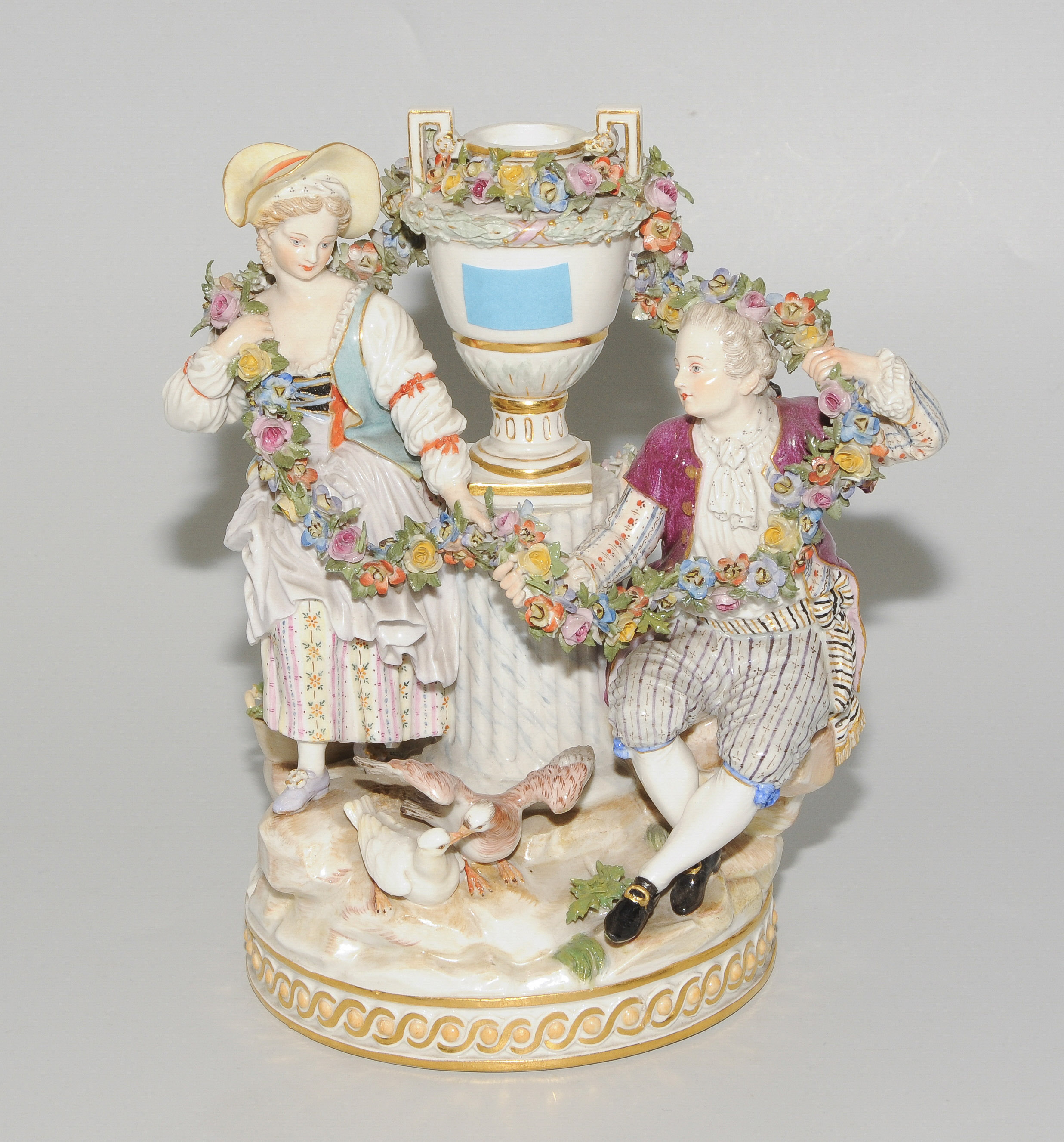 Meissen, um 1900. Modell von Michel Victor Acier, 1778. Porzellan, polychrom bemalt mit Goldstaffierungen. Liebesgruppe auf rundem Terrainsockel. Modell-Nummer F 88. Bezeichnet: Schwertermarke. H 21 cm.