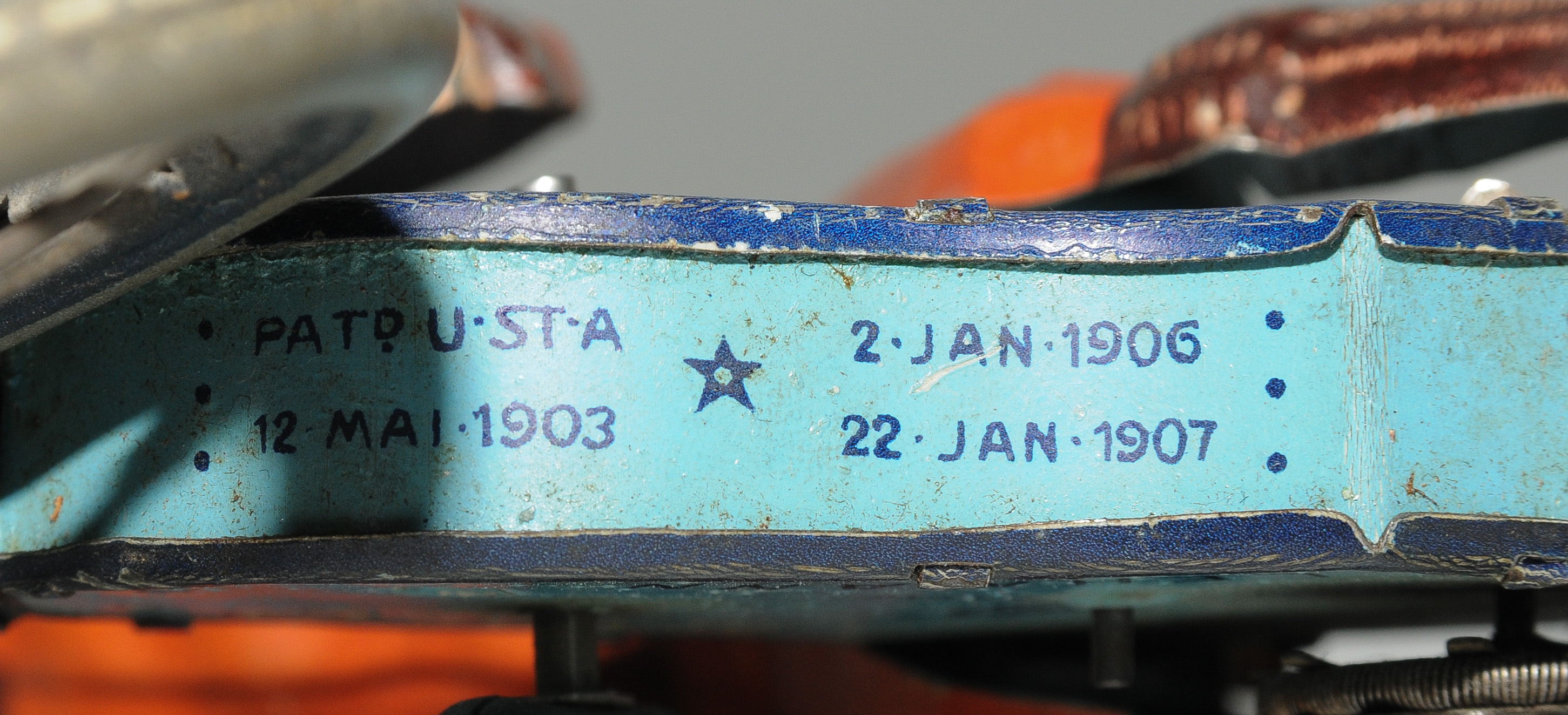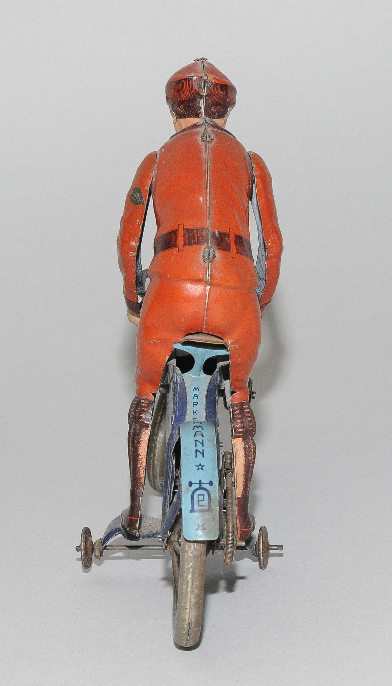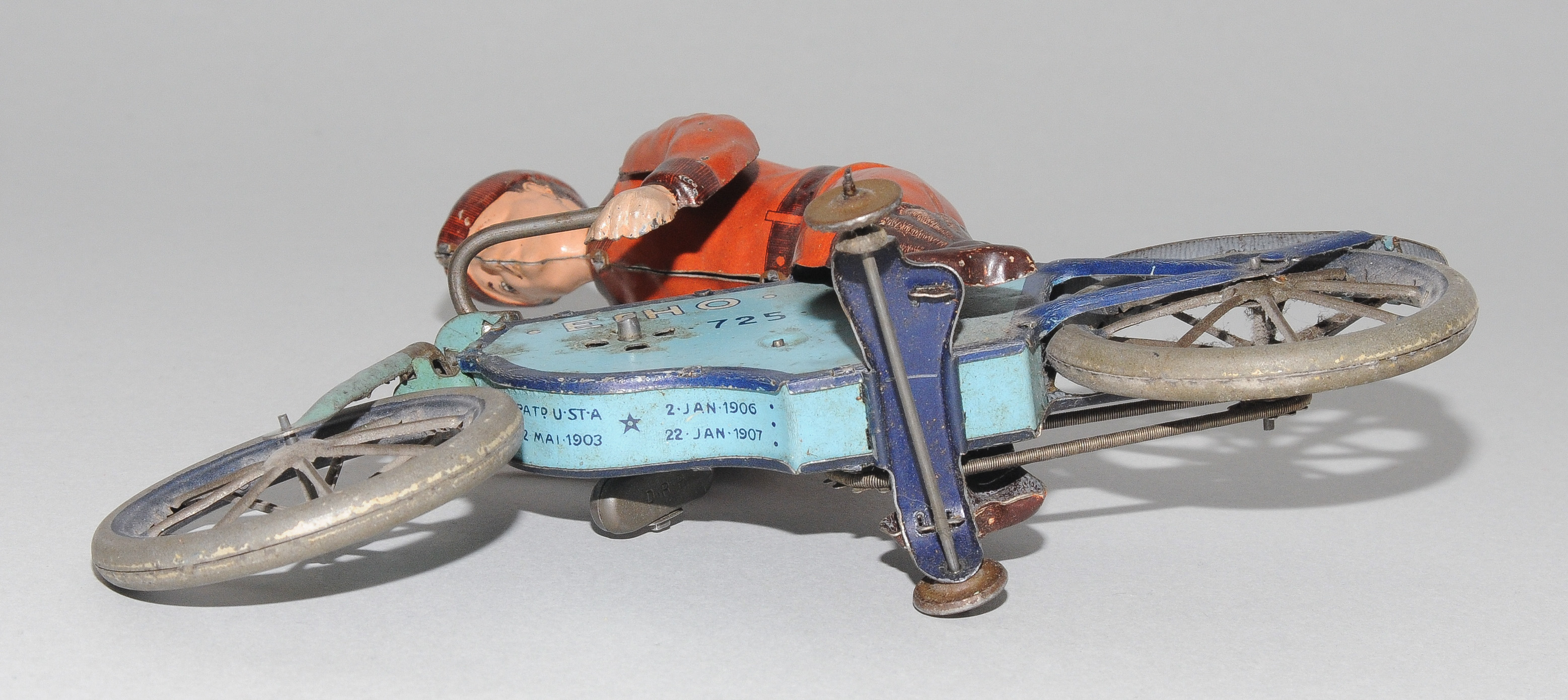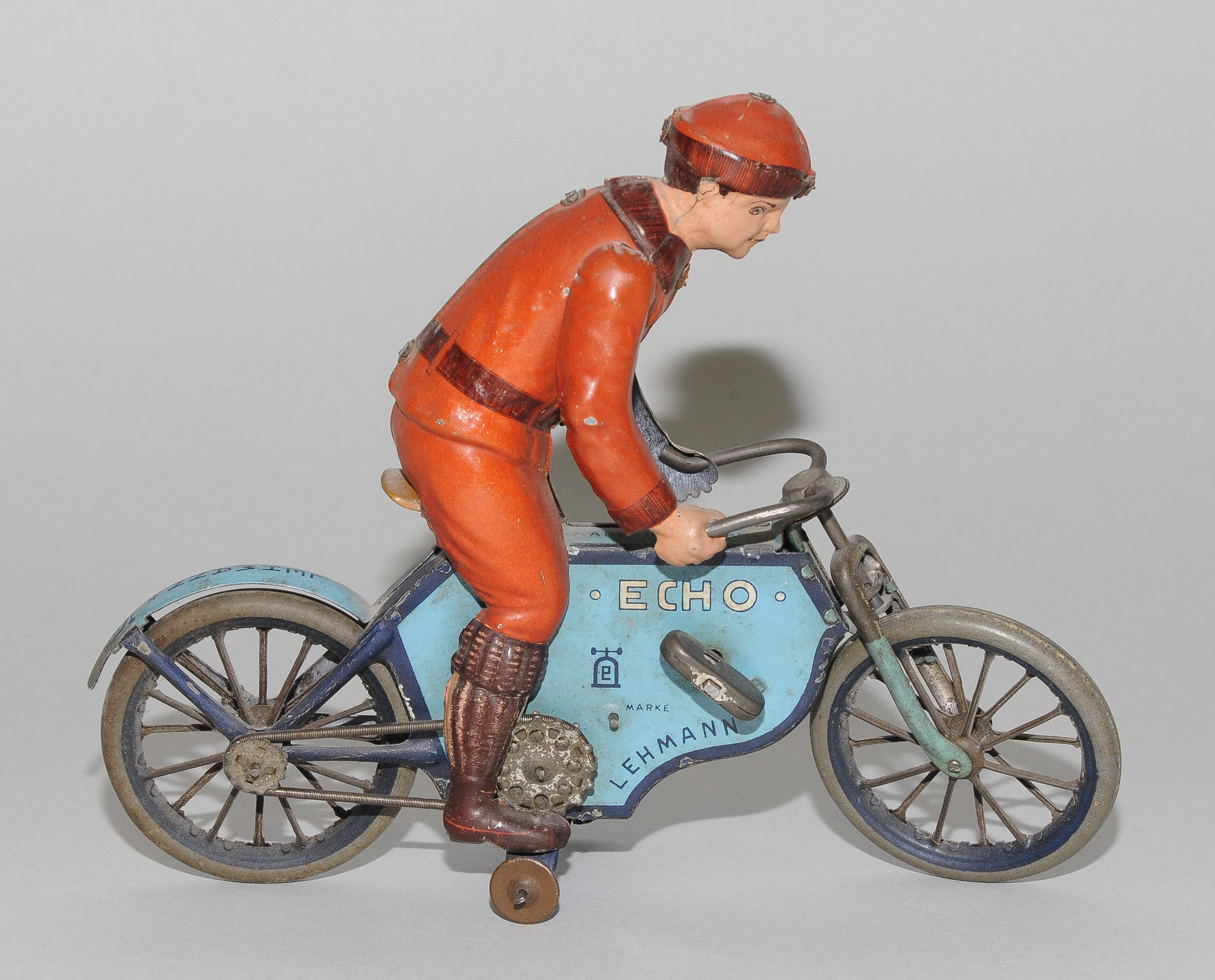 Deutschland, um 1920. Blech, farbig lithographiert. Blaues Motorrad "ECHO 725" mit Stützrädern. Fahrer in roter Kleidung. Uhrwerkantrieb. H 17,5 cm.