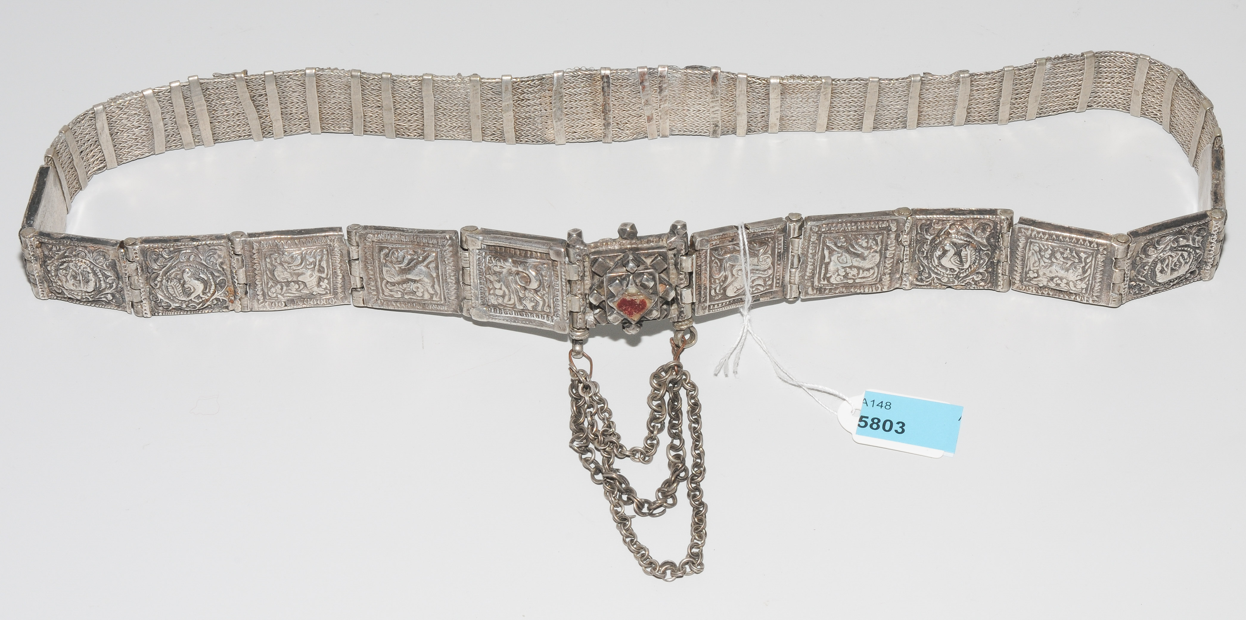 Südindien, 1.Hälfte 20.Jh. Silber. Gürtel aus Silberdrahtgeflecht und zwölf viereckigen Gliedern mit verschiedenen reliefierten Tierdarstellungen. L 72 cm, 292 g.