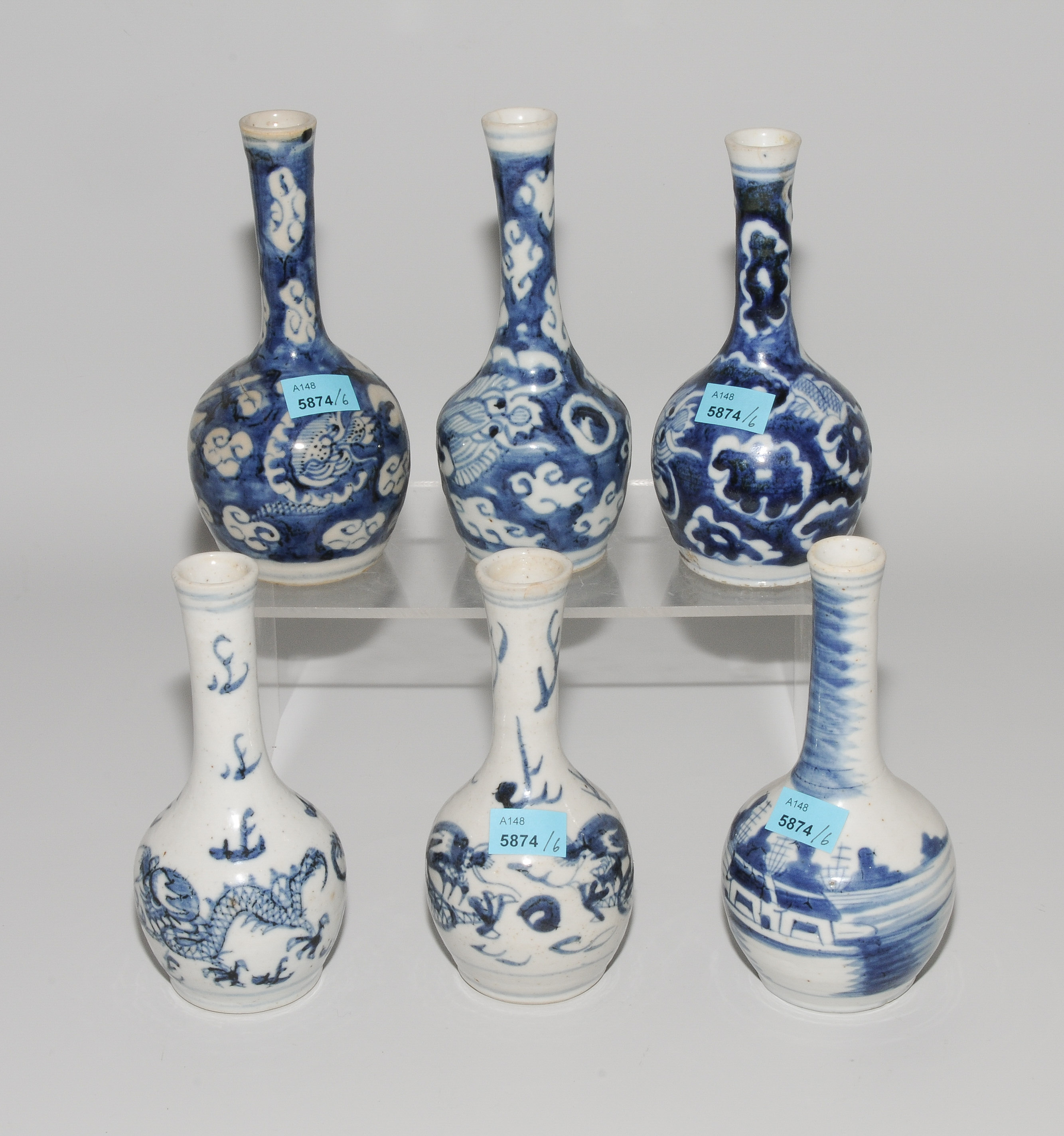 China, 18./19.Jh. Blau-Weiss-Porzellan. Fünf kleine Flaschenvasen mit Drachendekor und eine Vase mit Landschaftsdekor. H 15–16 cm.