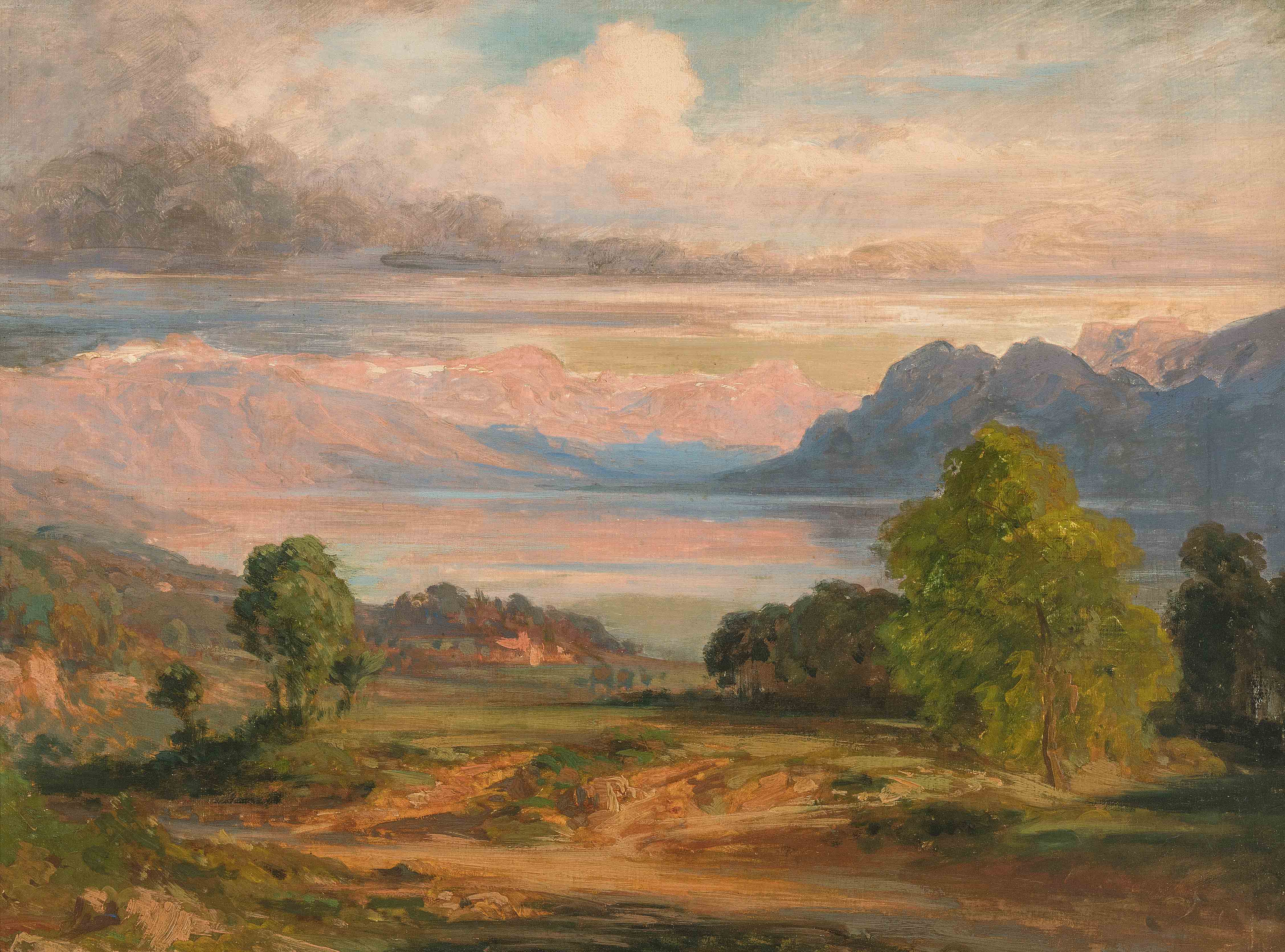 Landschaft am Genfersee mit Blick gegen das Wallis. Ölstudie auf Karton. Verso auf Etikett bezeichnet "Bernhard Fries". 45x60 cm.
