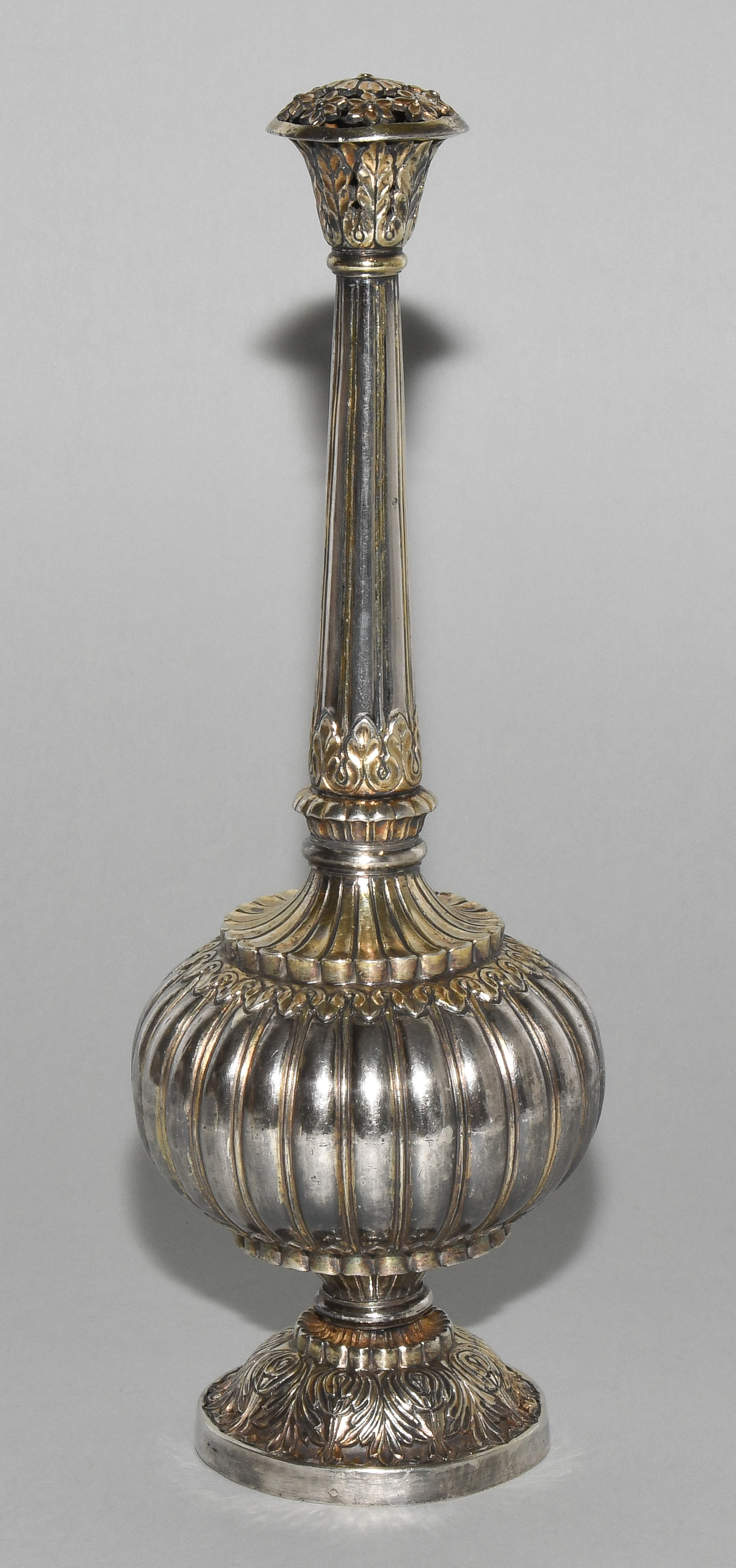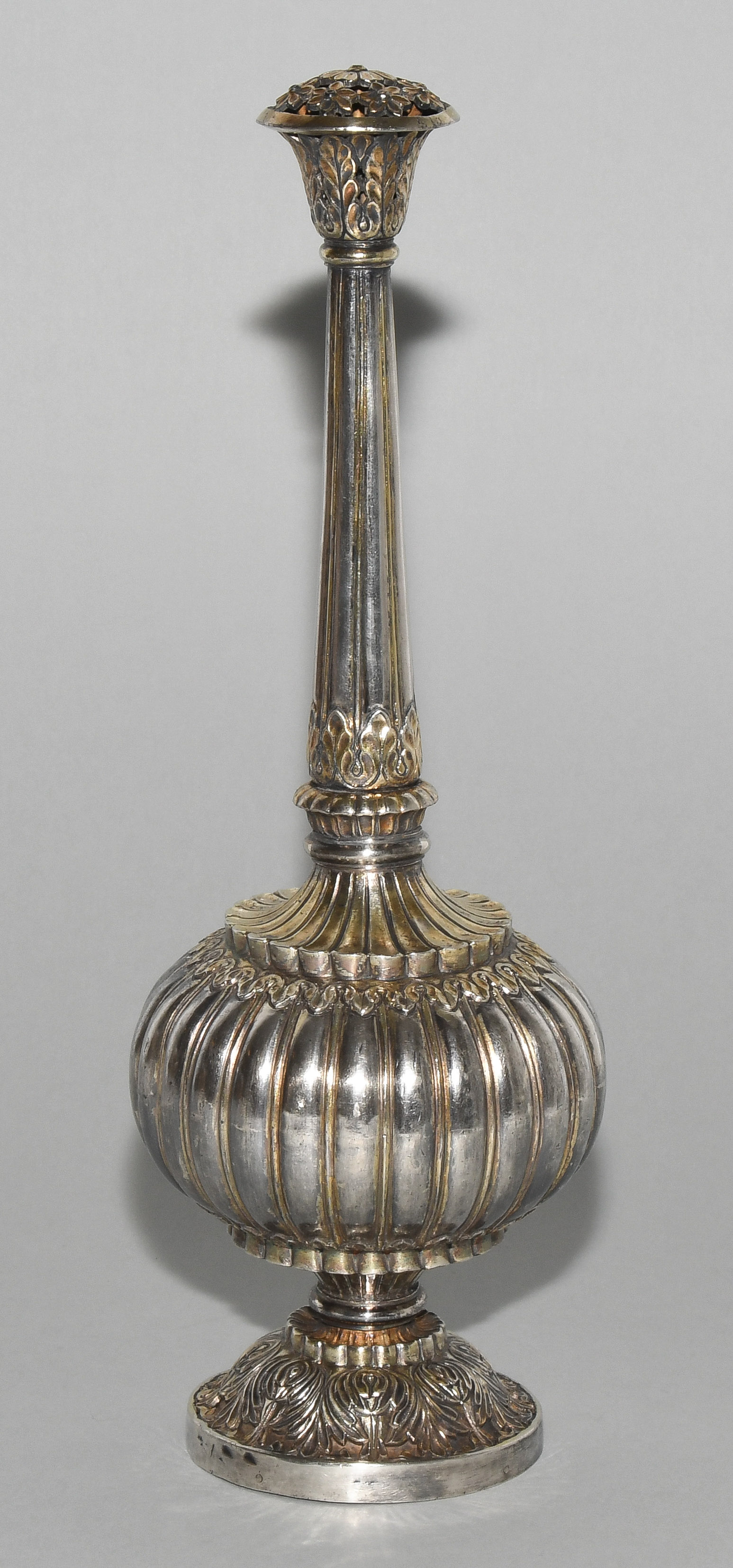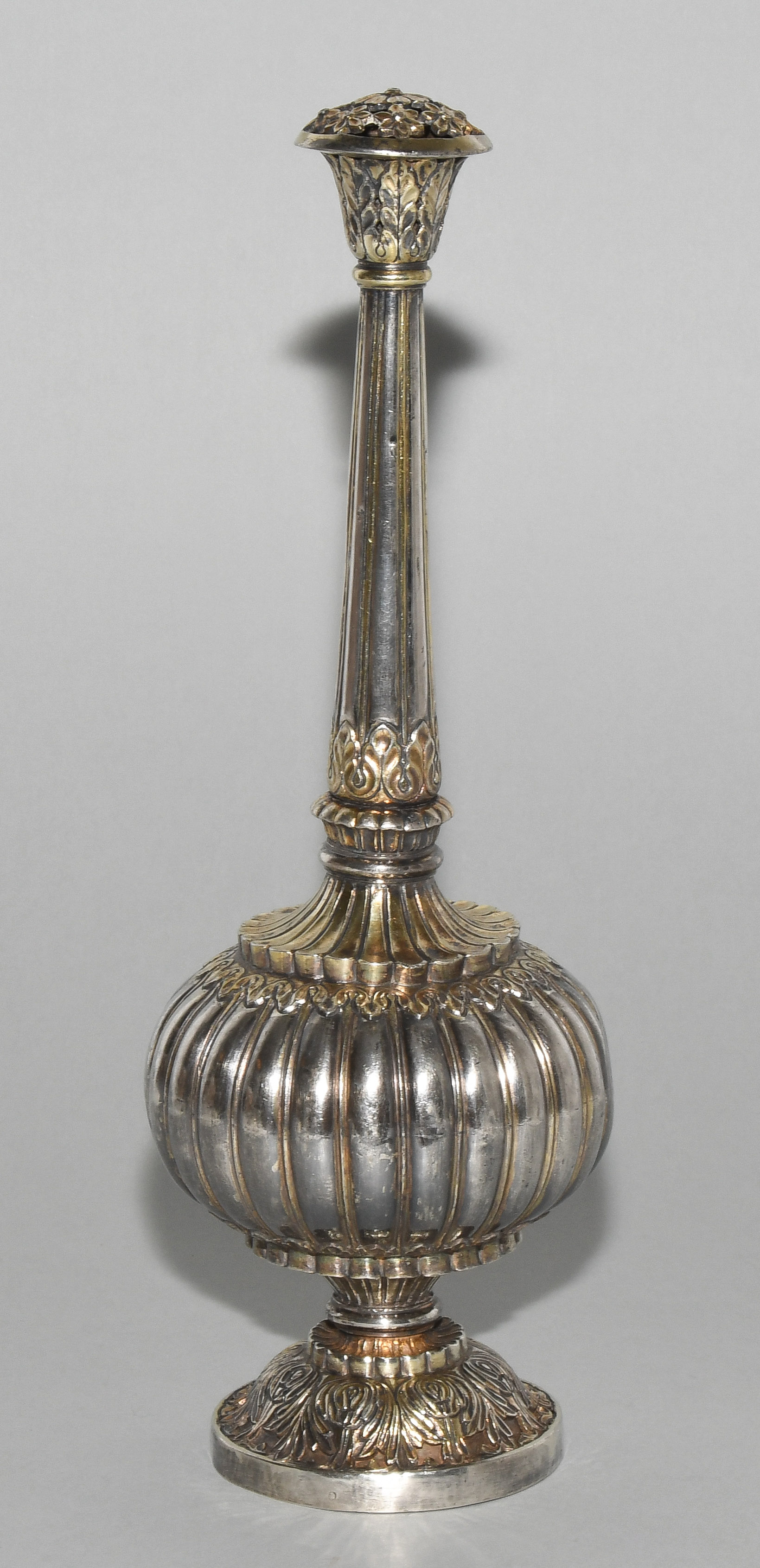 Indien, wohl 19.Jh. Silber mit Resten einer Teilvergoldung. Gerippte Wandung des Gefässkörpers. Floralderkor. H 29 cm, 569 g.