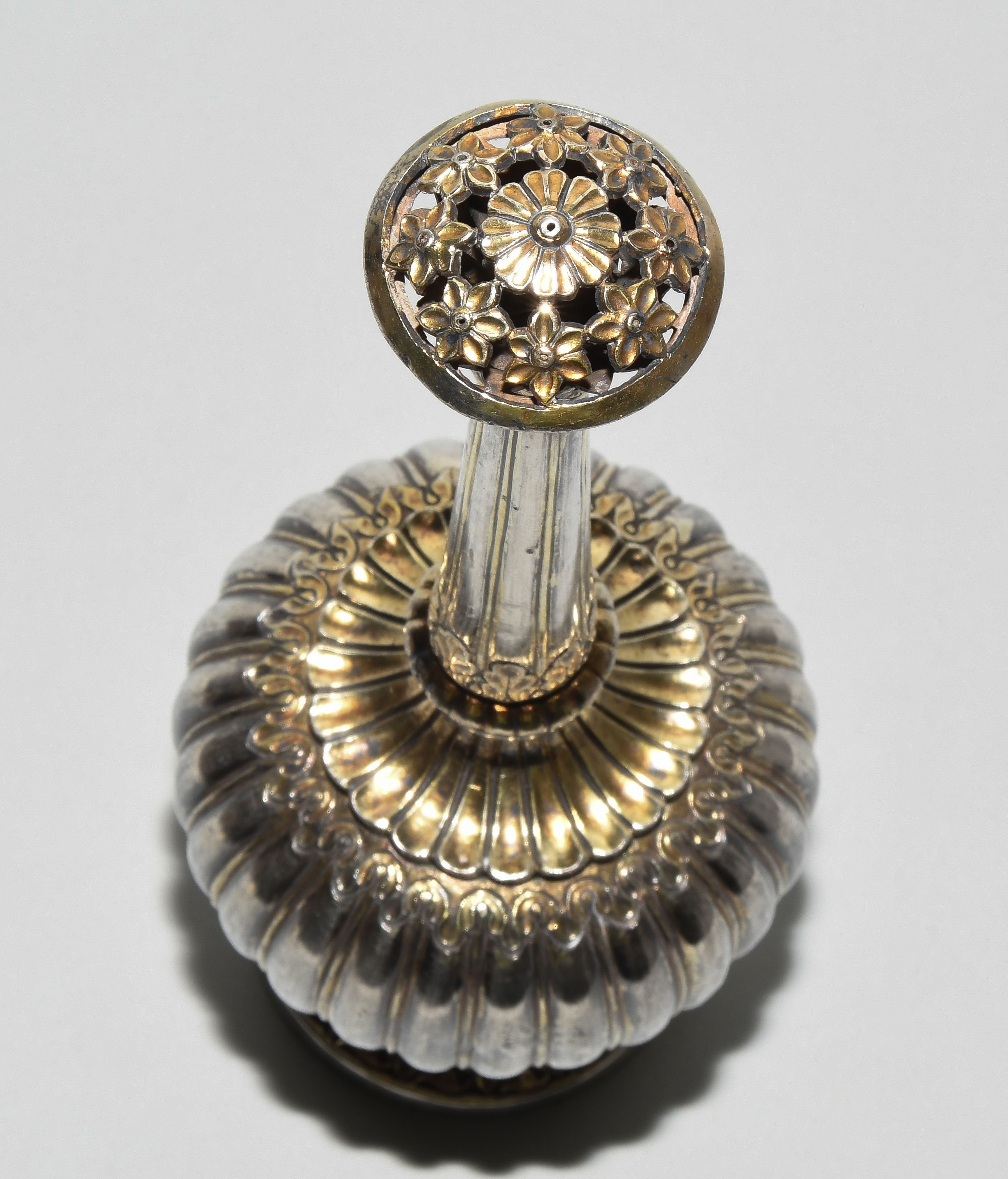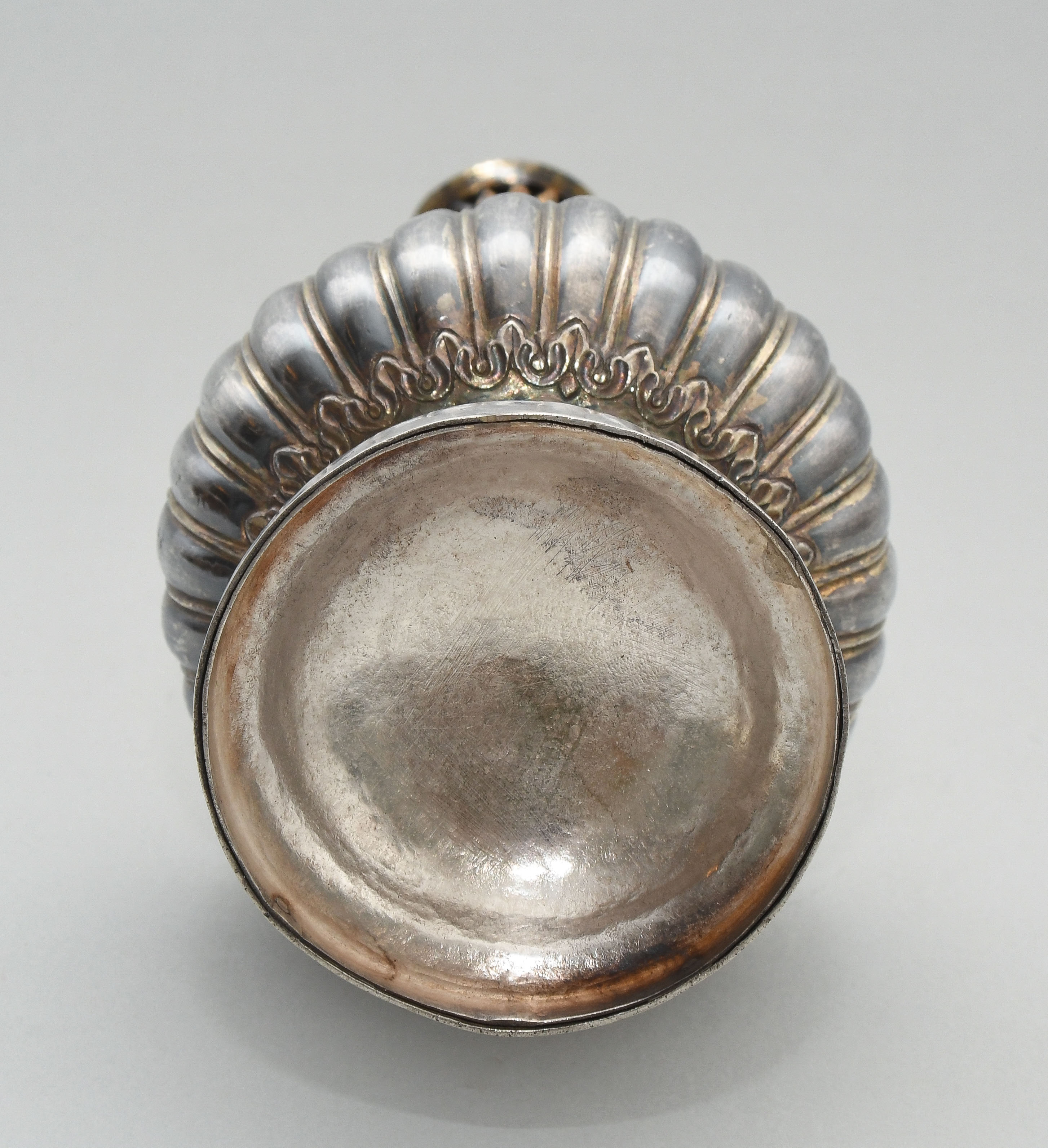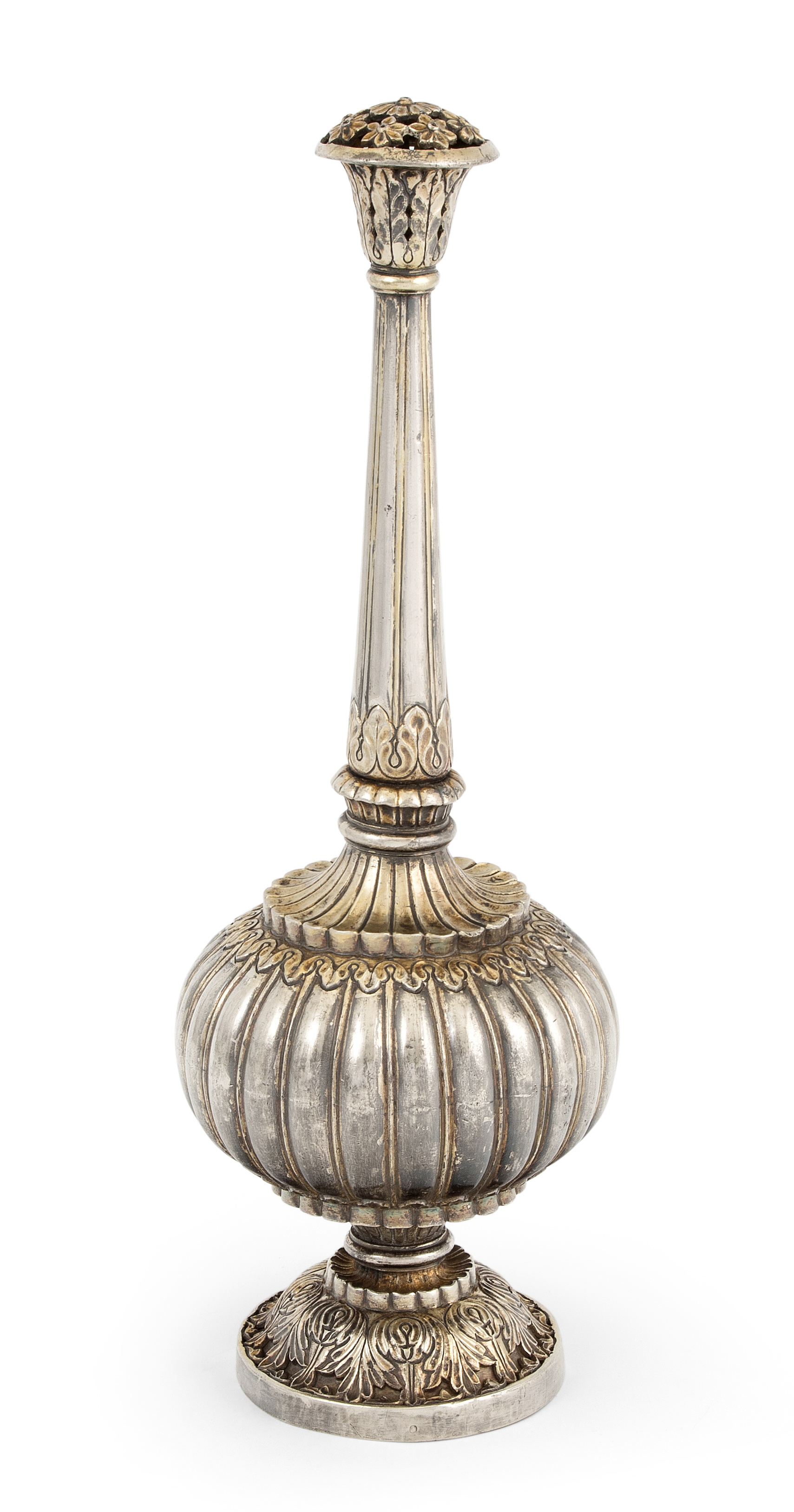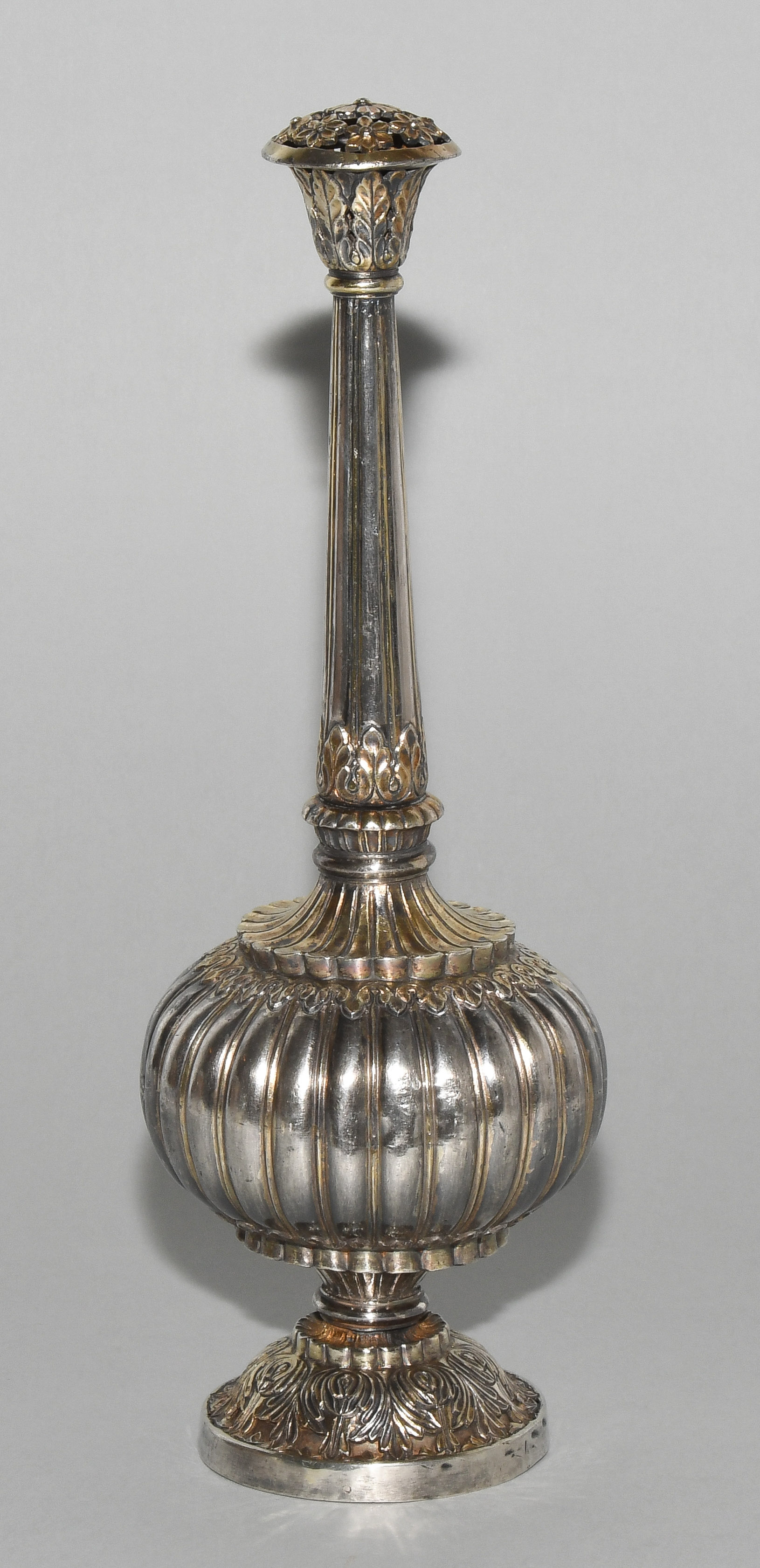 Indien, wohl 19.Jh. Silber mit Resten einer Teilvergoldung. Gerippte Wandung des Gefässkörpers. Floralderkor. H 29 cm, 569 g.