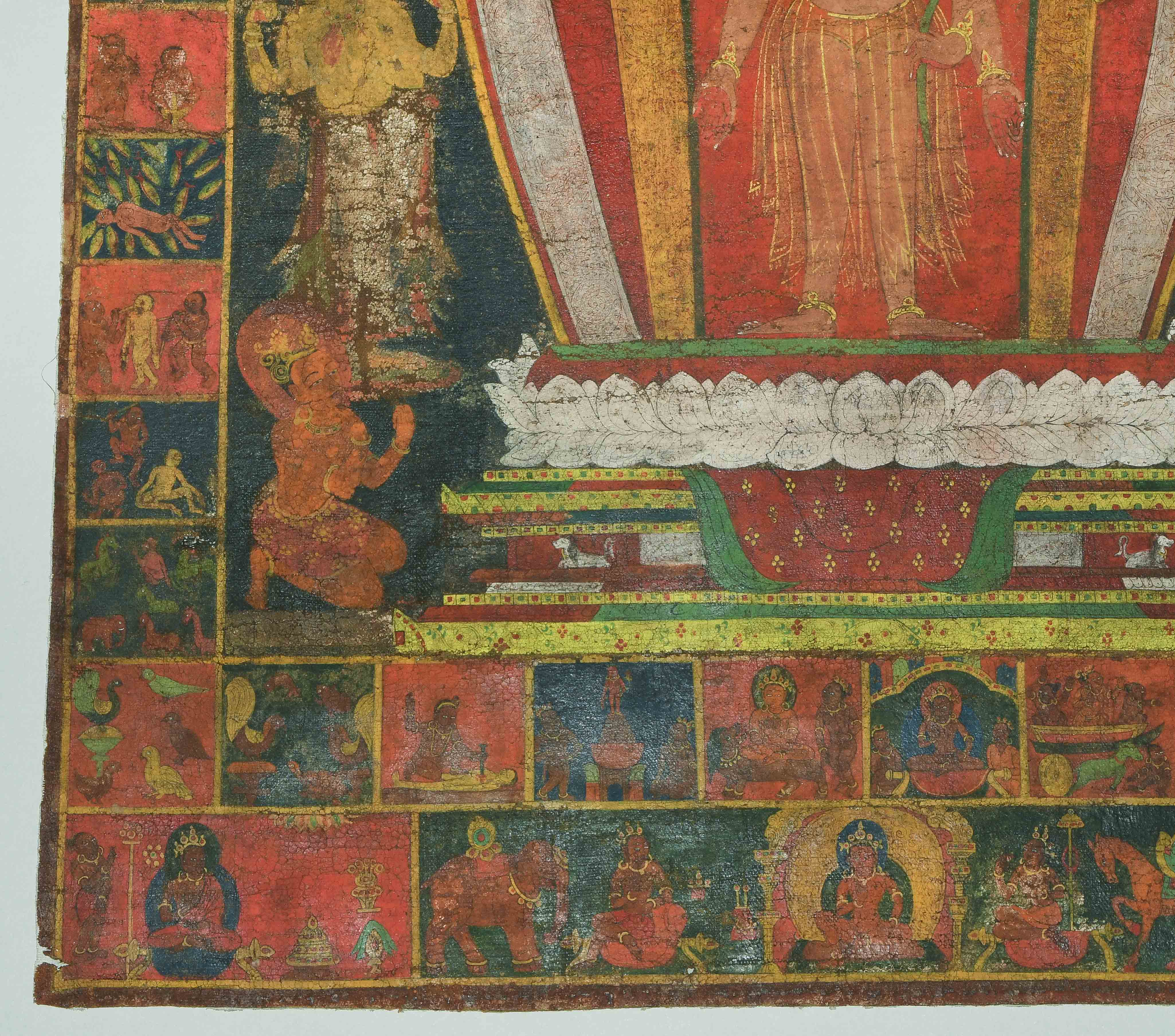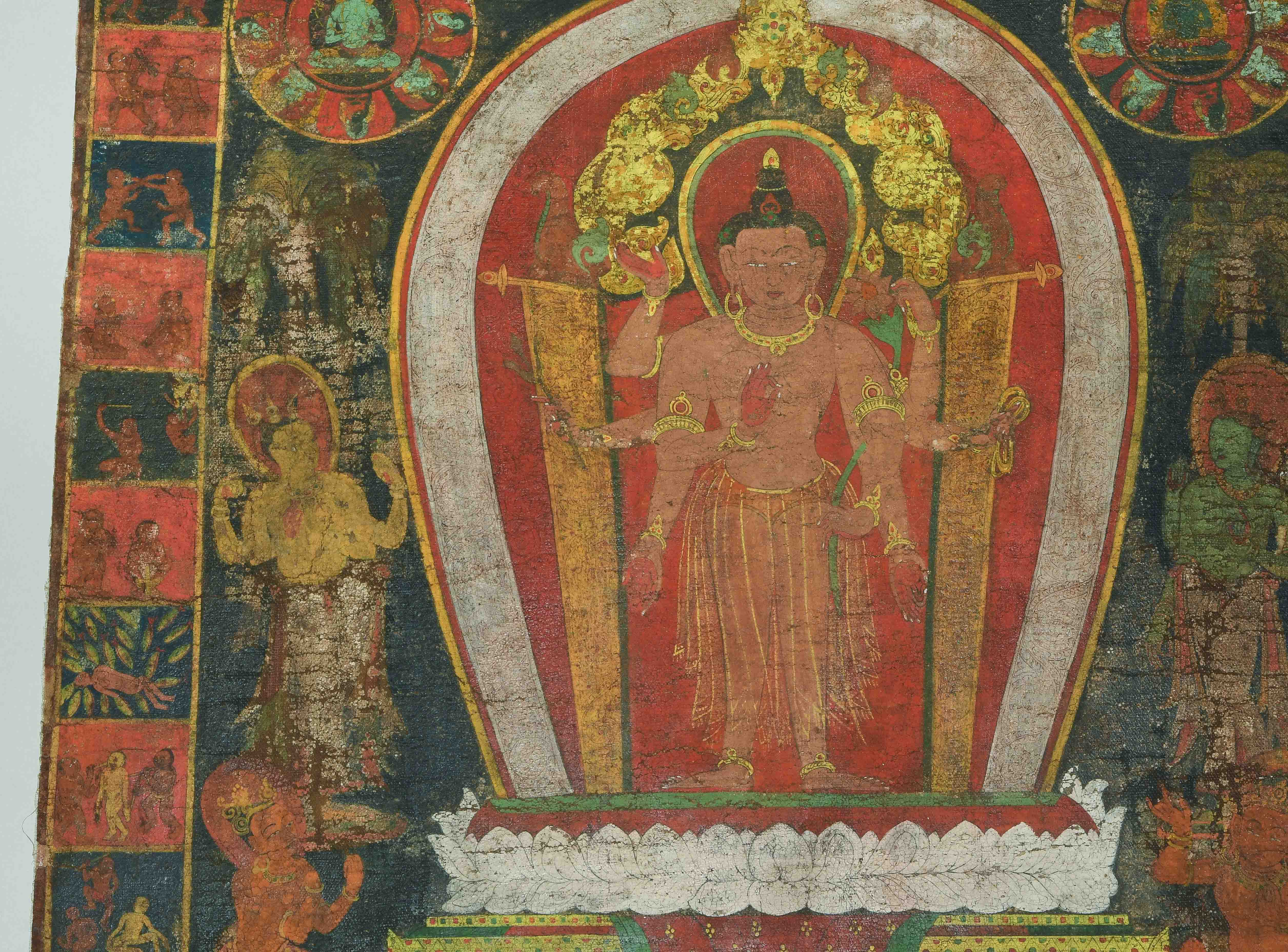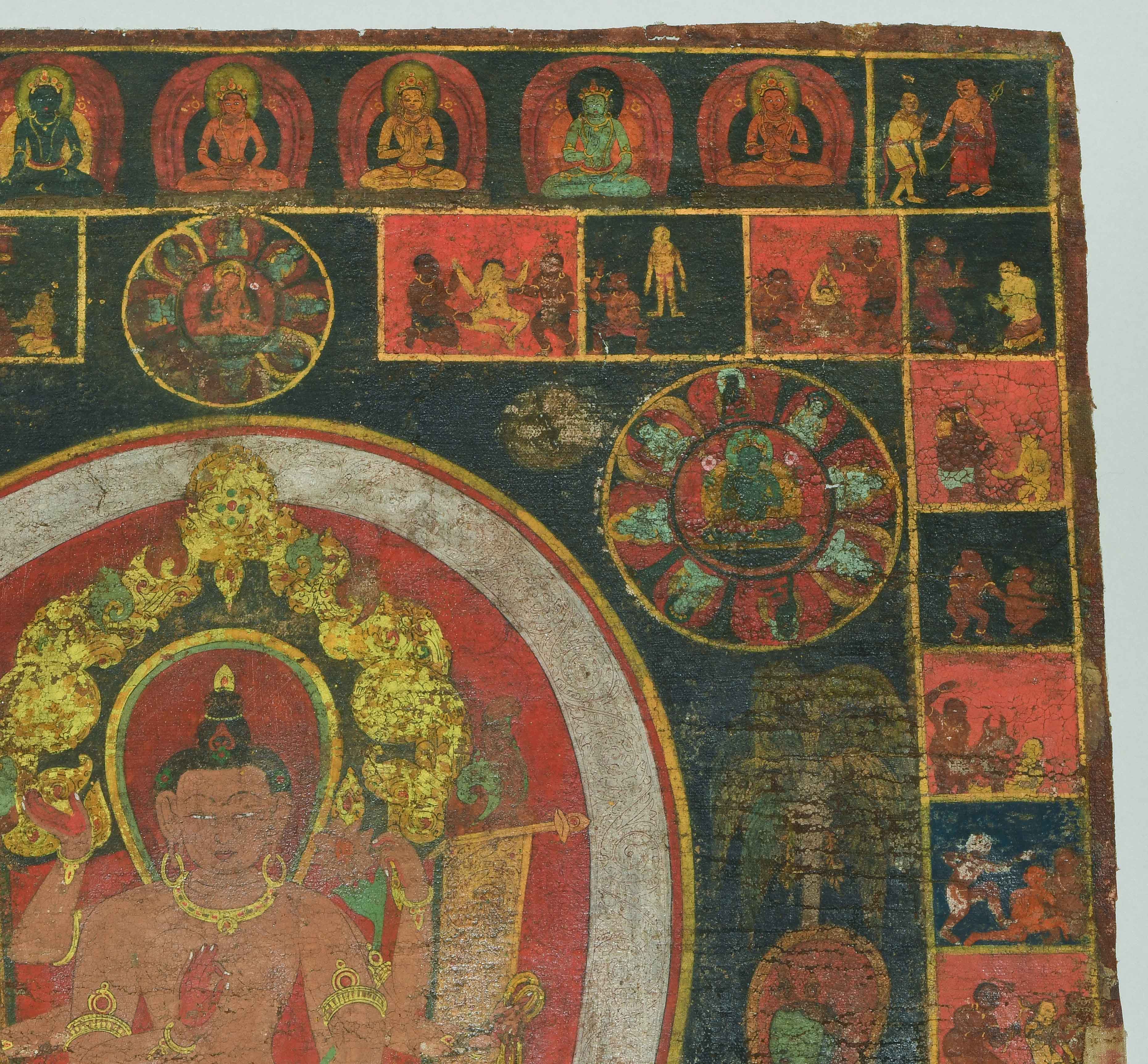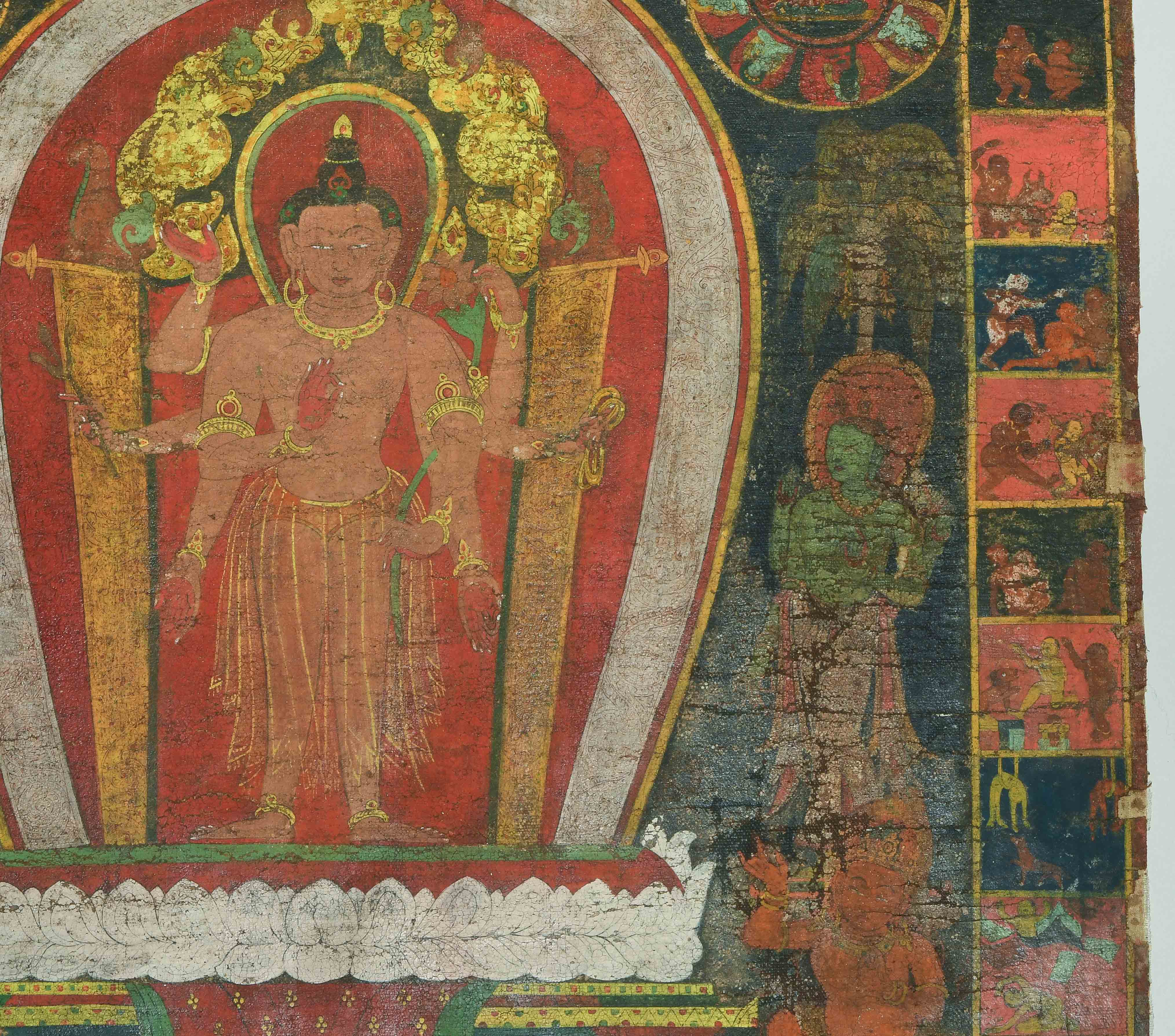 Tibet. Farbe auf Leinwand. Stehender achtarmiger Bodhisattva. Flankiert von u.a. zweiarmigen Boshisattvas. Rundherum figürliche Szenen in viereckigen Feldern angeordnet. Schadstellen, Altersspuren. 61,5x48 cm.