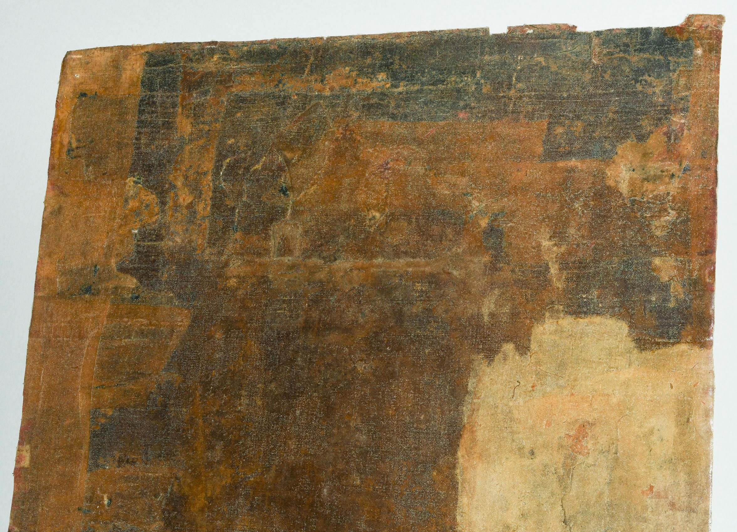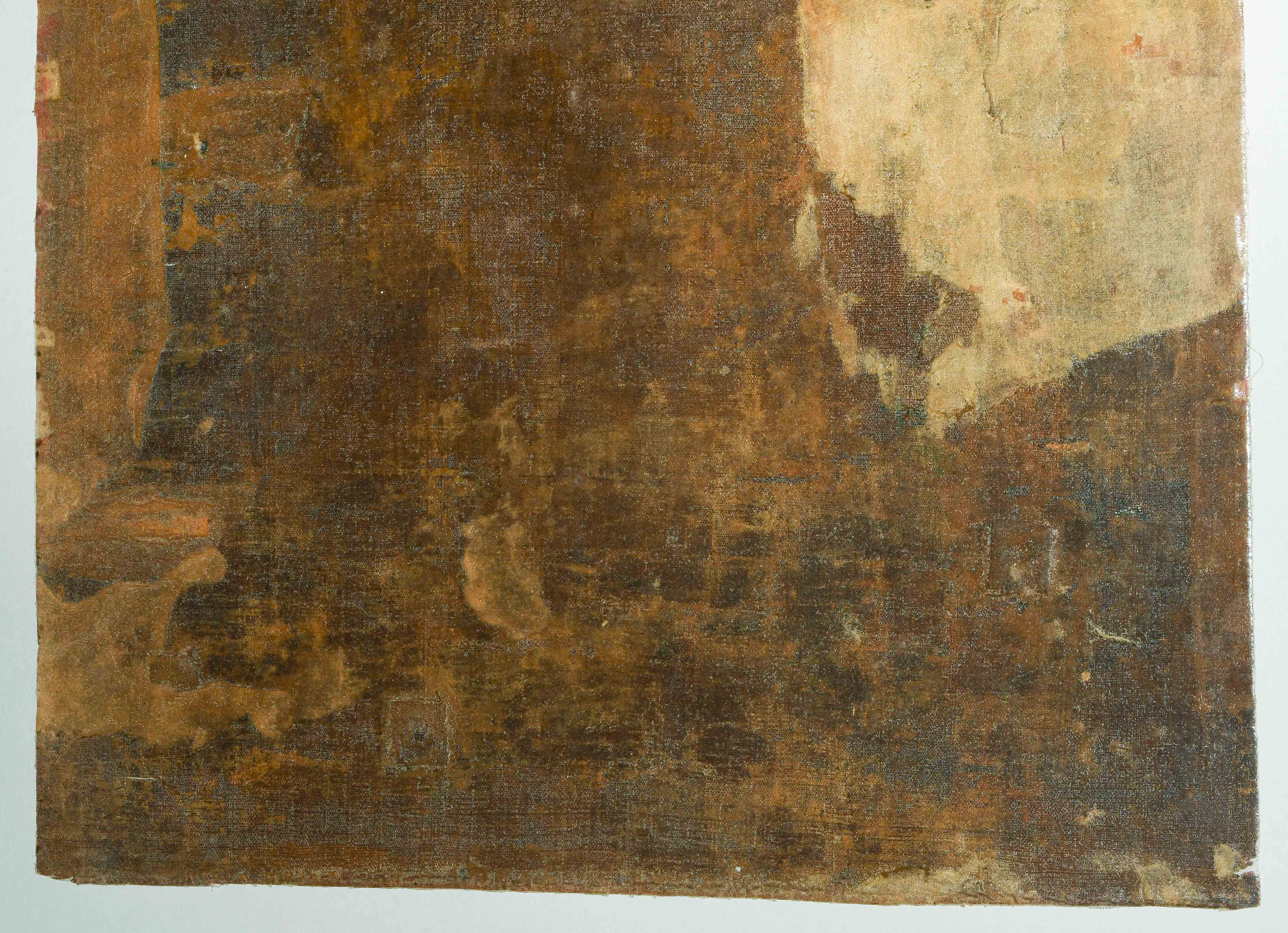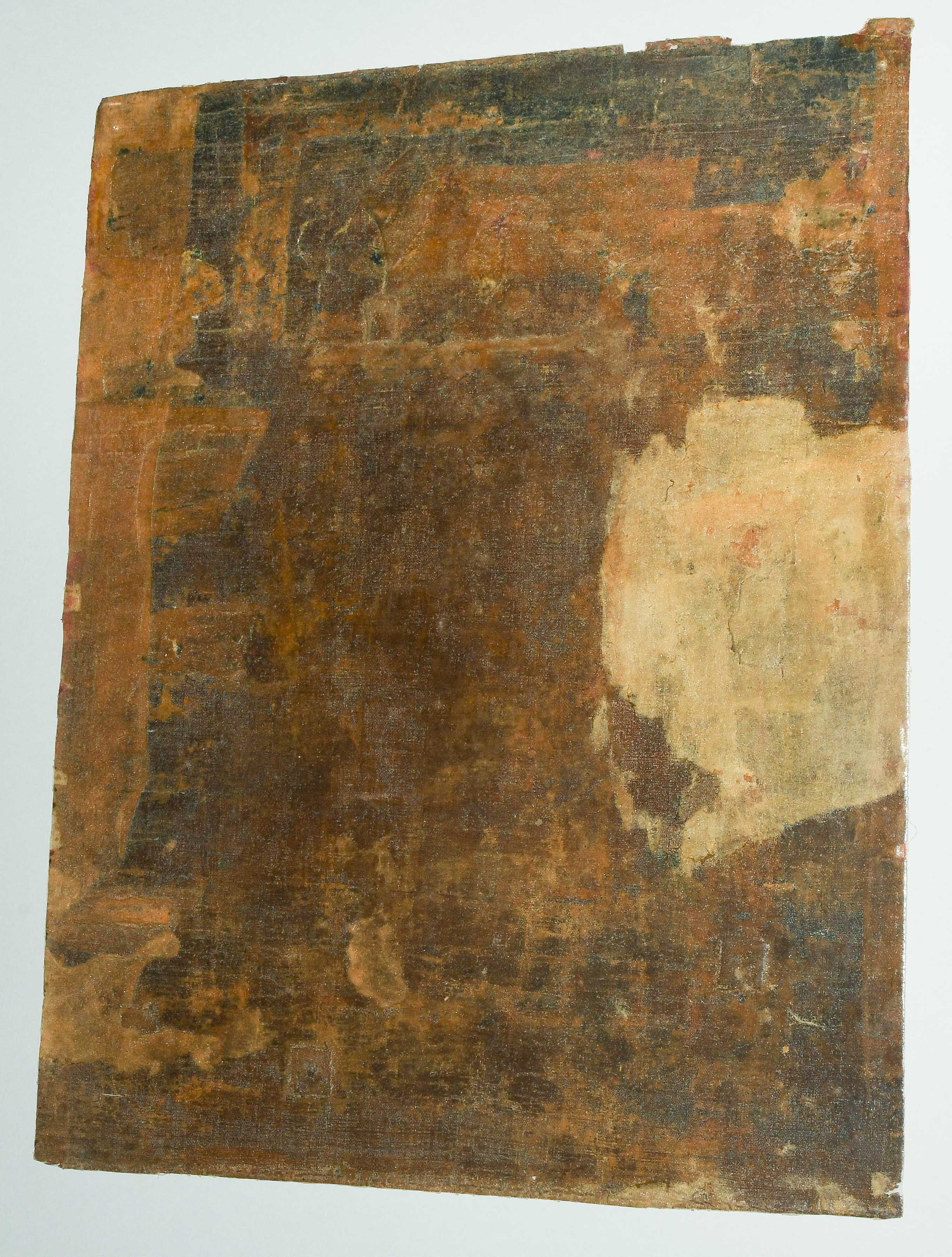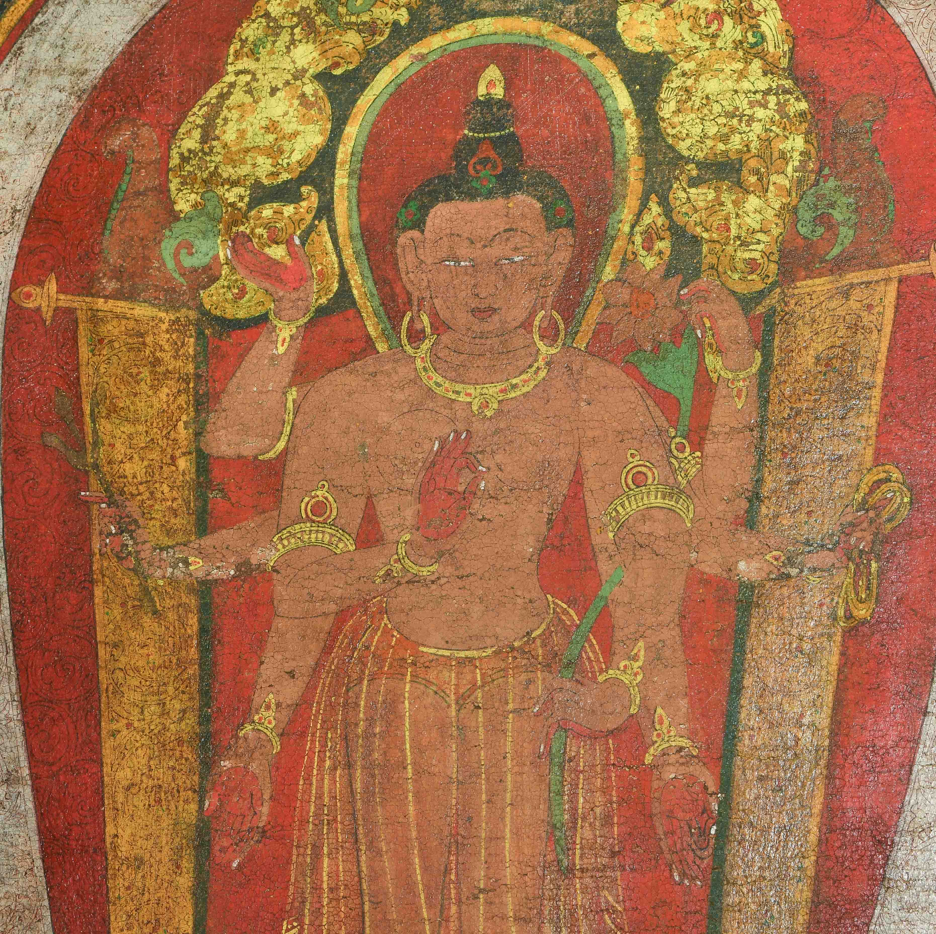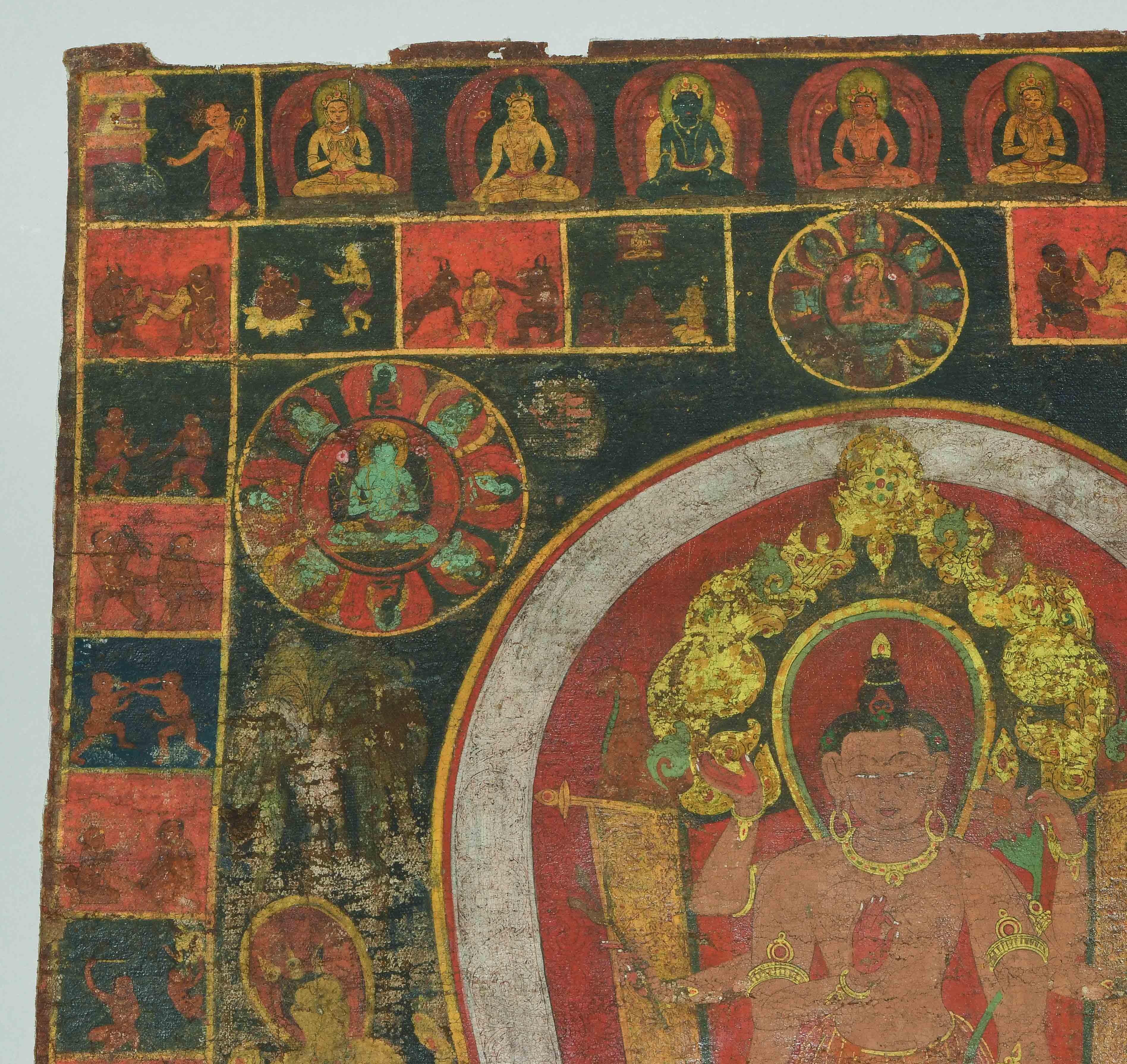 Tibet. Farbe auf Leinwand. Stehender achtarmiger Bodhisattva. Flankiert von u.a. zweiarmigen Boshisattvas. Rundherum figürliche Szenen in viereckigen Feldern angeordnet. Schadstellen, Altersspuren. 61,5x48 cm.