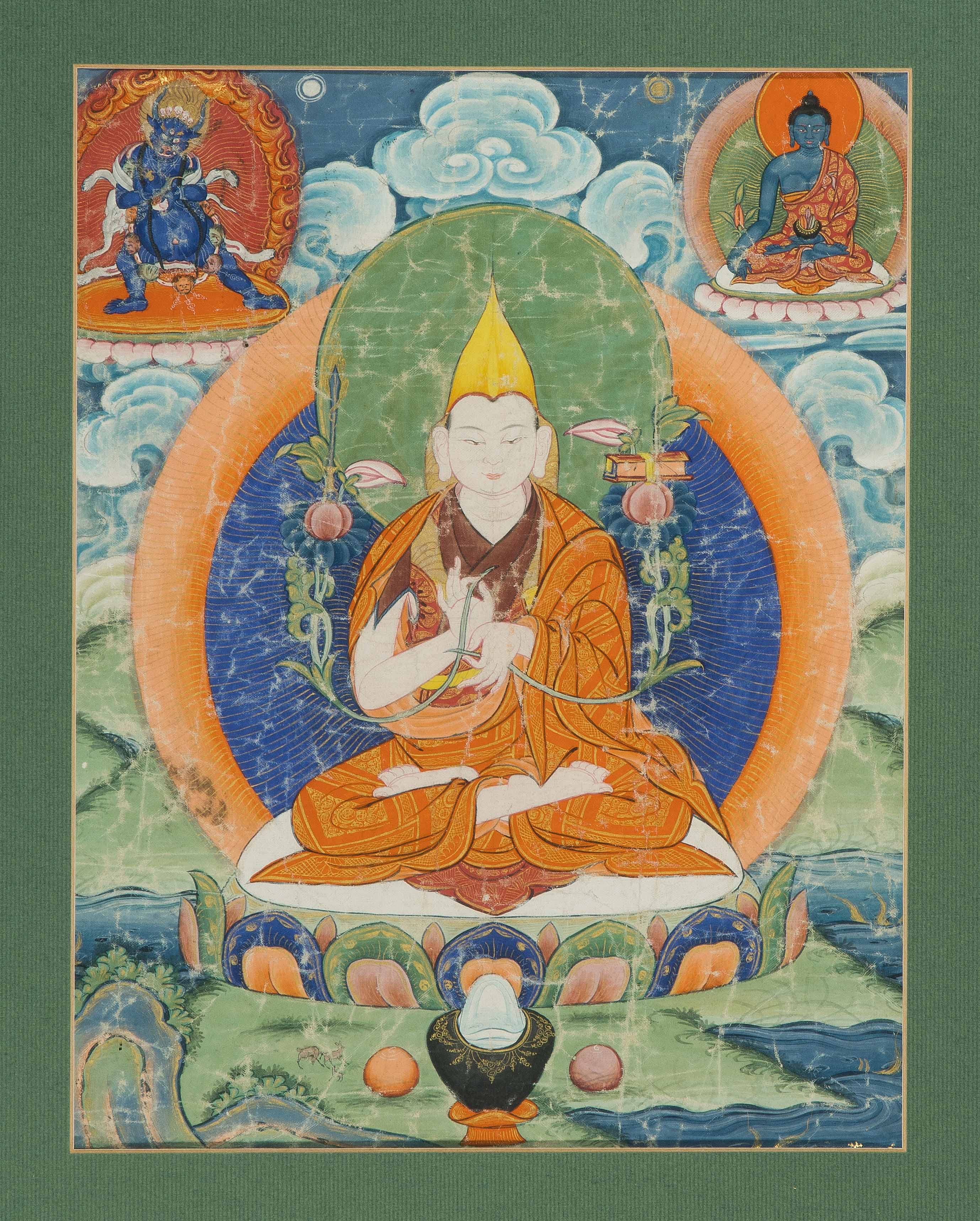 Tibet. Farbe auf Leinwand. Tsongkhapa auf Lotosthron. Knitterspuren. 49,5x40,5 cm. Gerahmt.