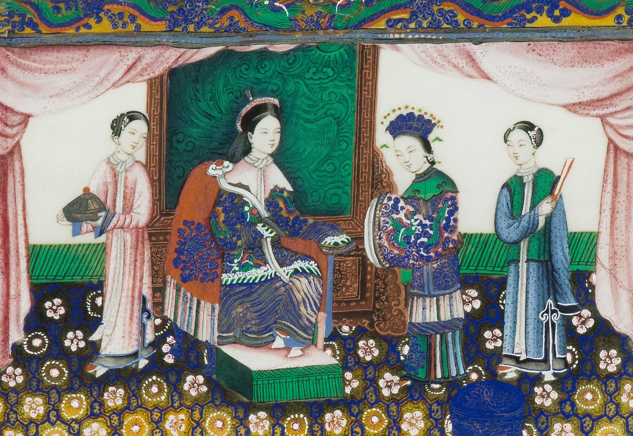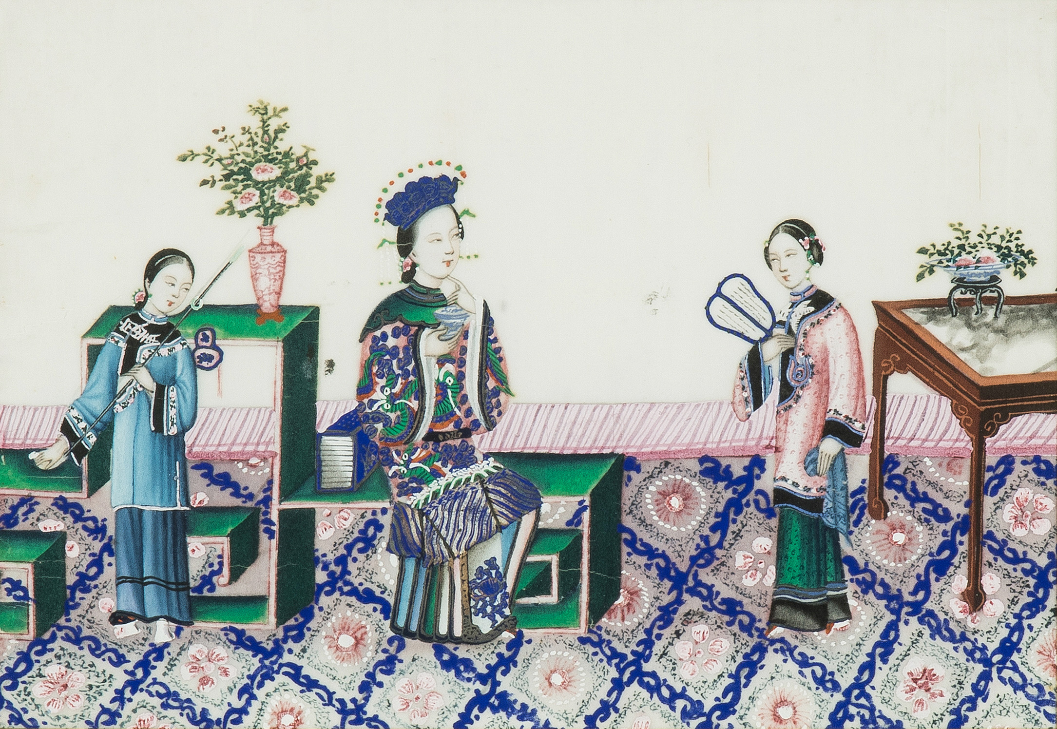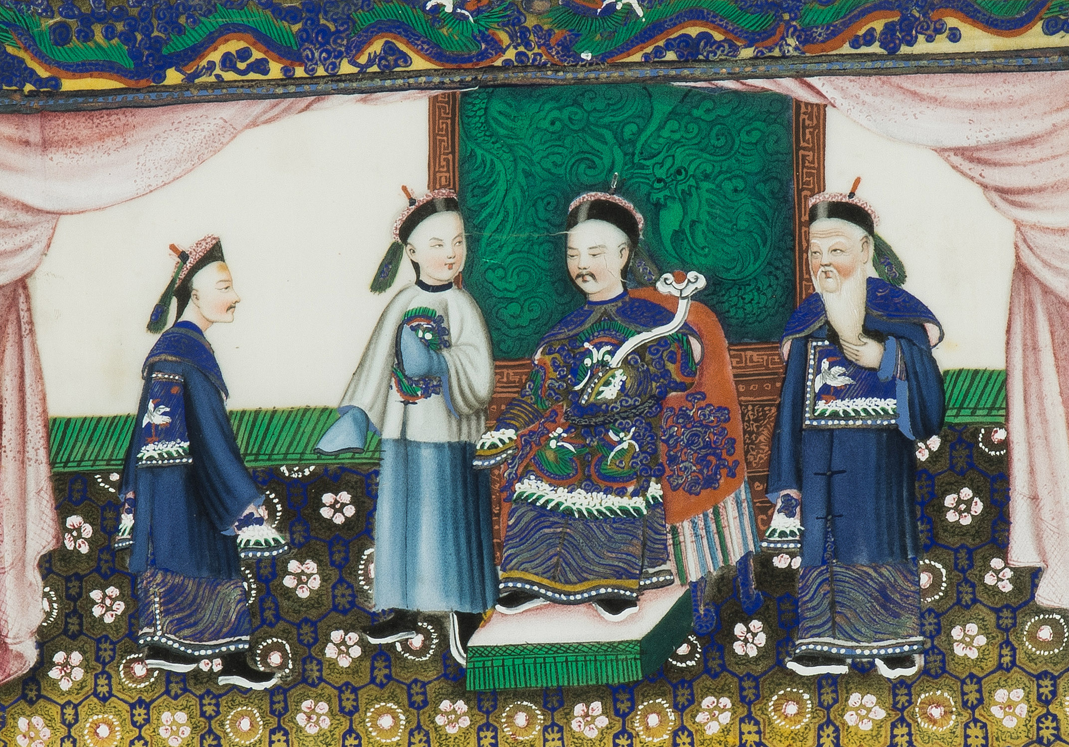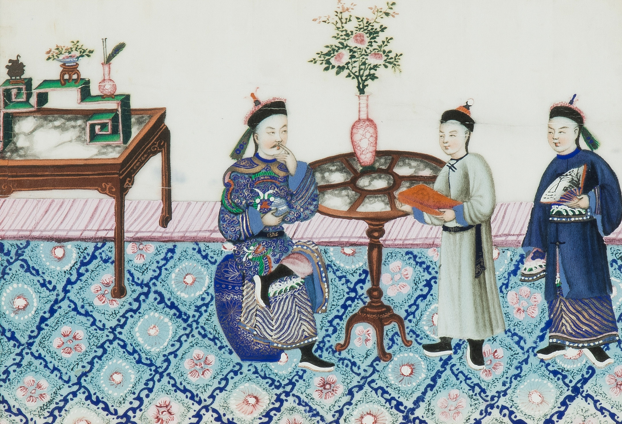 China, spätes 19.Jh. Kanton. Farbe auf Reispapier. Höfische Szenen. Tlw. beschädigt. Sechsmal 36x43,5 / zweimal 46,5x34,5 / zweimal 49,5x34,5 cm. Gerahmt.