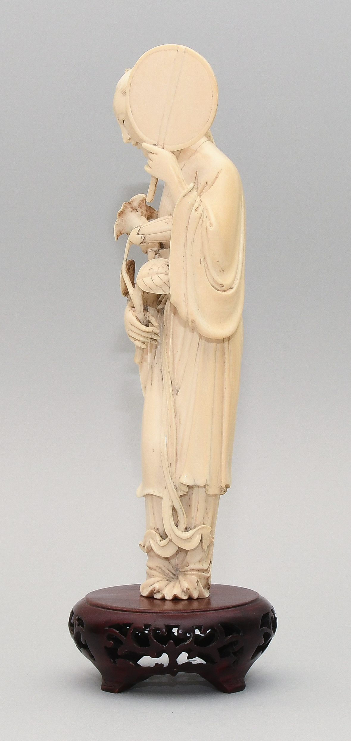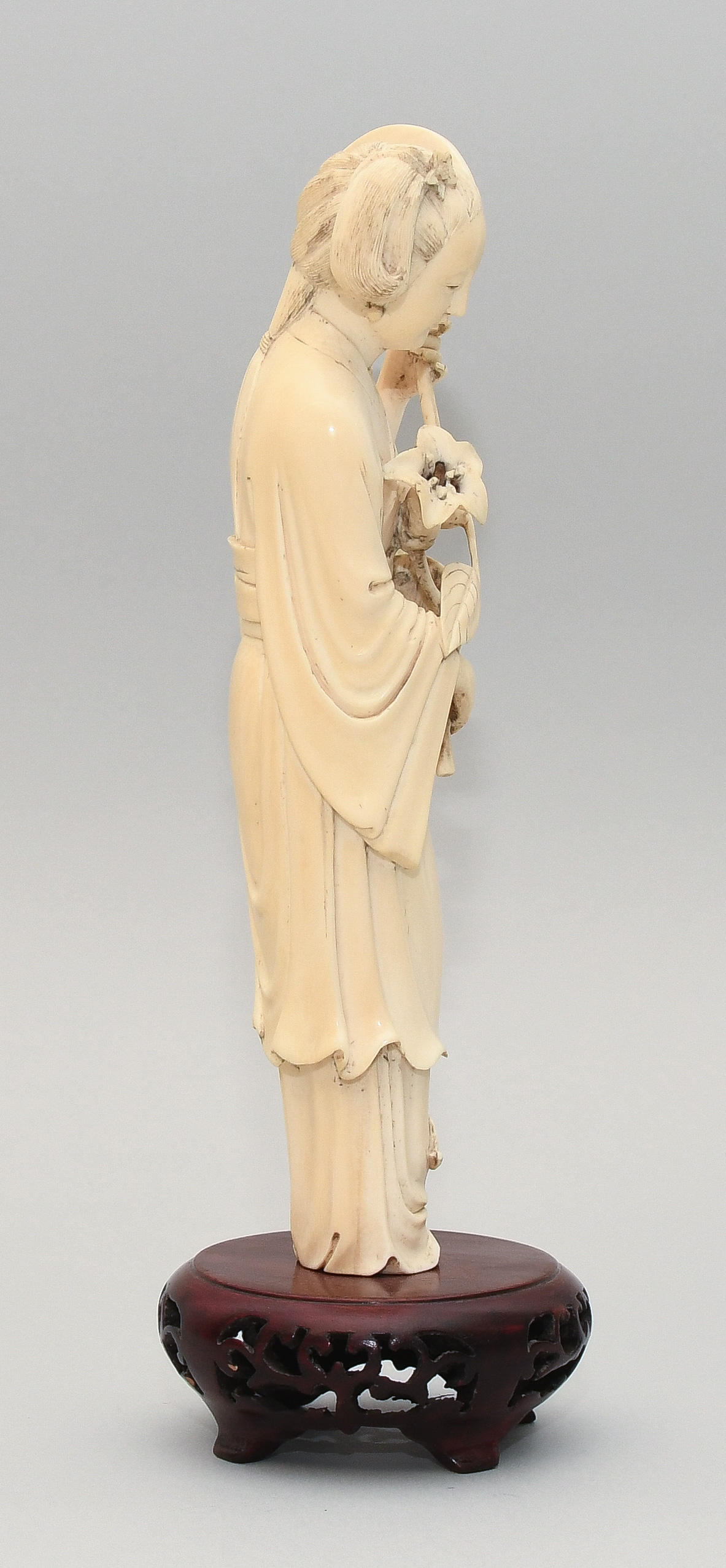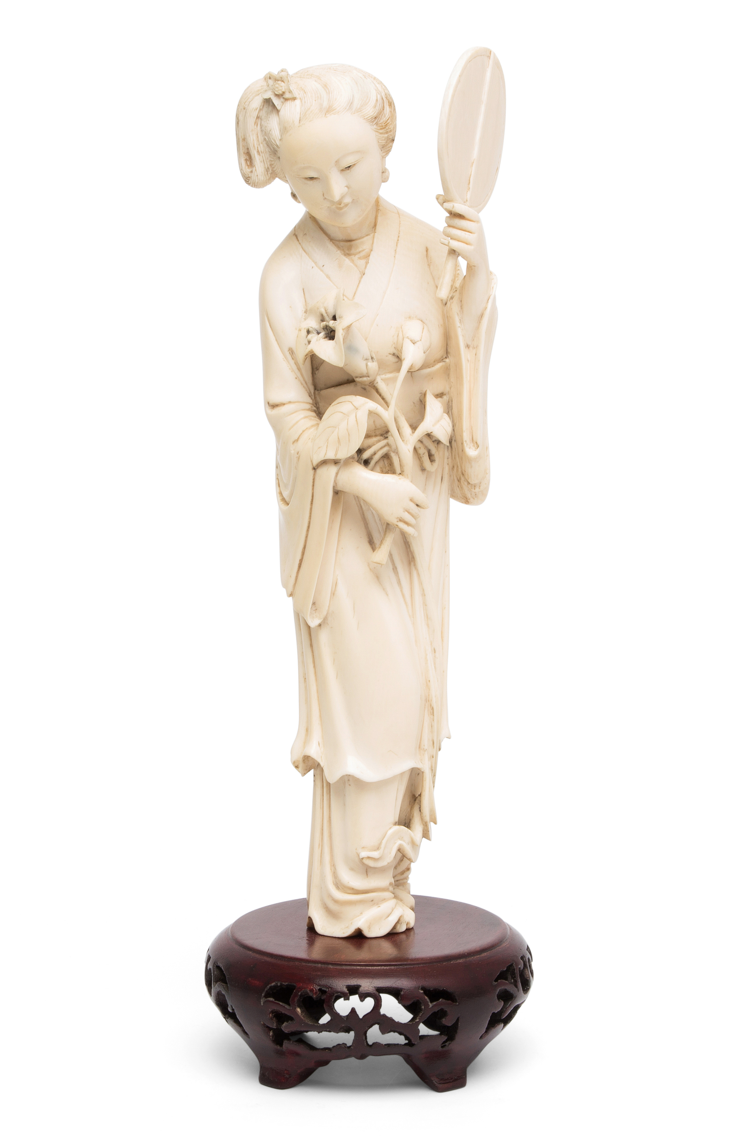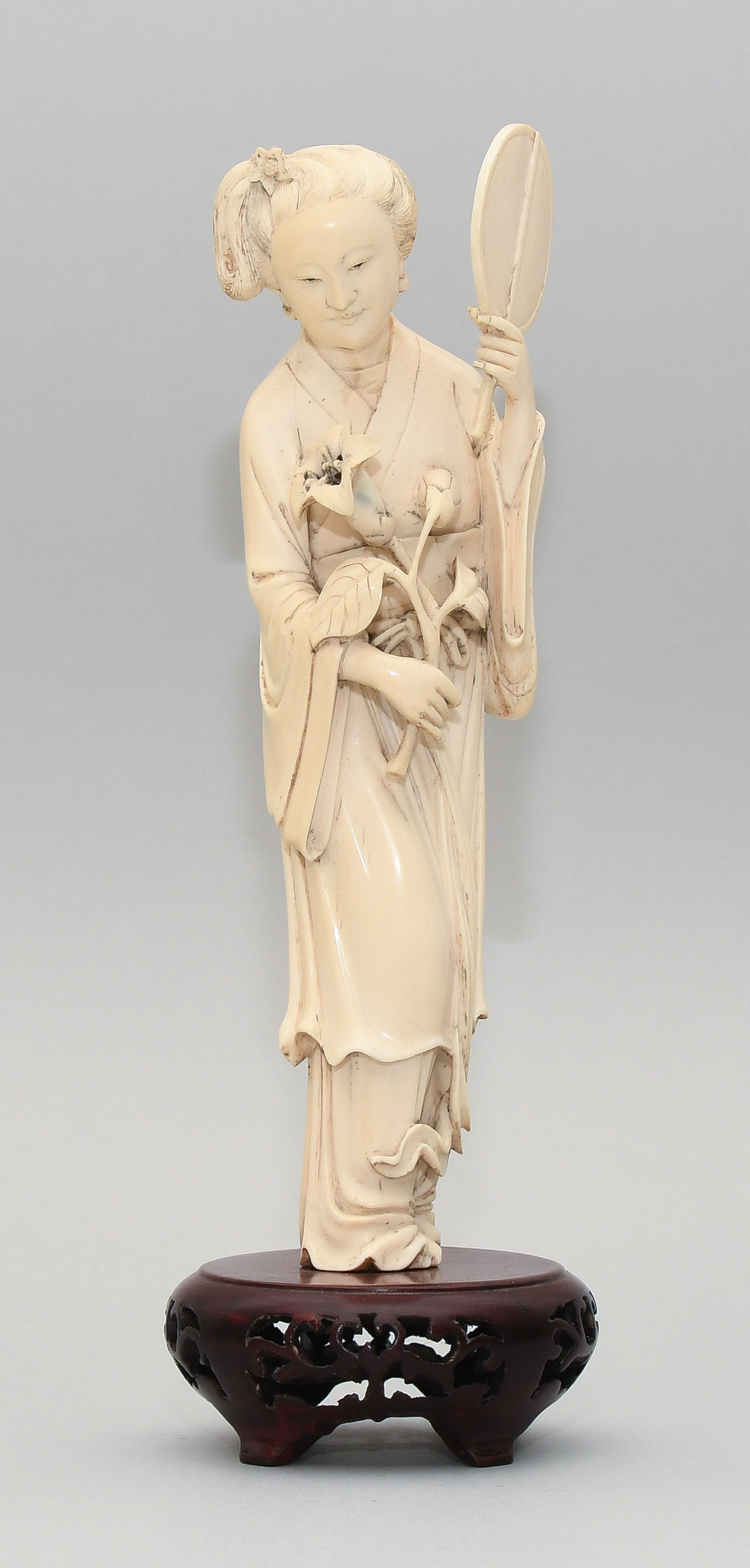 China, 20.Jh. Elfenbein. Stehende Schönheit in langem Gewand mit Fächer in linker Hand und Blumen in rechter Hand. H 22,5. Figur. / H 26,5 cm. Fest auf Holzsockel montiert.