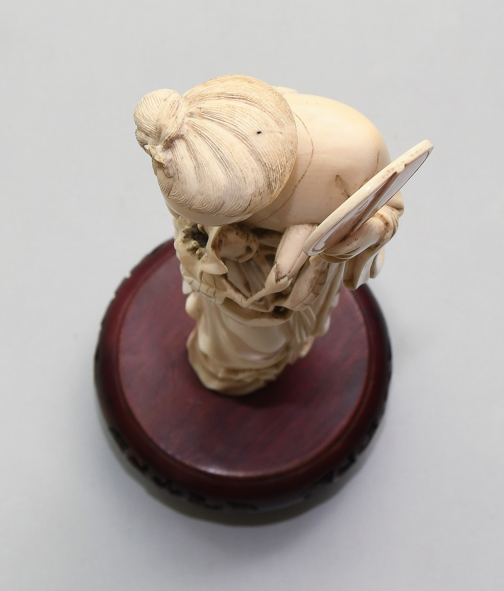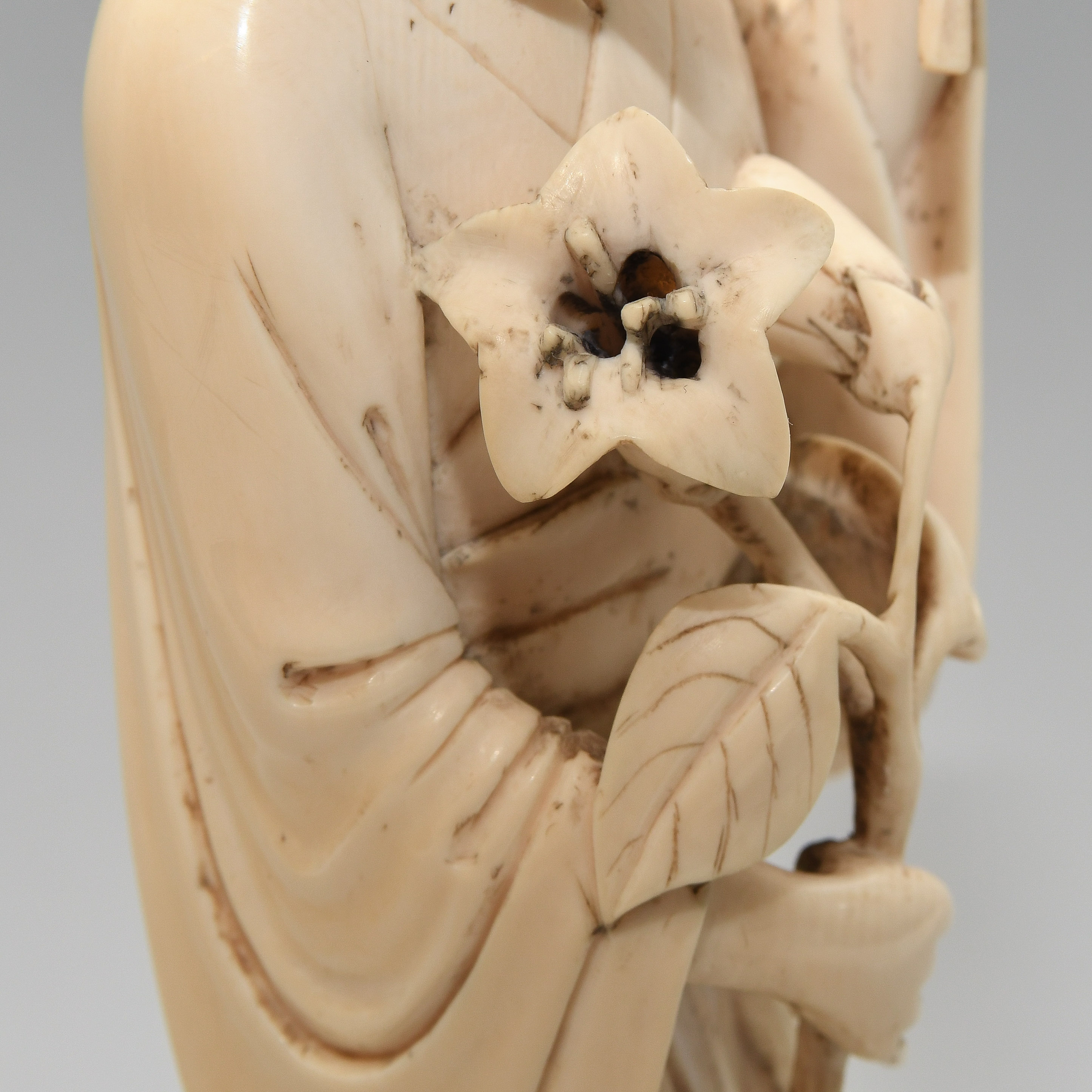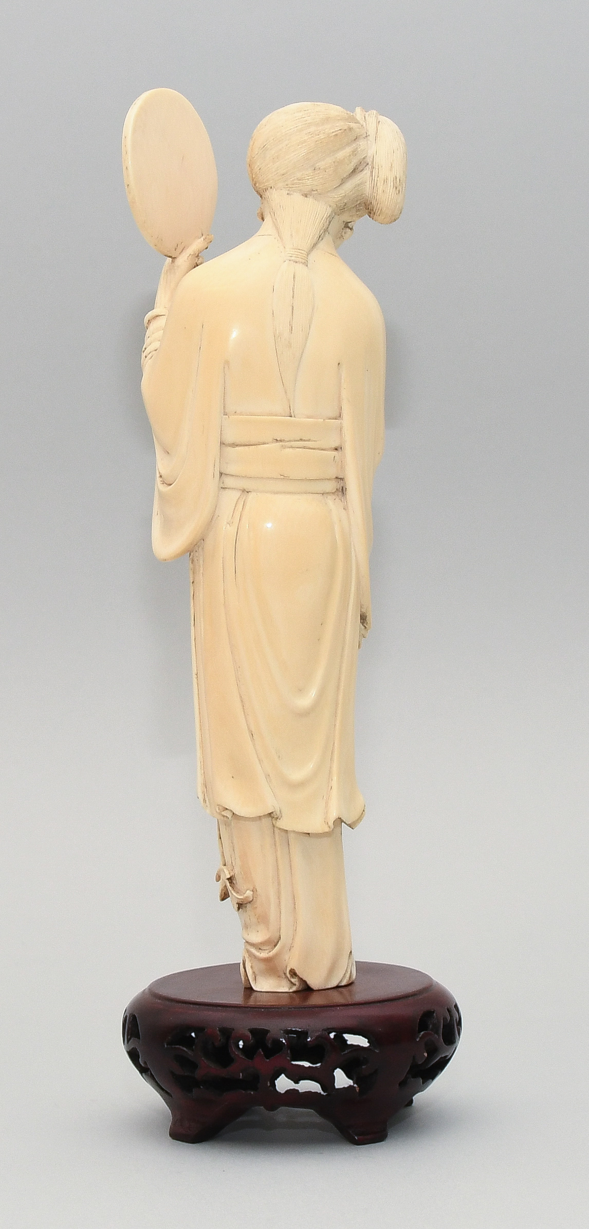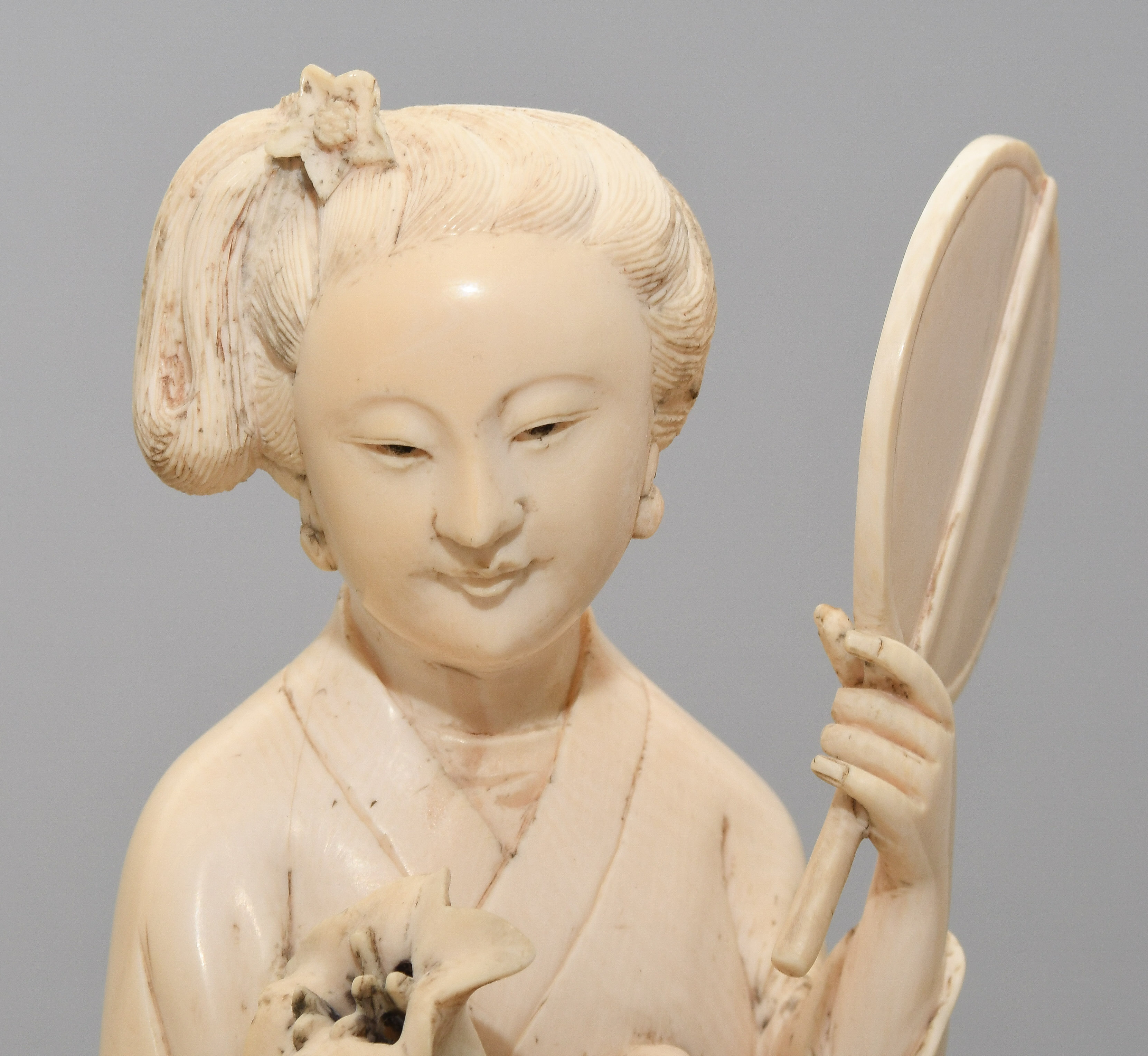 China, 20.Jh. Elfenbein. Stehende Schönheit in langem Gewand mit Fächer in linker Hand und Blumen in rechter Hand. H 22,5. Figur. / H 26,5 cm. Fest auf Holzsockel montiert.
