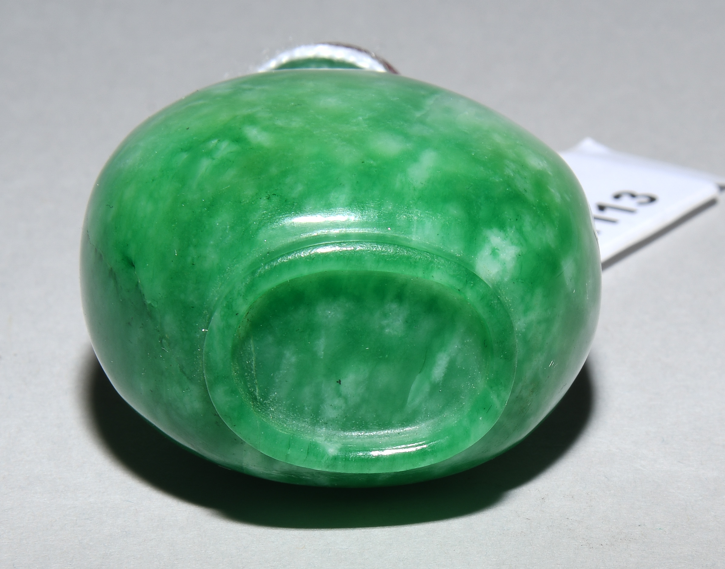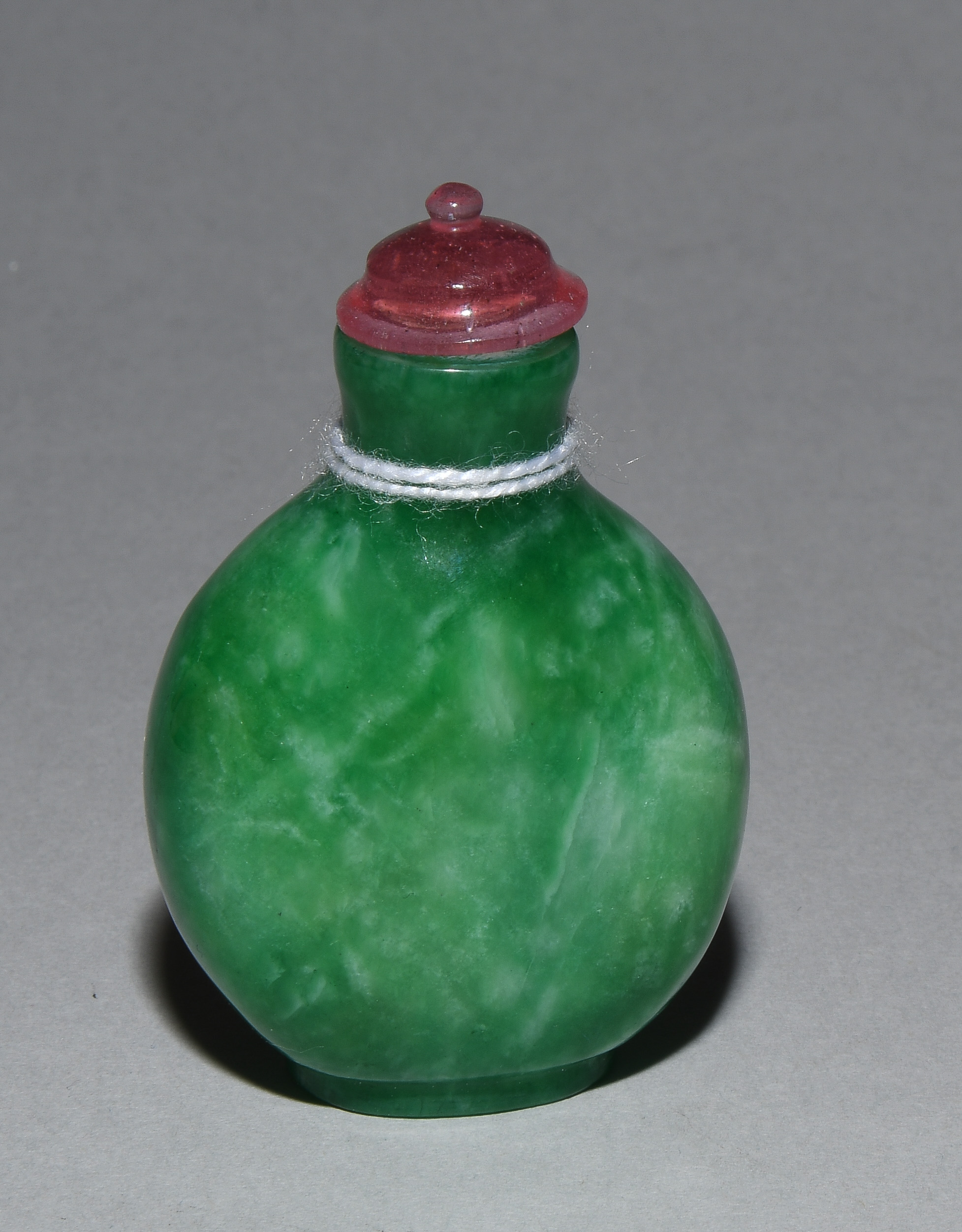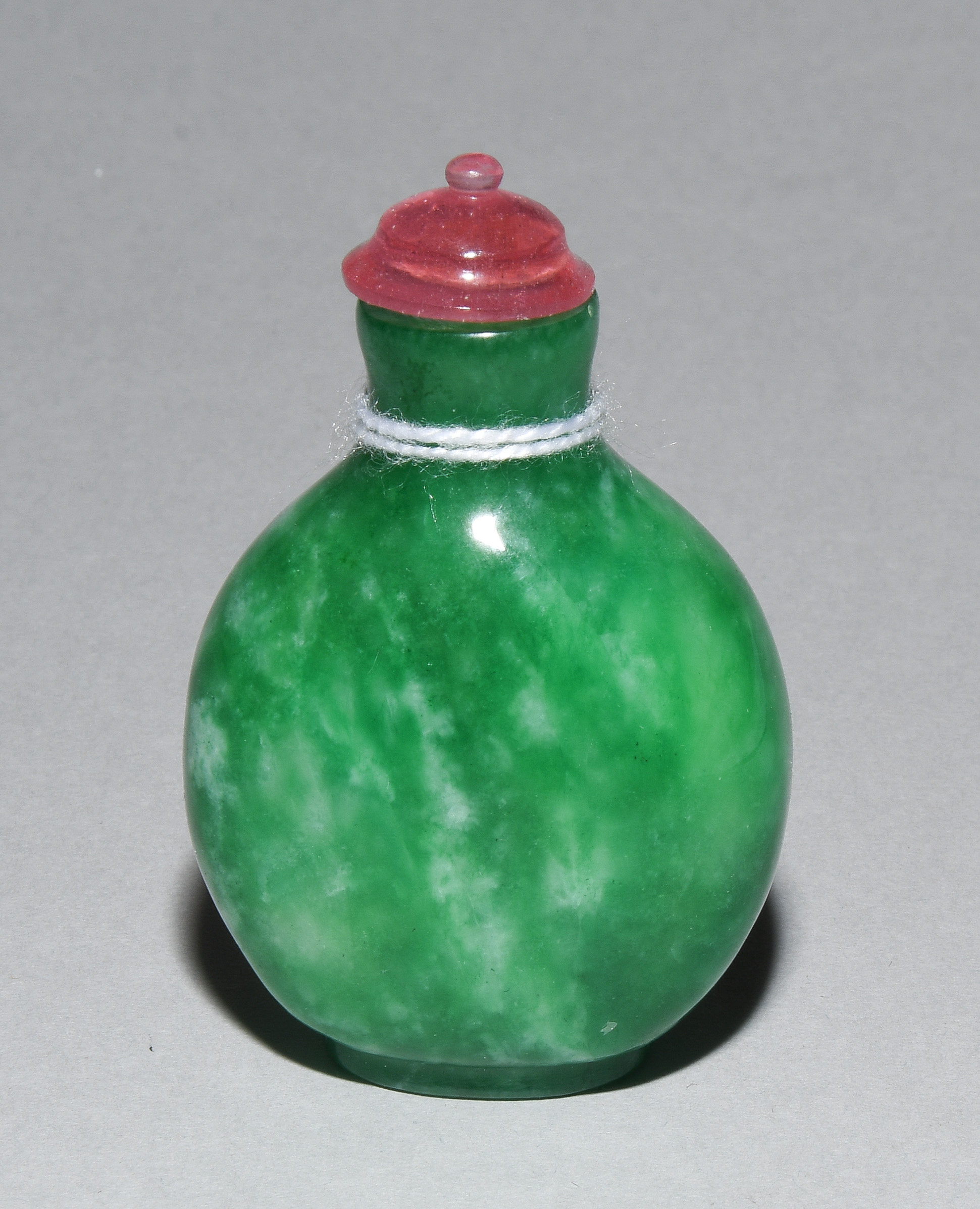 China, 20.Jh. Grün bewölkte Jade. Flache Balusterform. Mit Stöpsel. H 6 cm.