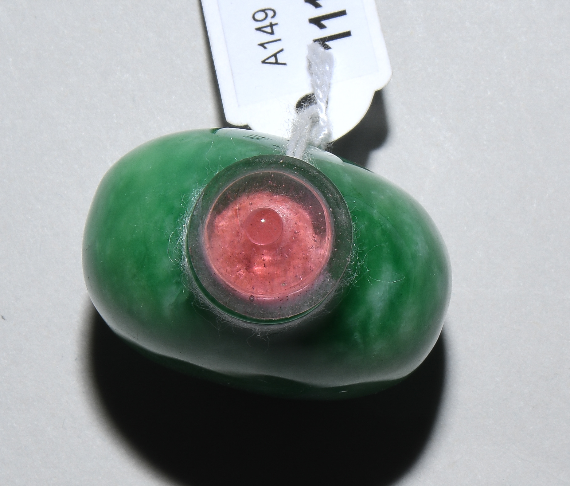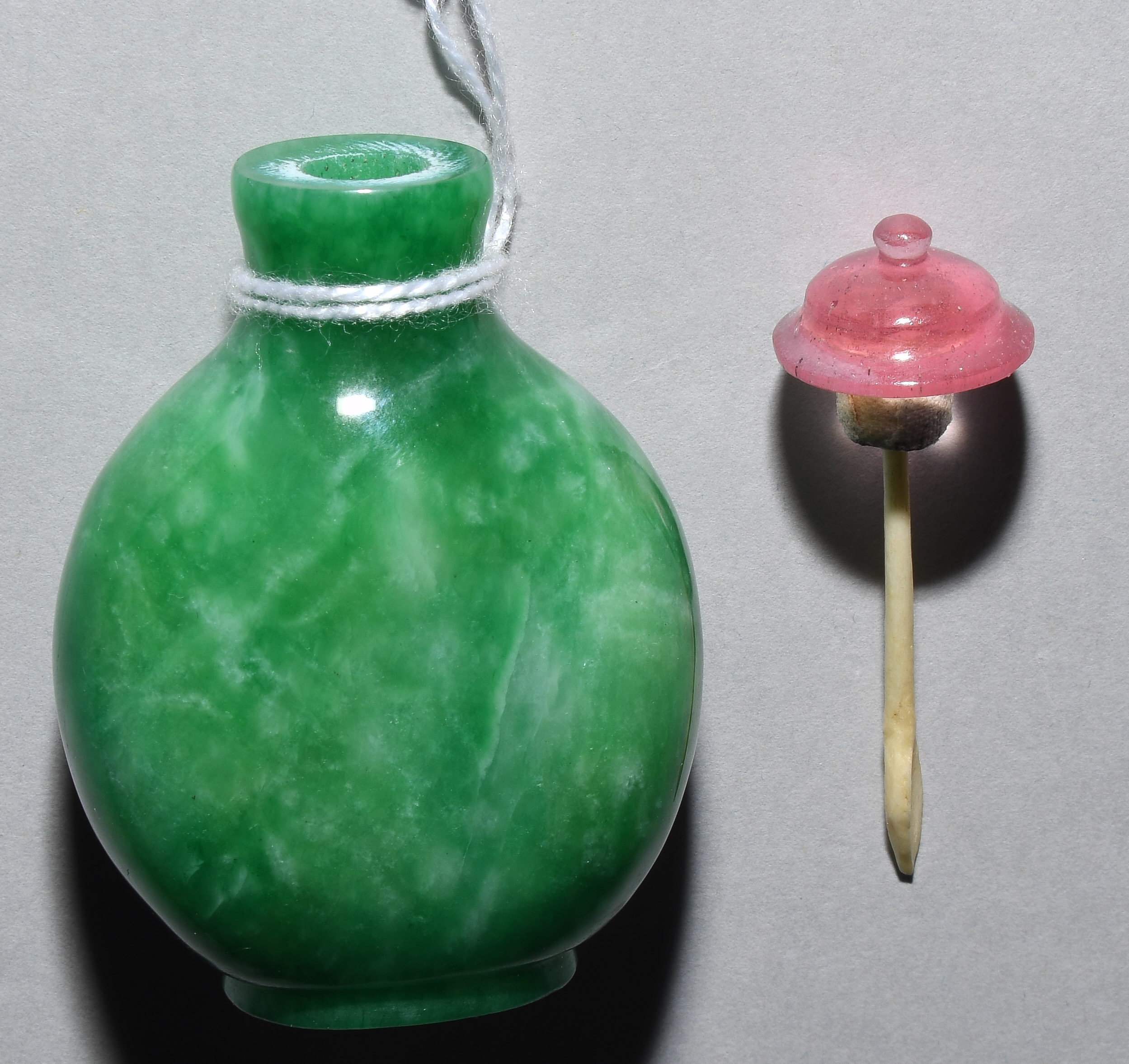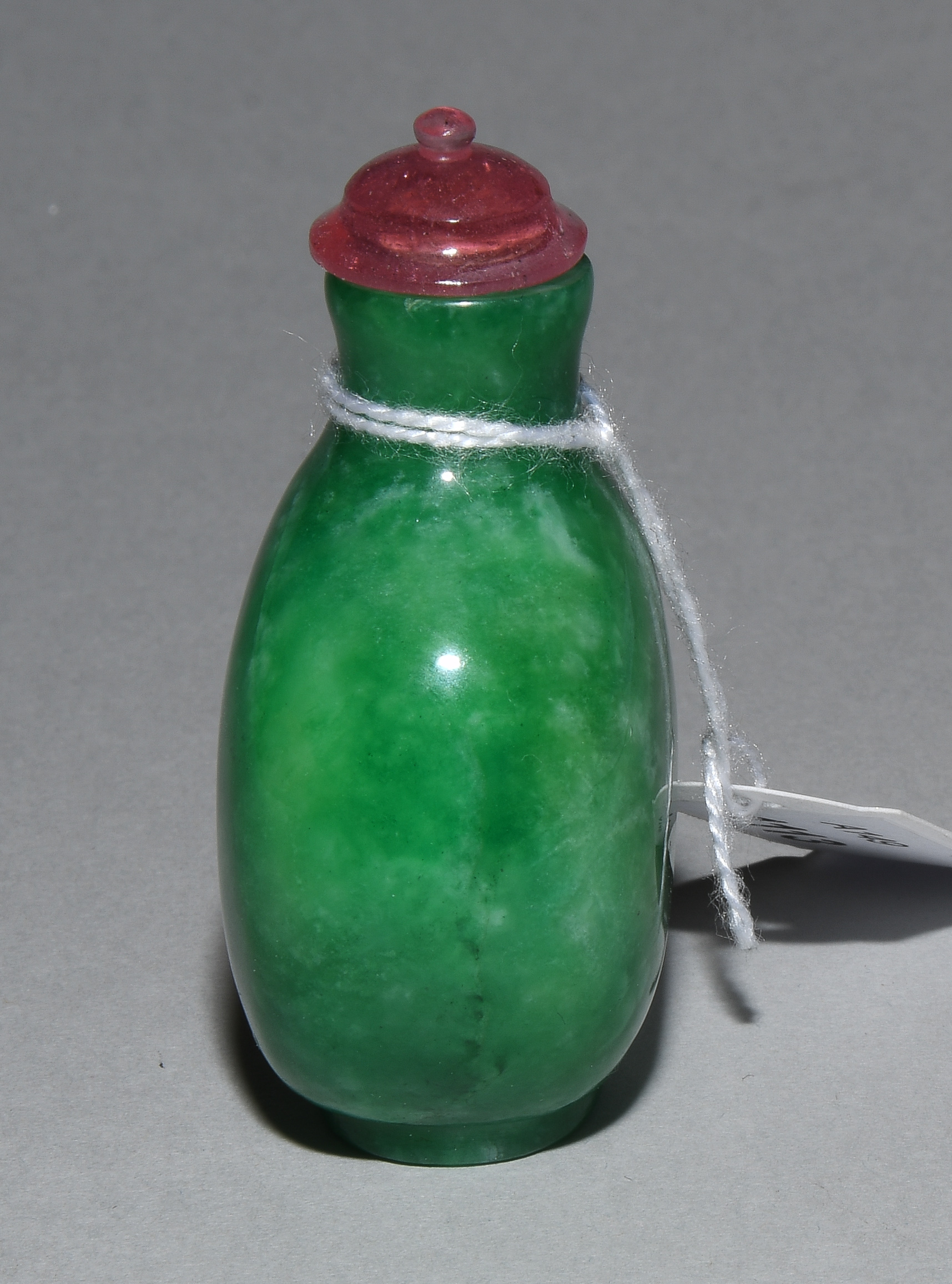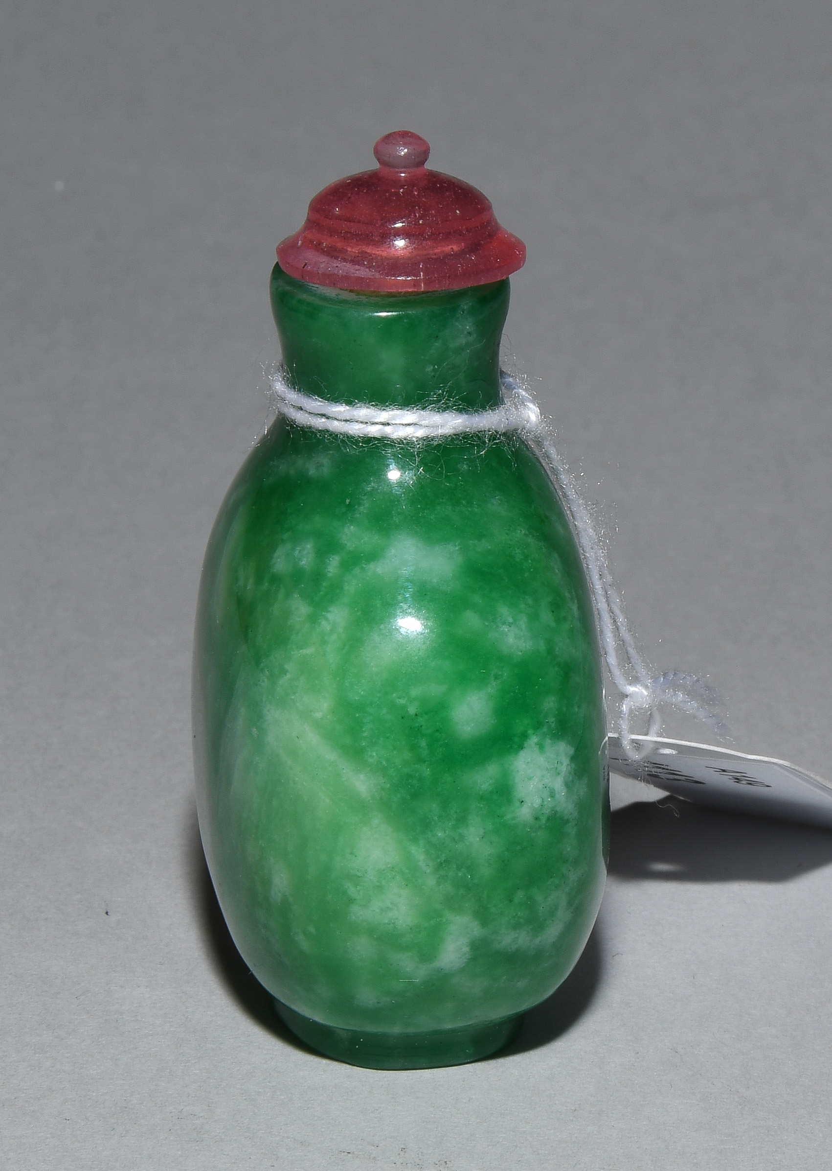 China, 20.Jh. Grün bewölkte Jade. Flache Balusterform. Mit Stöpsel. H 6 cm.