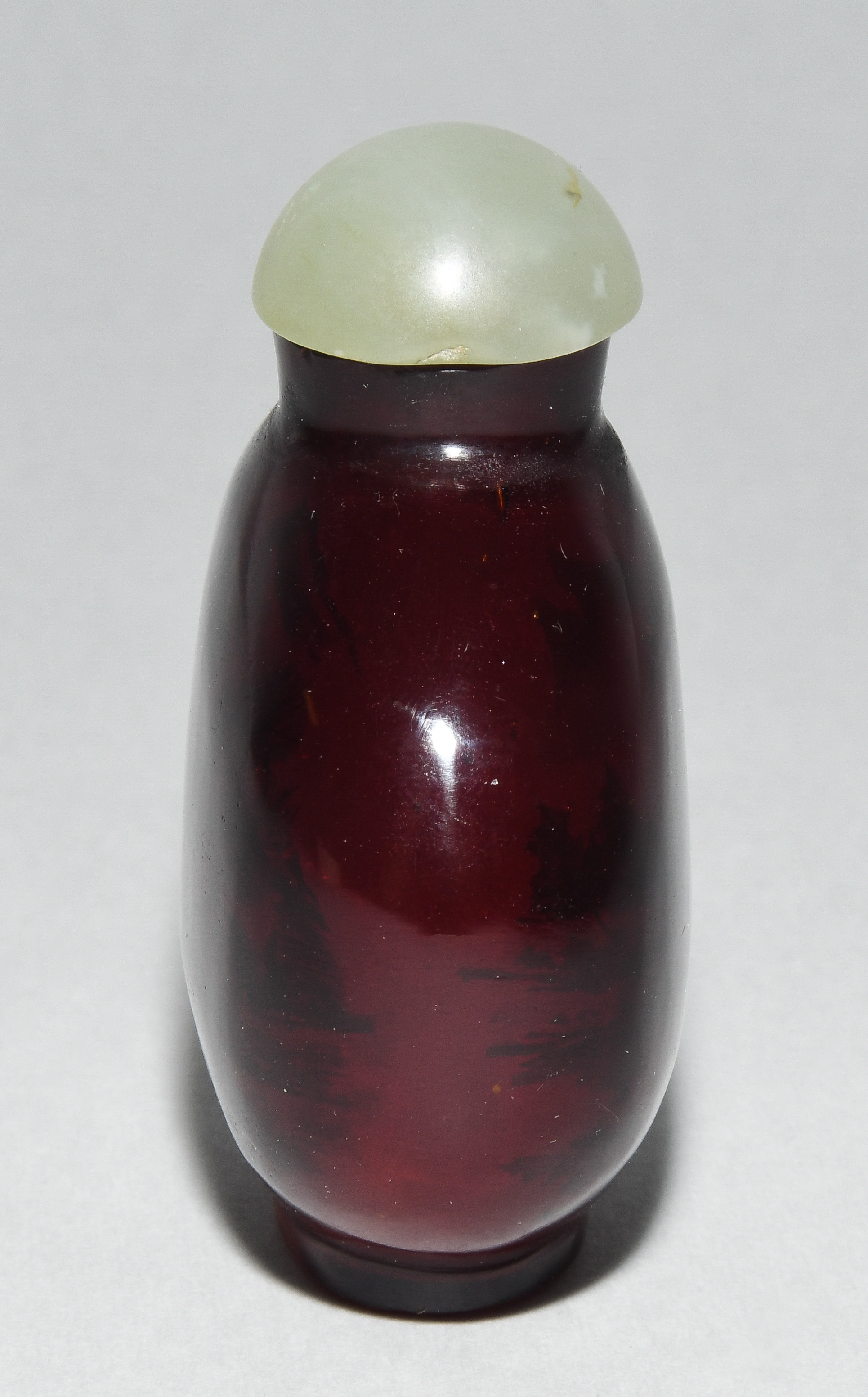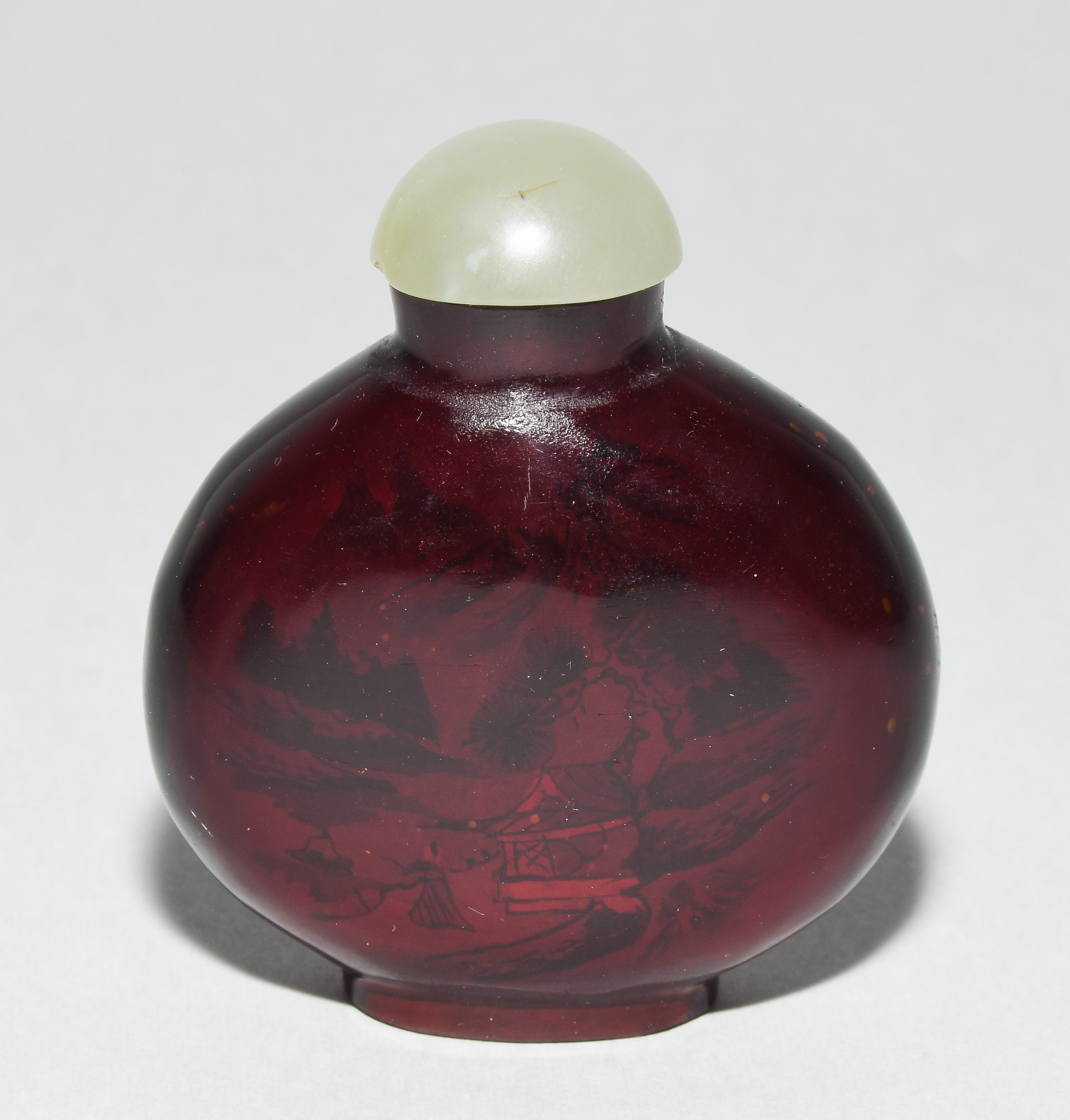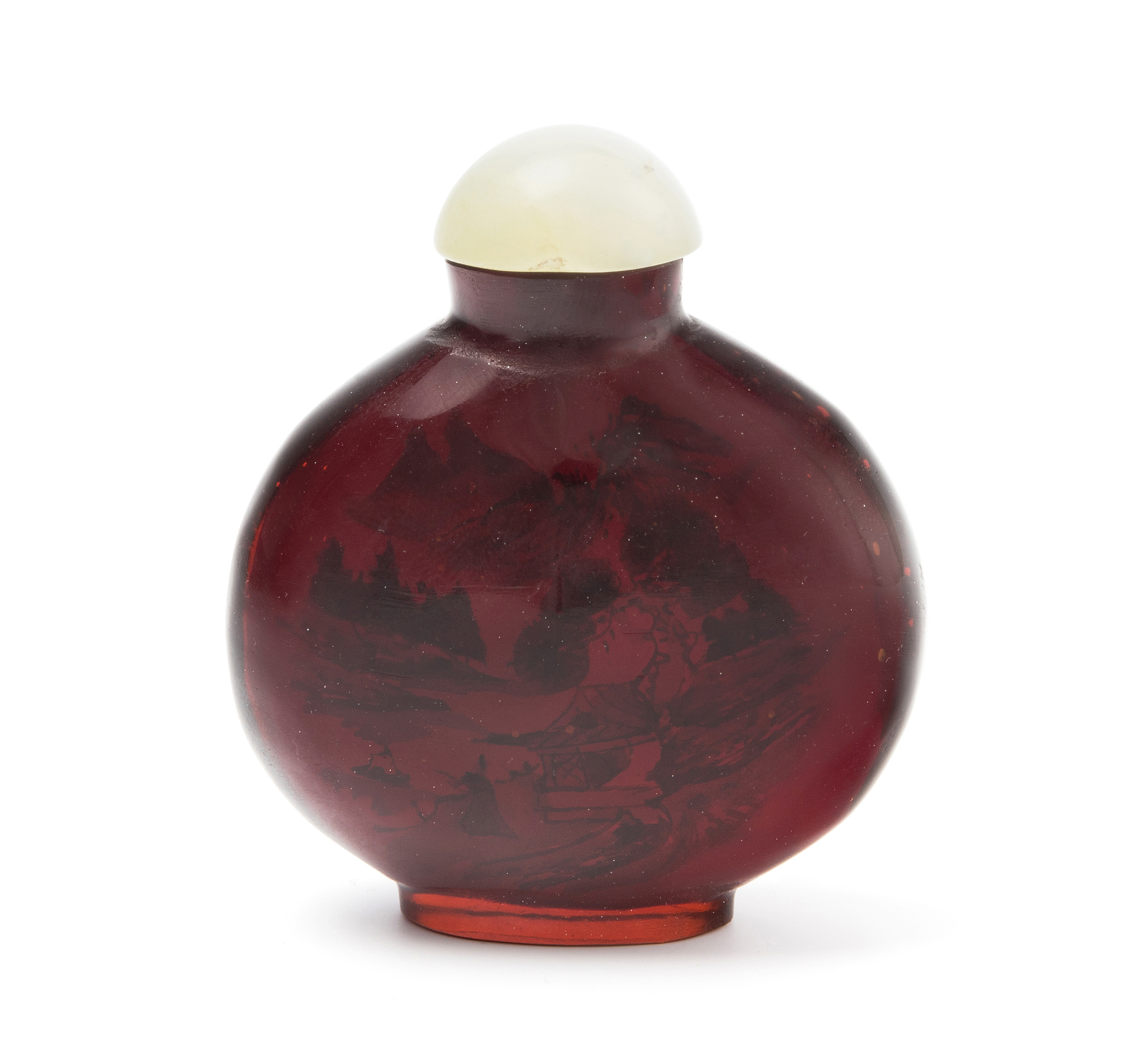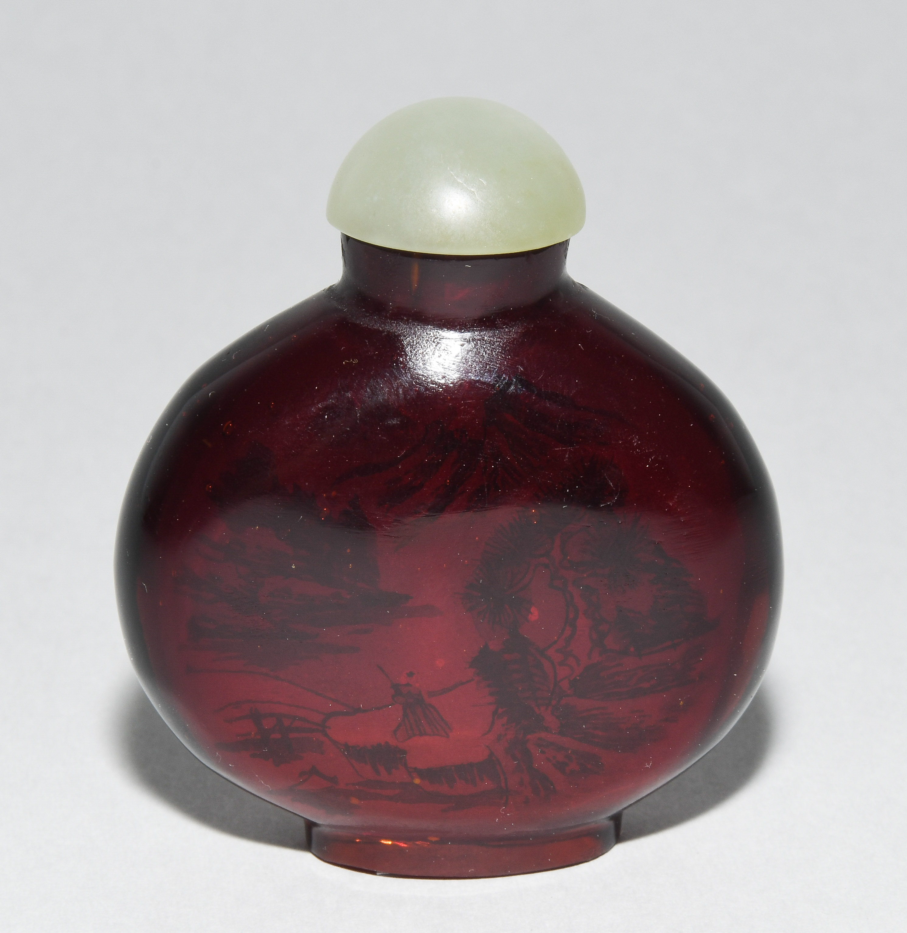China, 20.Jh. Rotes Glas, innen bemalt. Figürliche Landschaftsszene. H 6 cm.