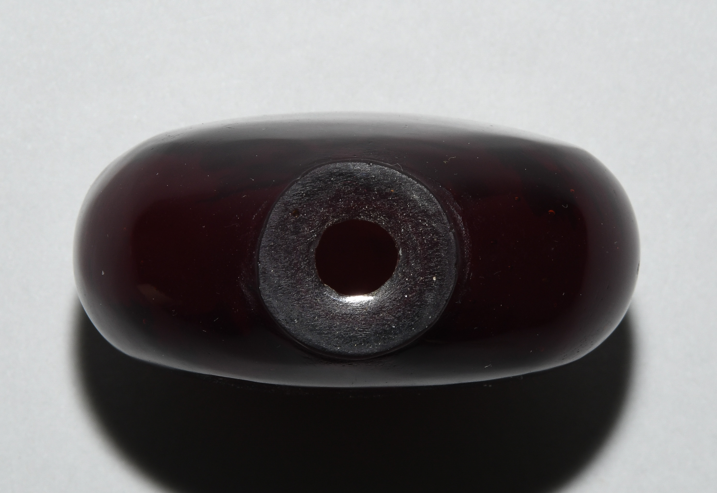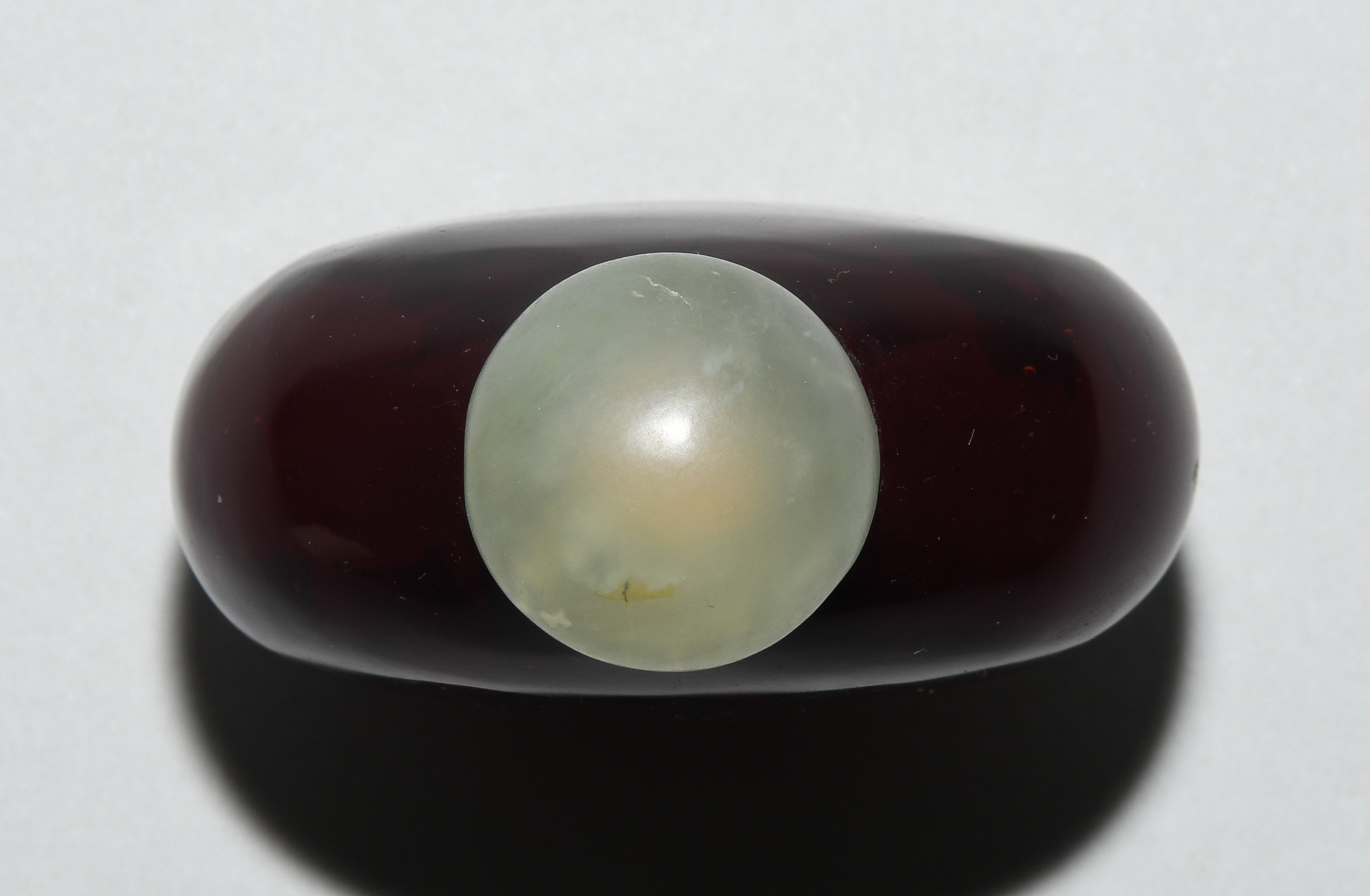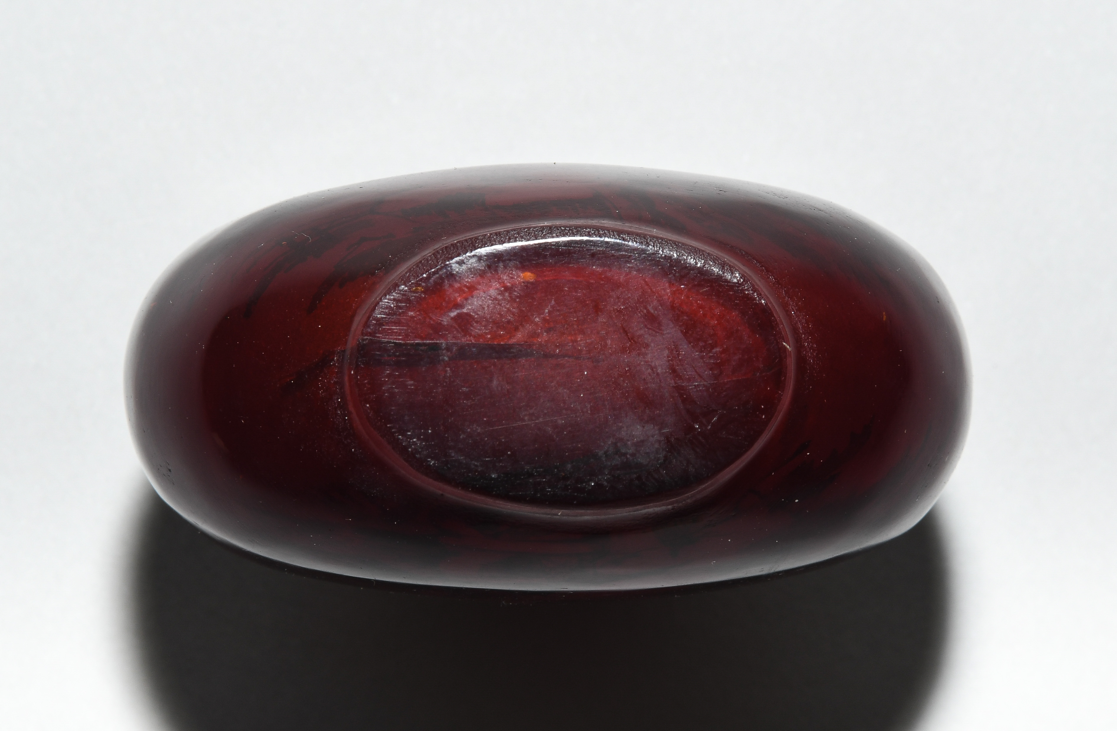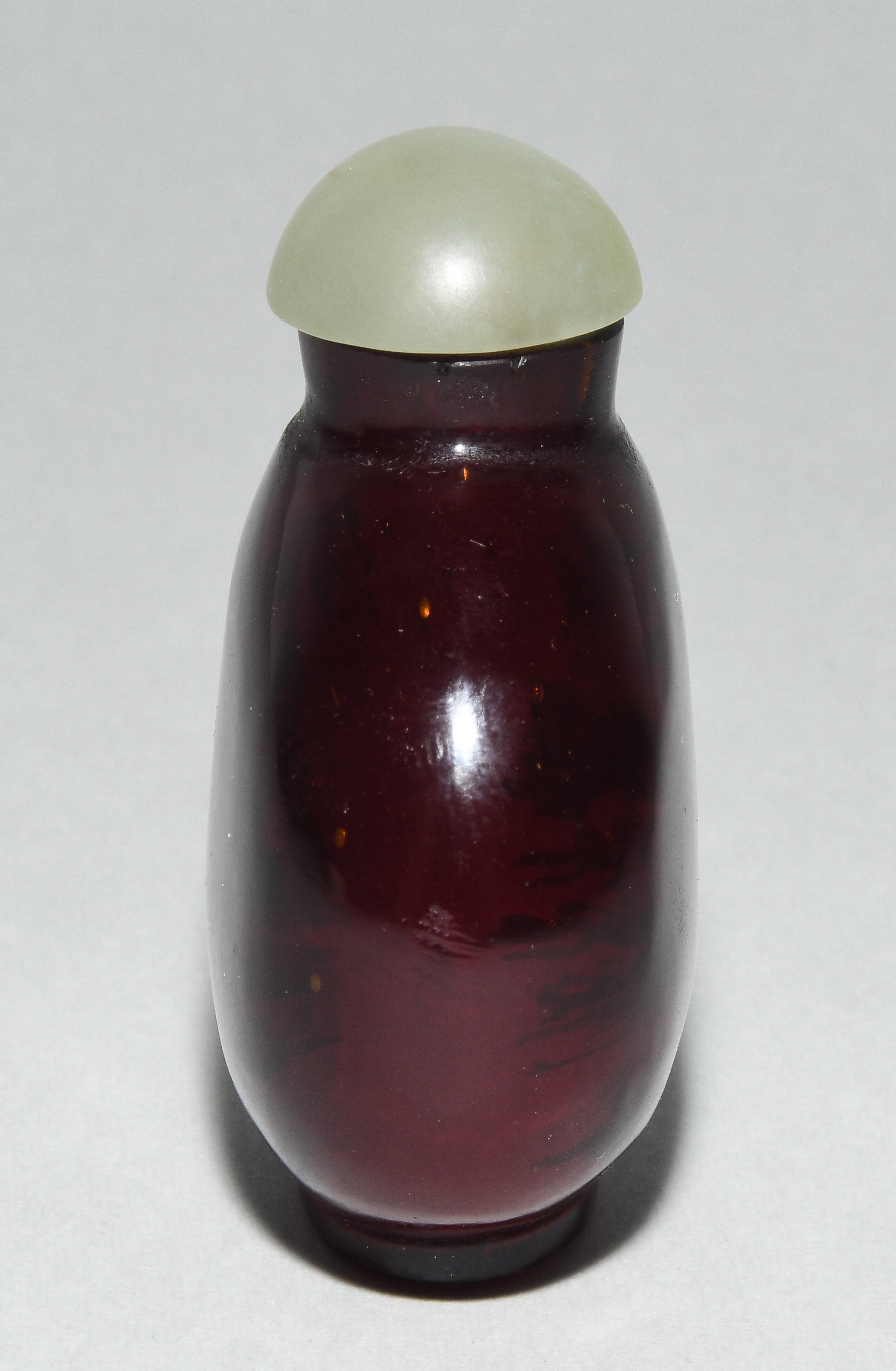 China, 20.Jh. Rotes Glas, innen bemalt. Figürliche Landschaftsszene. H 6 cm.