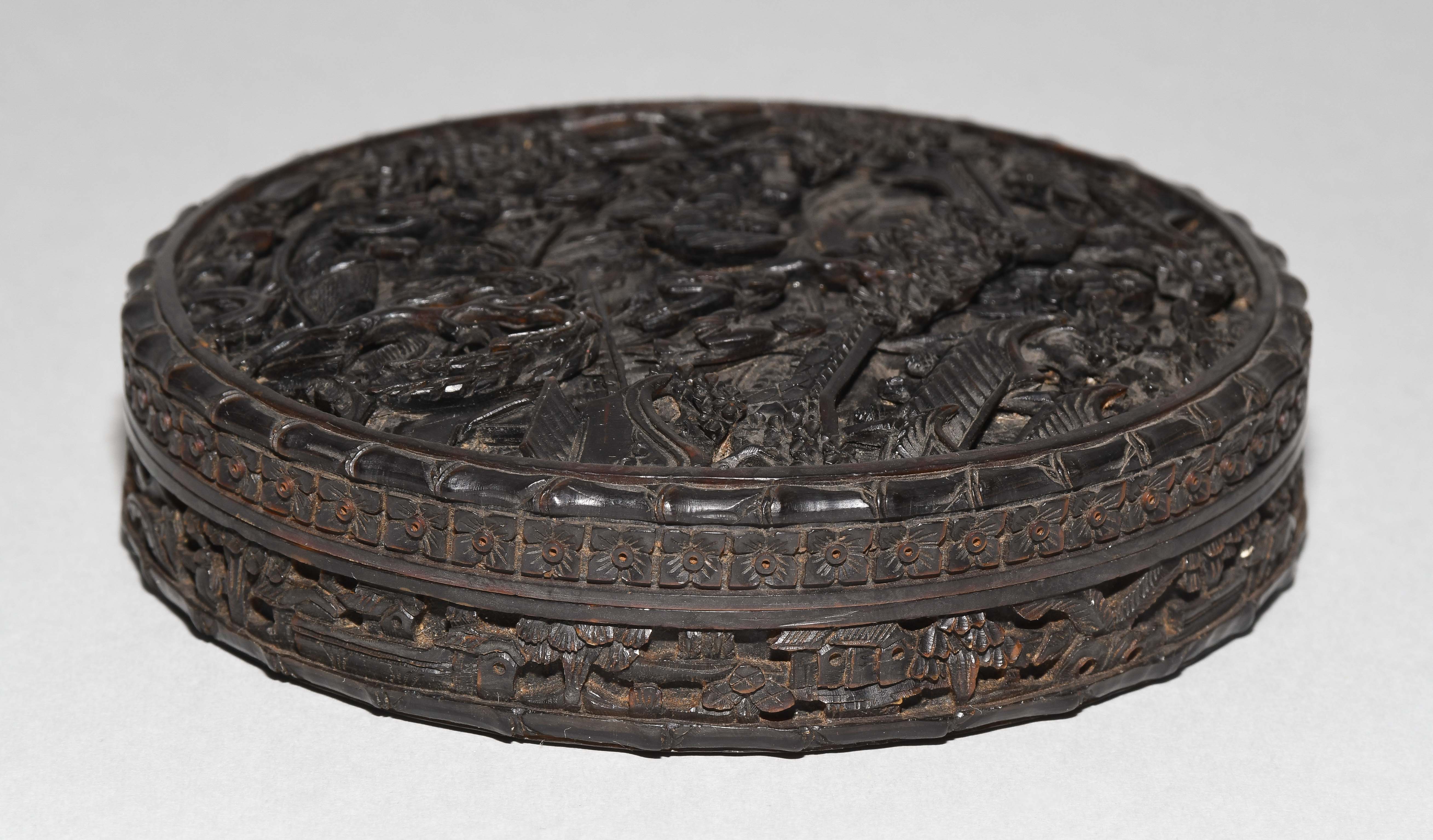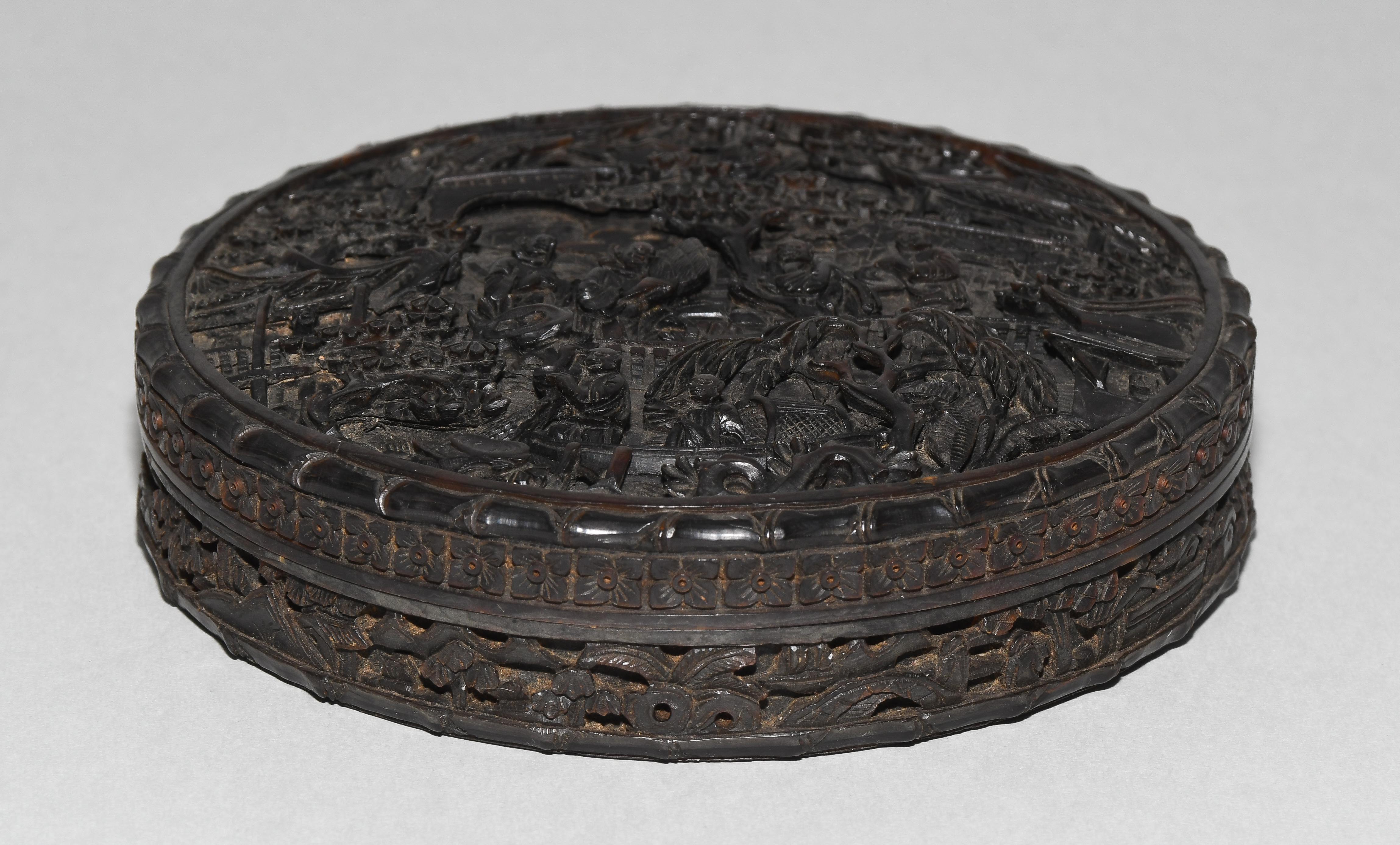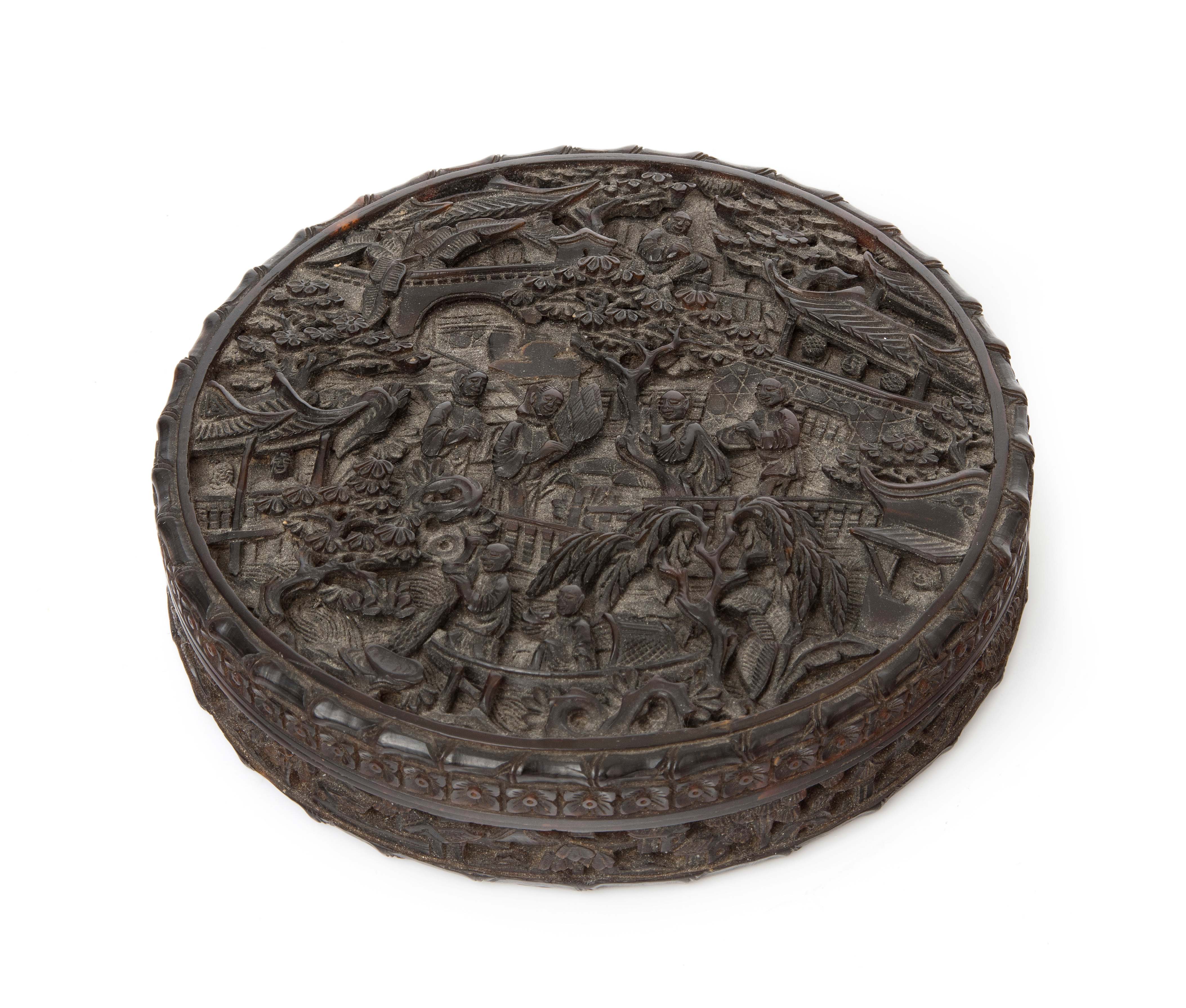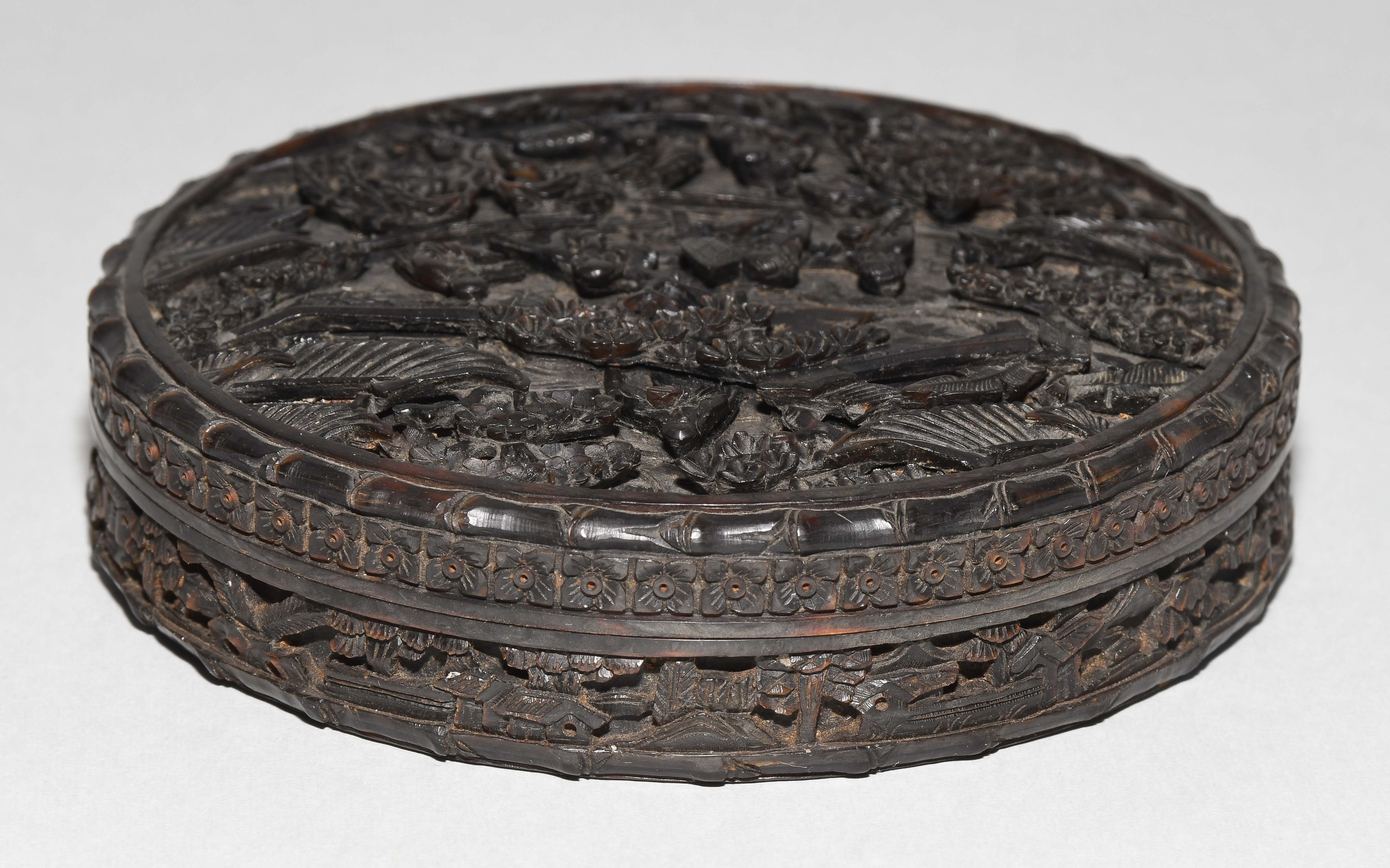 China, um 1900. Kanton. Schildpatt. Zwei Schauseiten, Deckel sowie Boden und Rand reichlich verziert mit geschnitzter figürlicher Szene im Hof und am Fluss. D 10,5 cm.