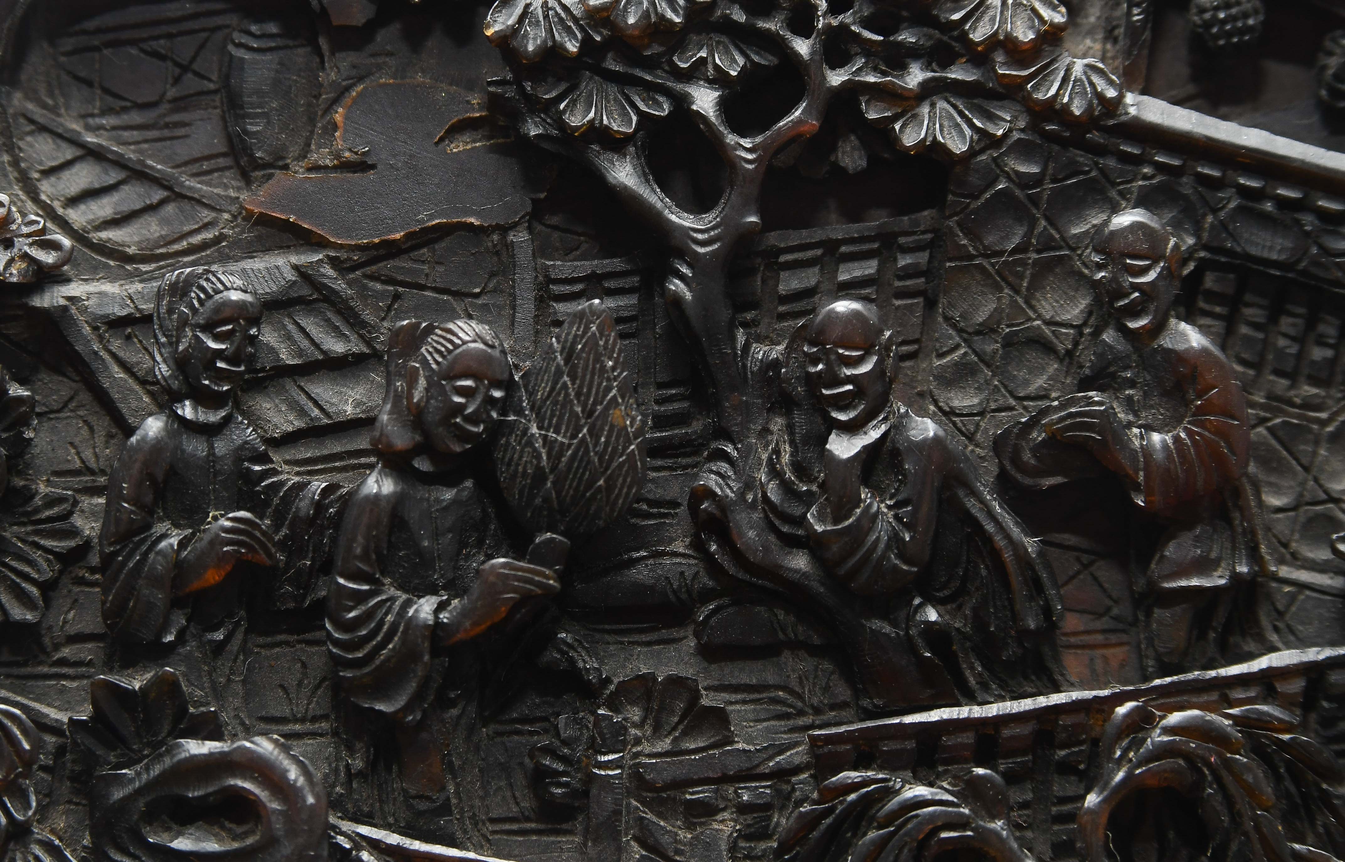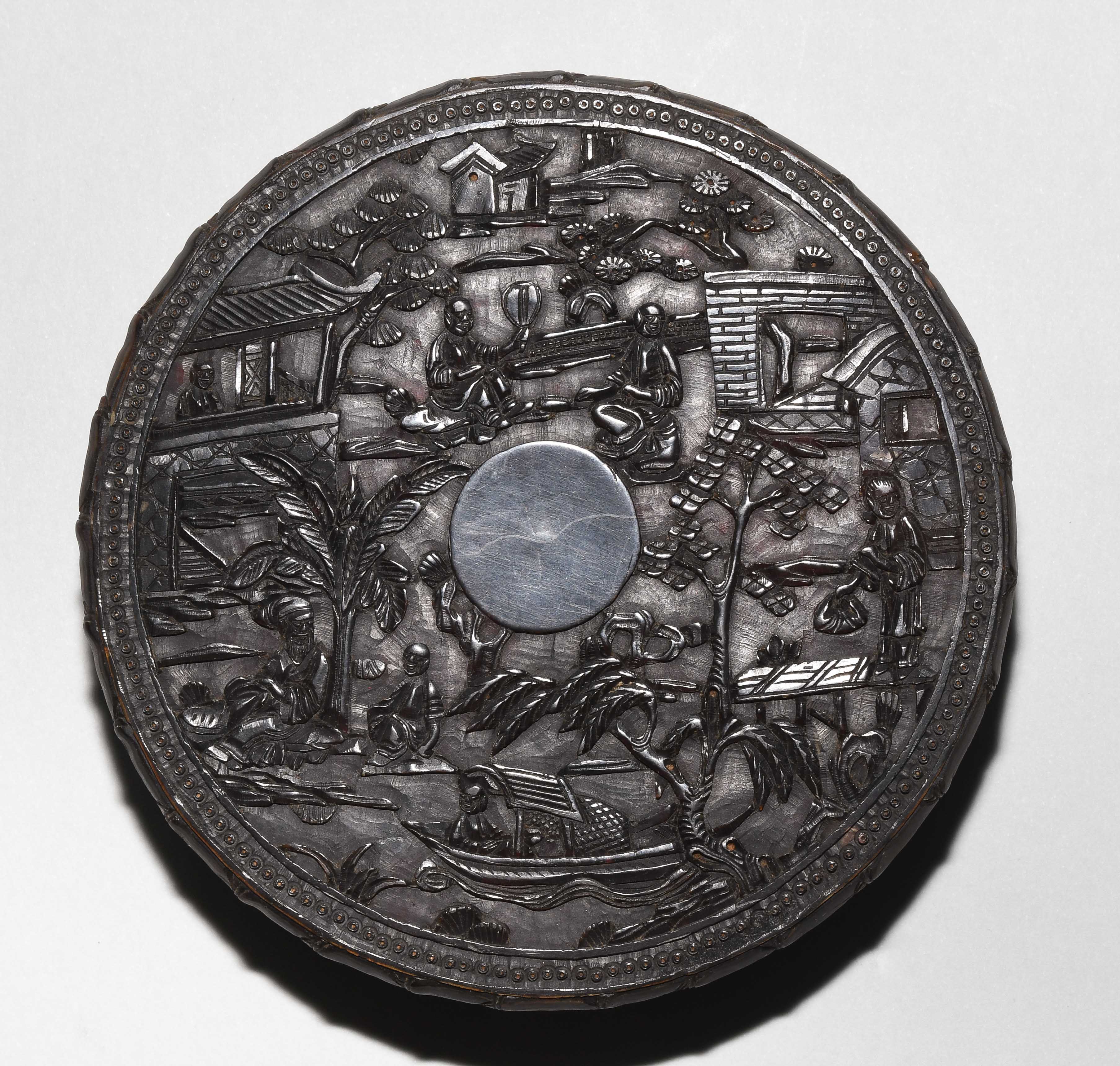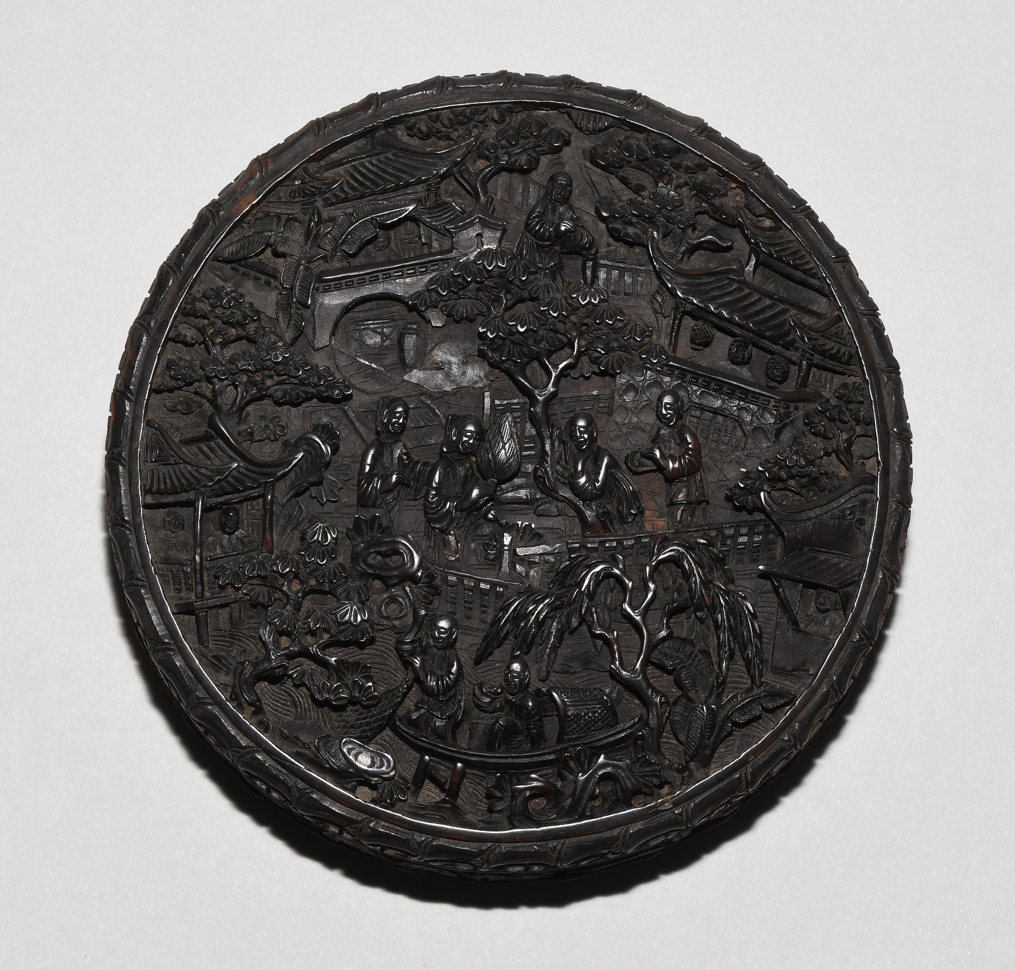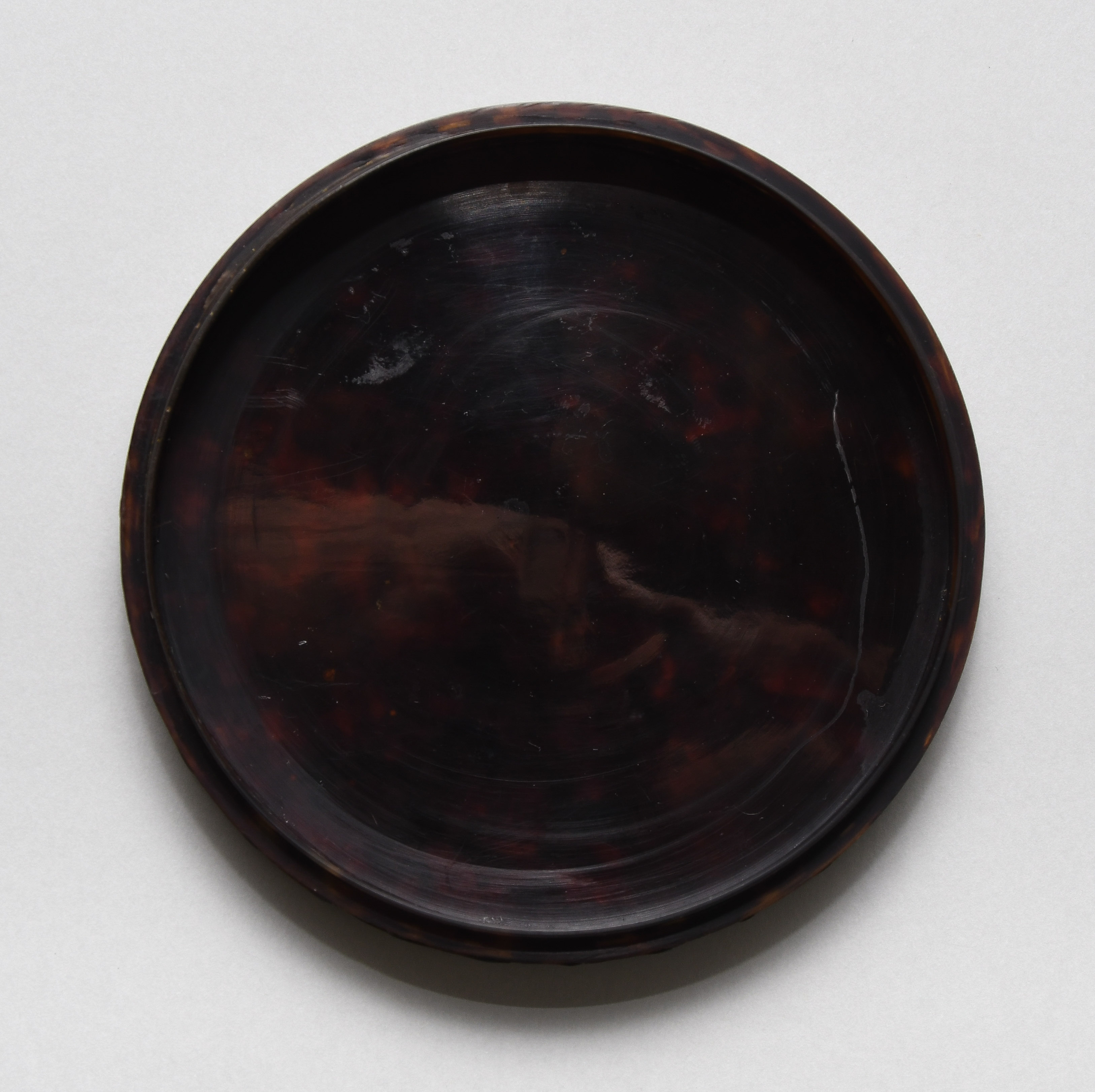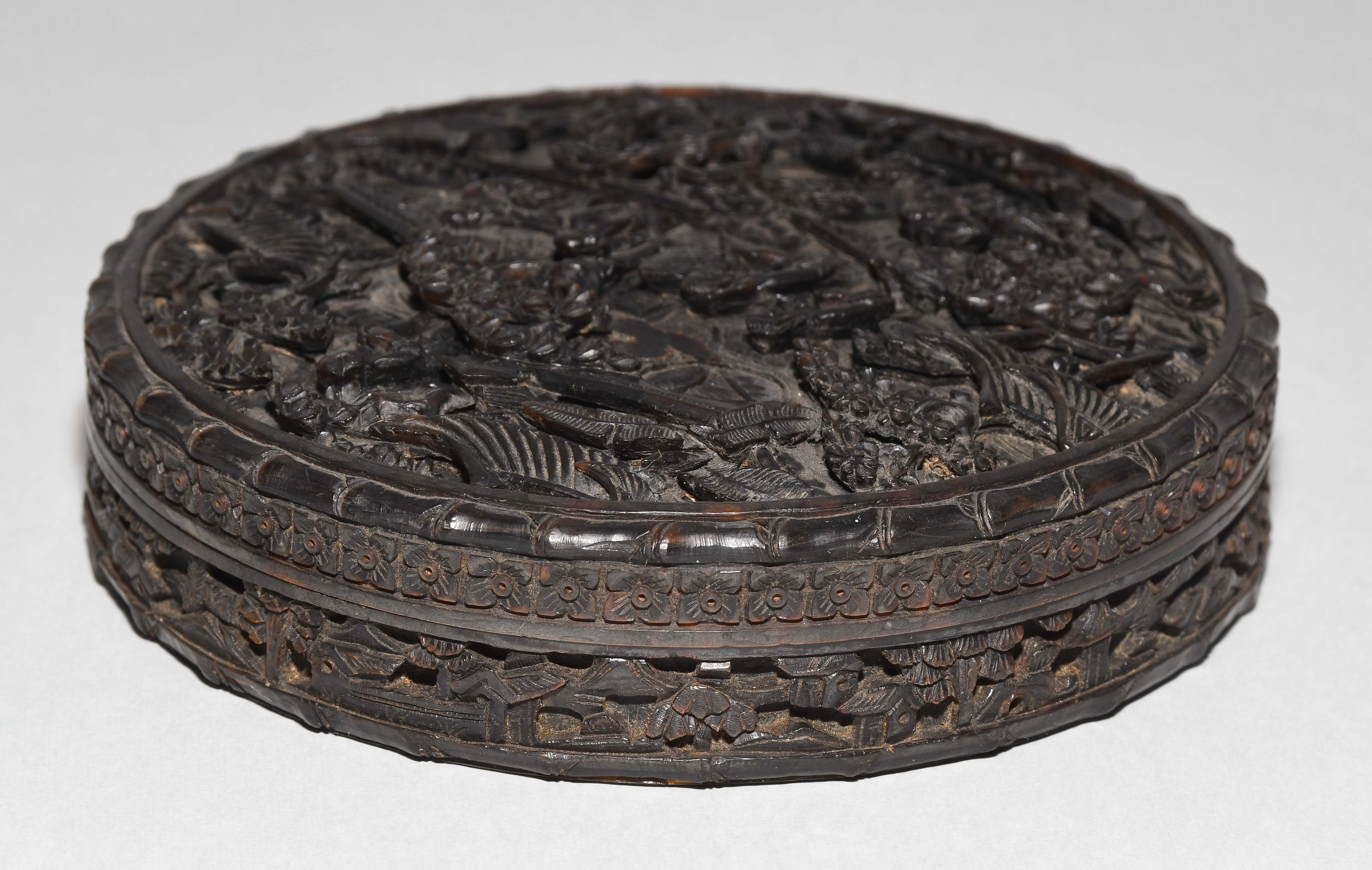 China, um 1900. Kanton. Schildpatt. Zwei Schauseiten, Deckel sowie Boden und Rand reichlich verziert mit geschnitzter figürlicher Szene im Hof und am Fluss. D 10,5 cm.