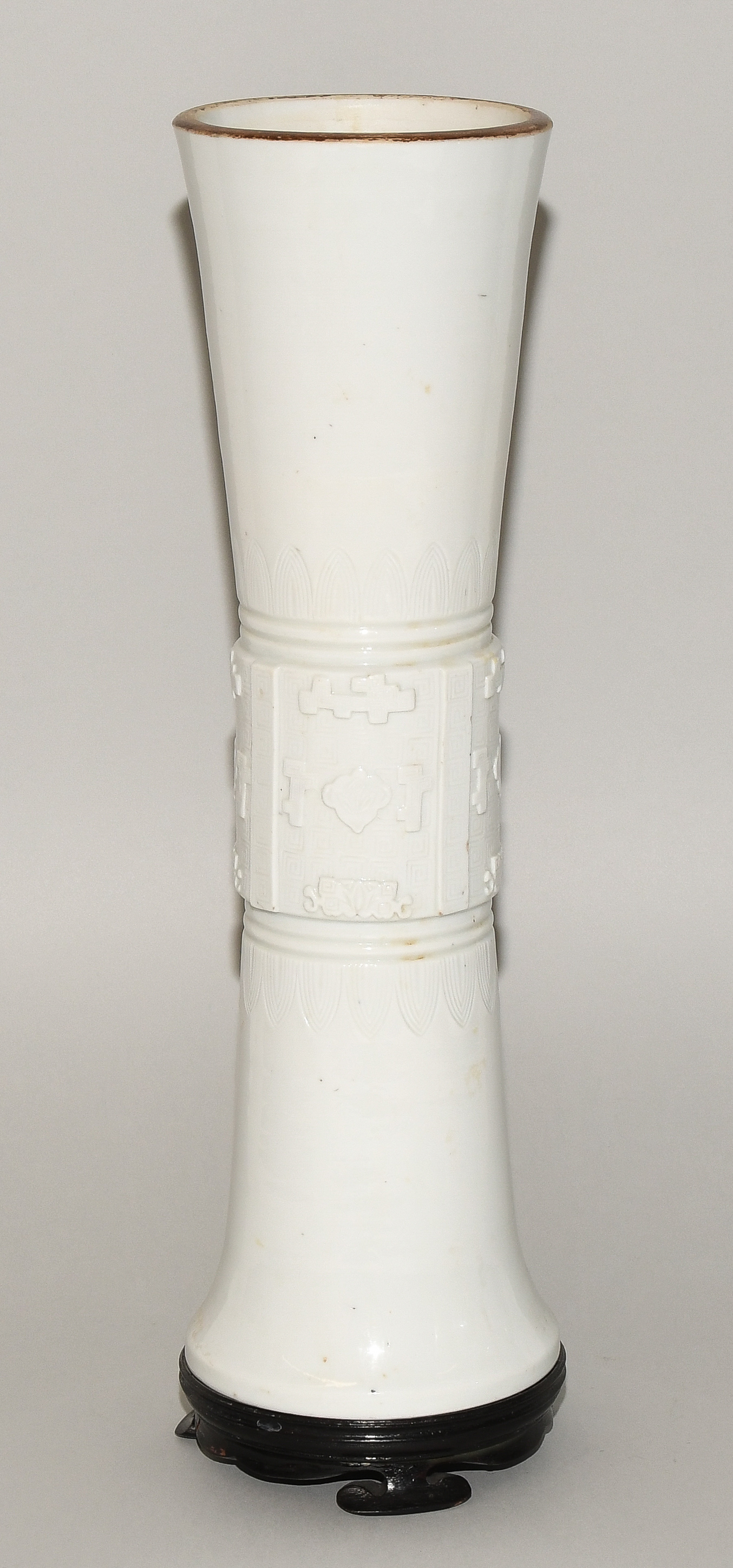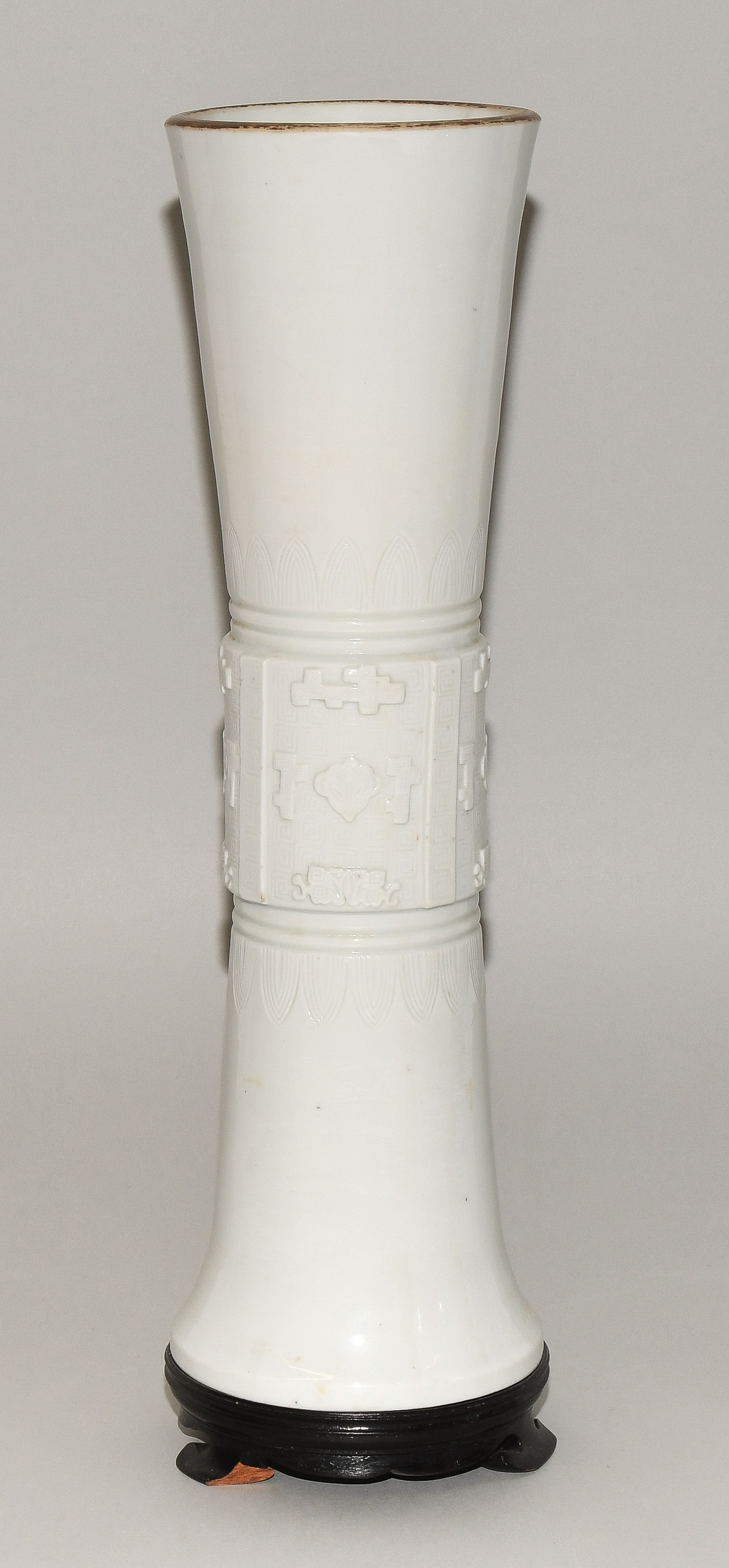 China, Qing-Dynastie. Porzellan. Blanc-de-Chine. Zentral verziert mit Tao-tie-Masken sowie geometrischem Dekor auf Meander-Motif. Mündung braun bemalt. Ca. H 39,5. Vase. / 42 cm. Fest auf Holzsockel montiert.