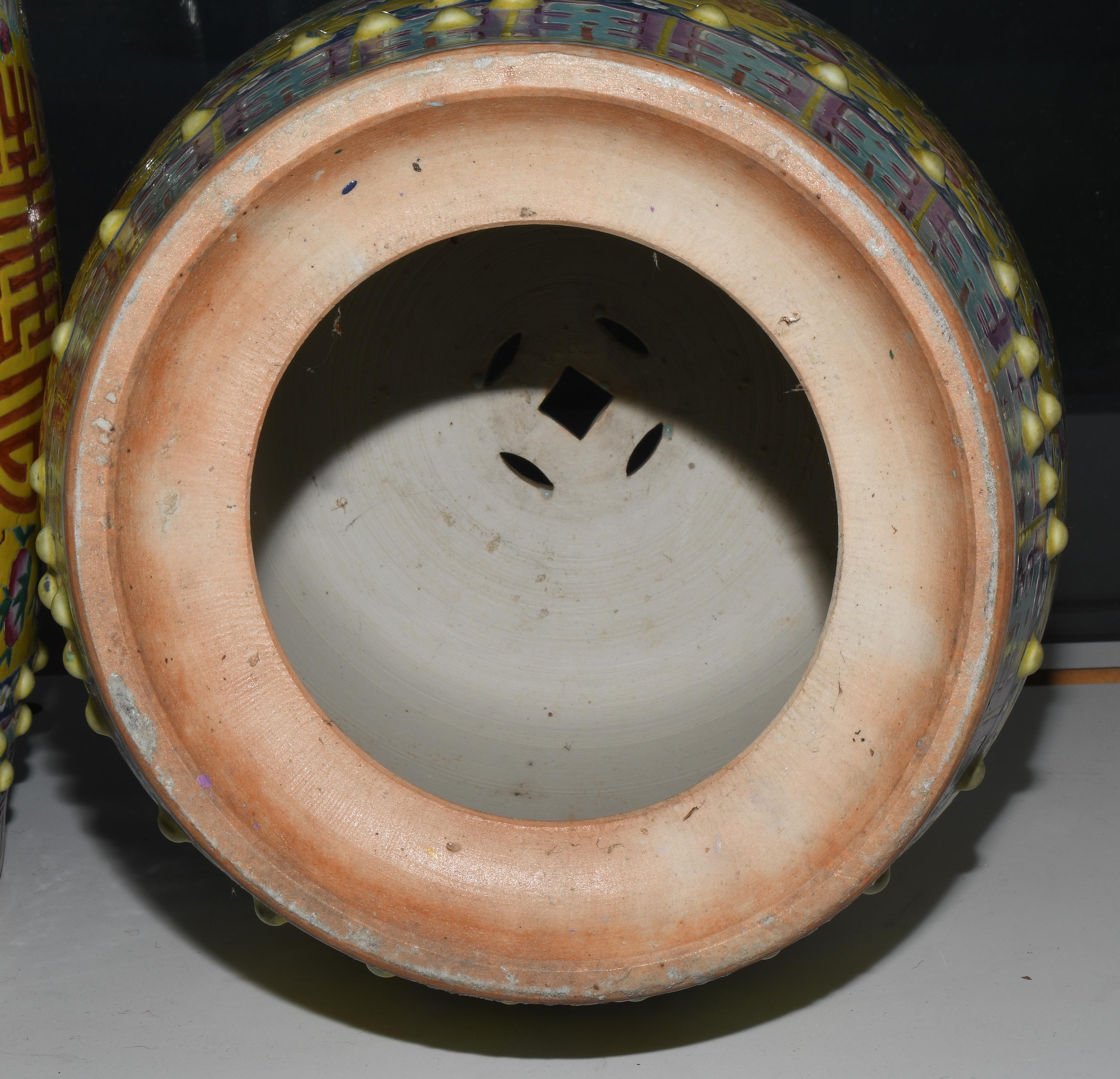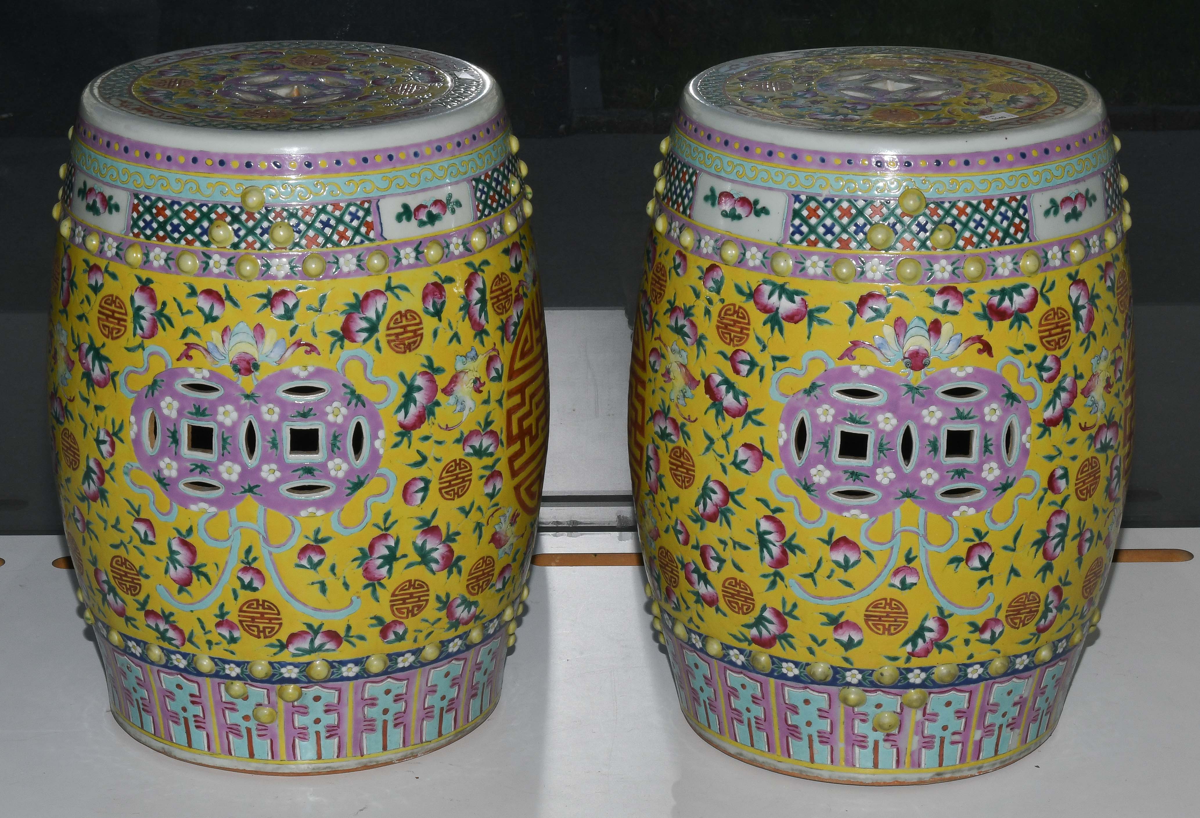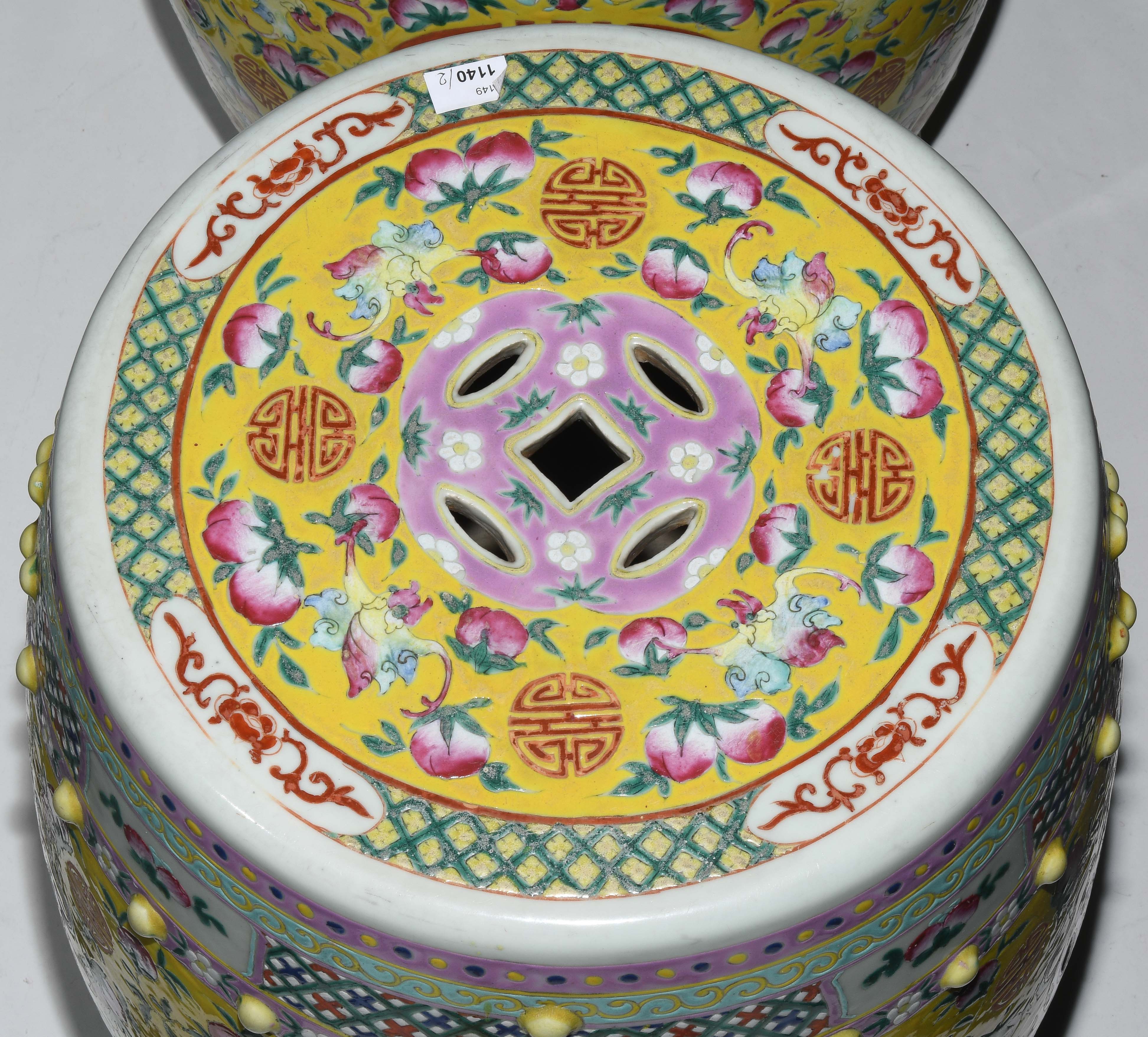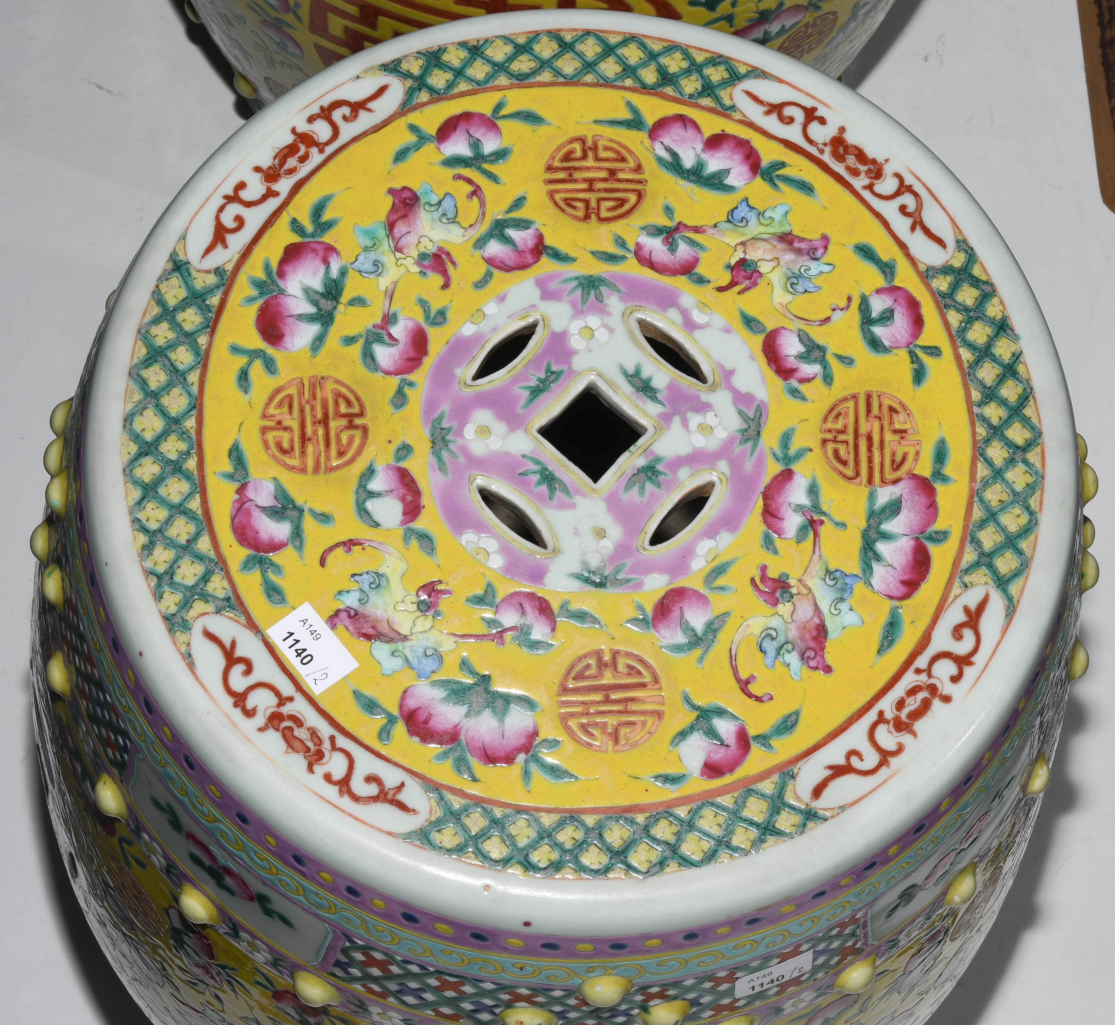 China, 20.Jh. Porzellan. Trommelförmige Hocker mit runden Noppen und münzförmigen Öffnungen. Polychromer Blumen-/Vogeldekor auf gelbem Fond. Glasur berieben. H 48 cm.