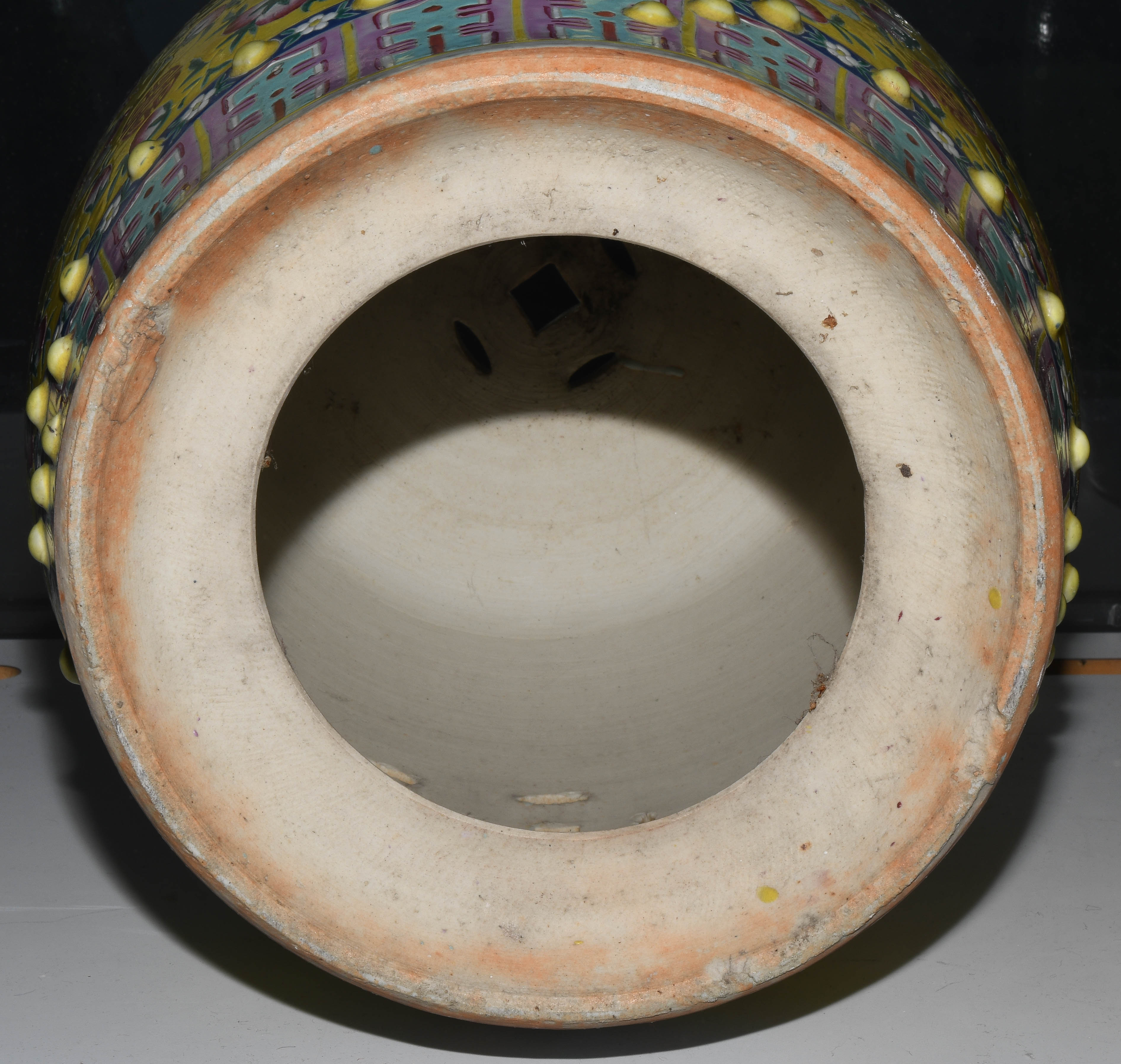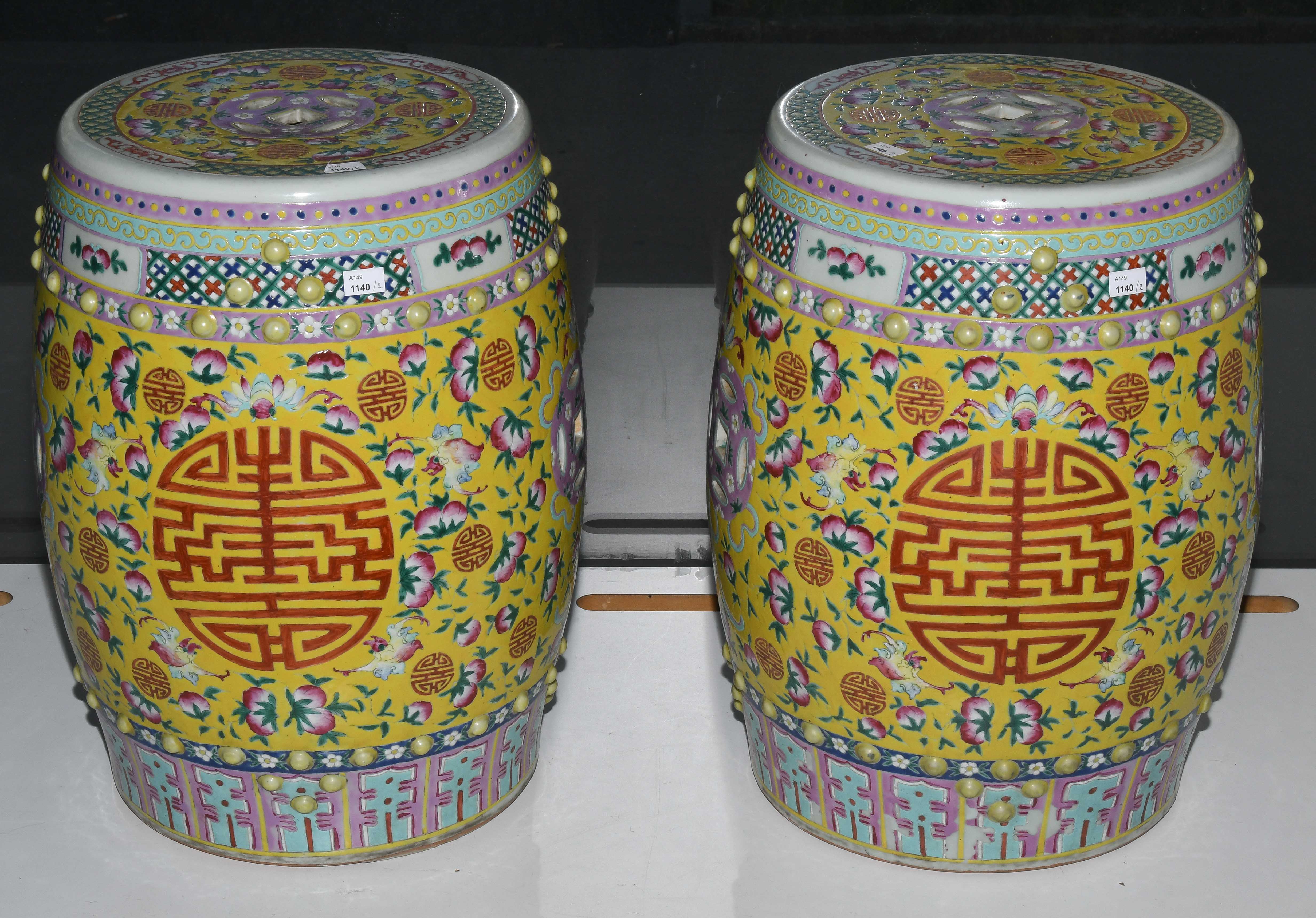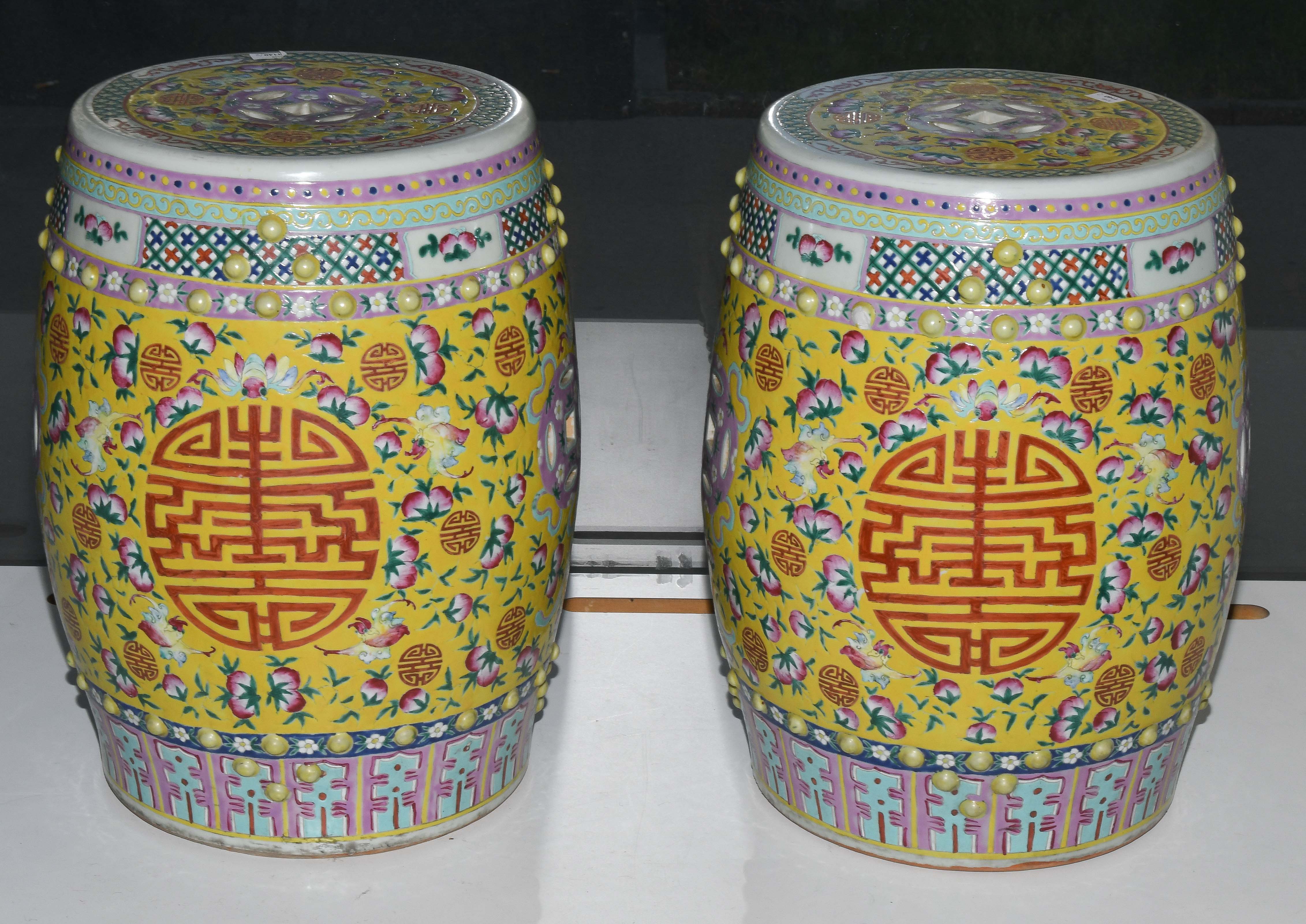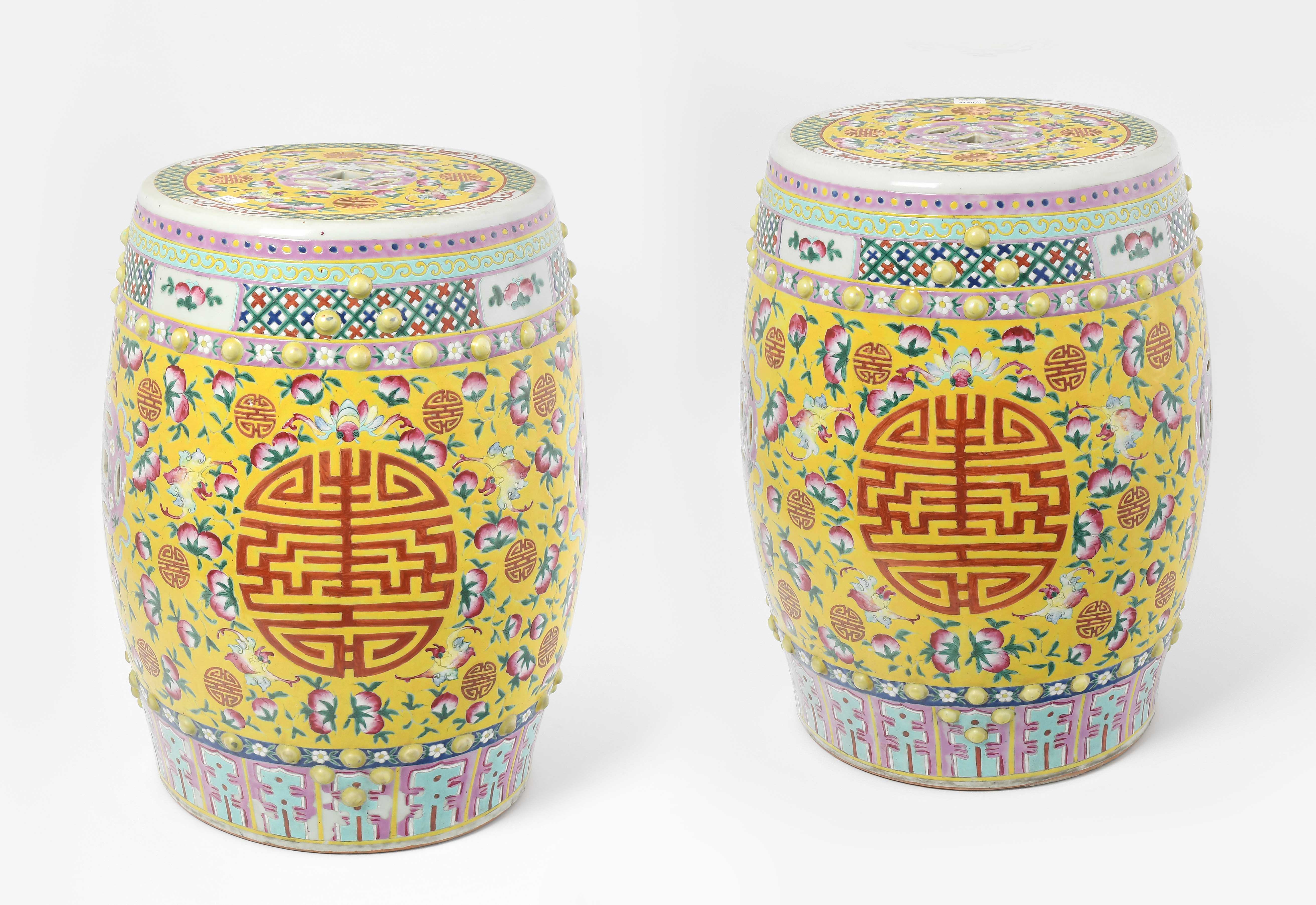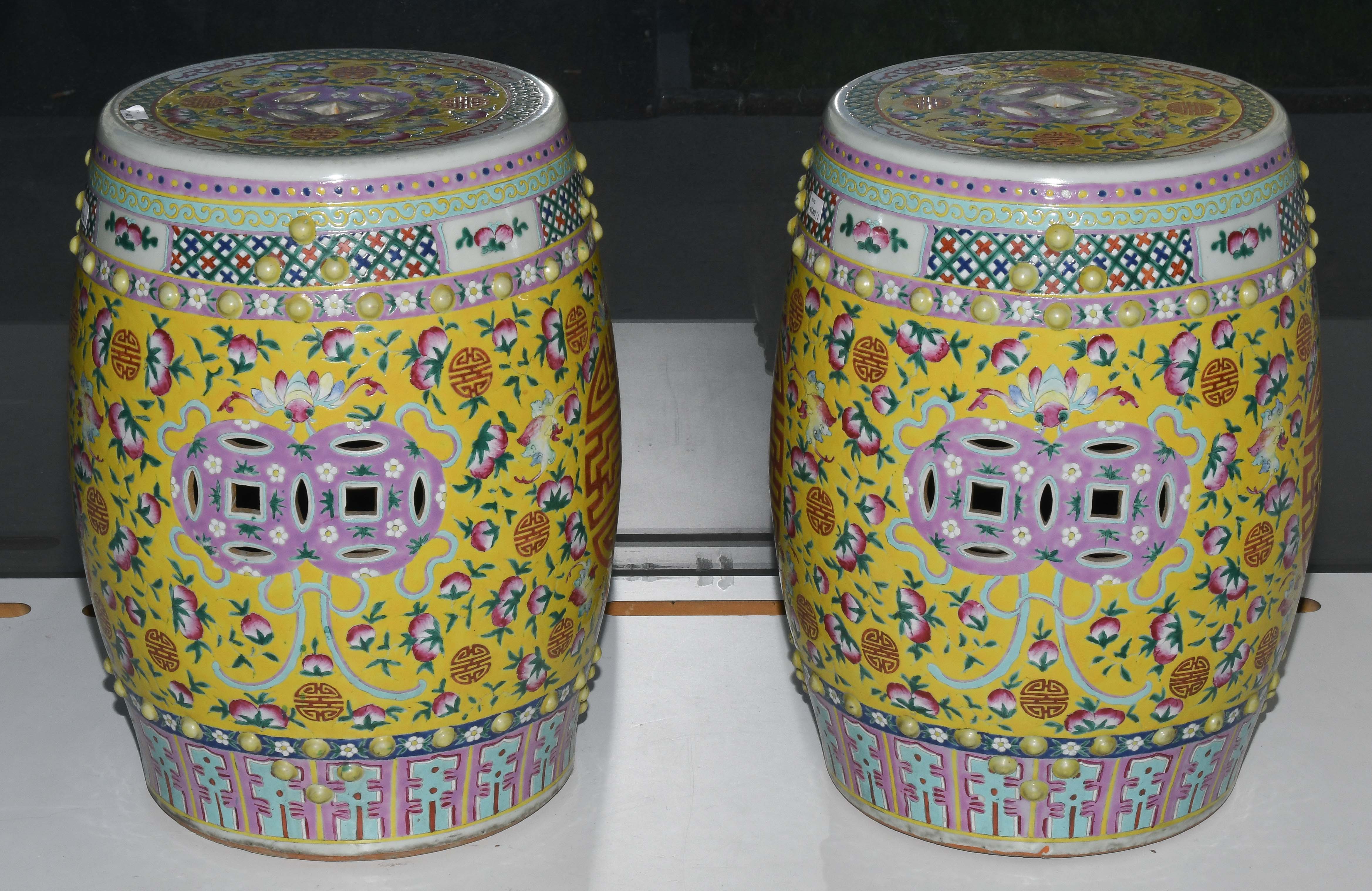 China, 20.Jh. Porzellan. Trommelförmige Hocker mit runden Noppen und münzförmigen Öffnungen. Polychromer Blumen-/Vogeldekor auf gelbem Fond. Glasur berieben. H 48 cm.