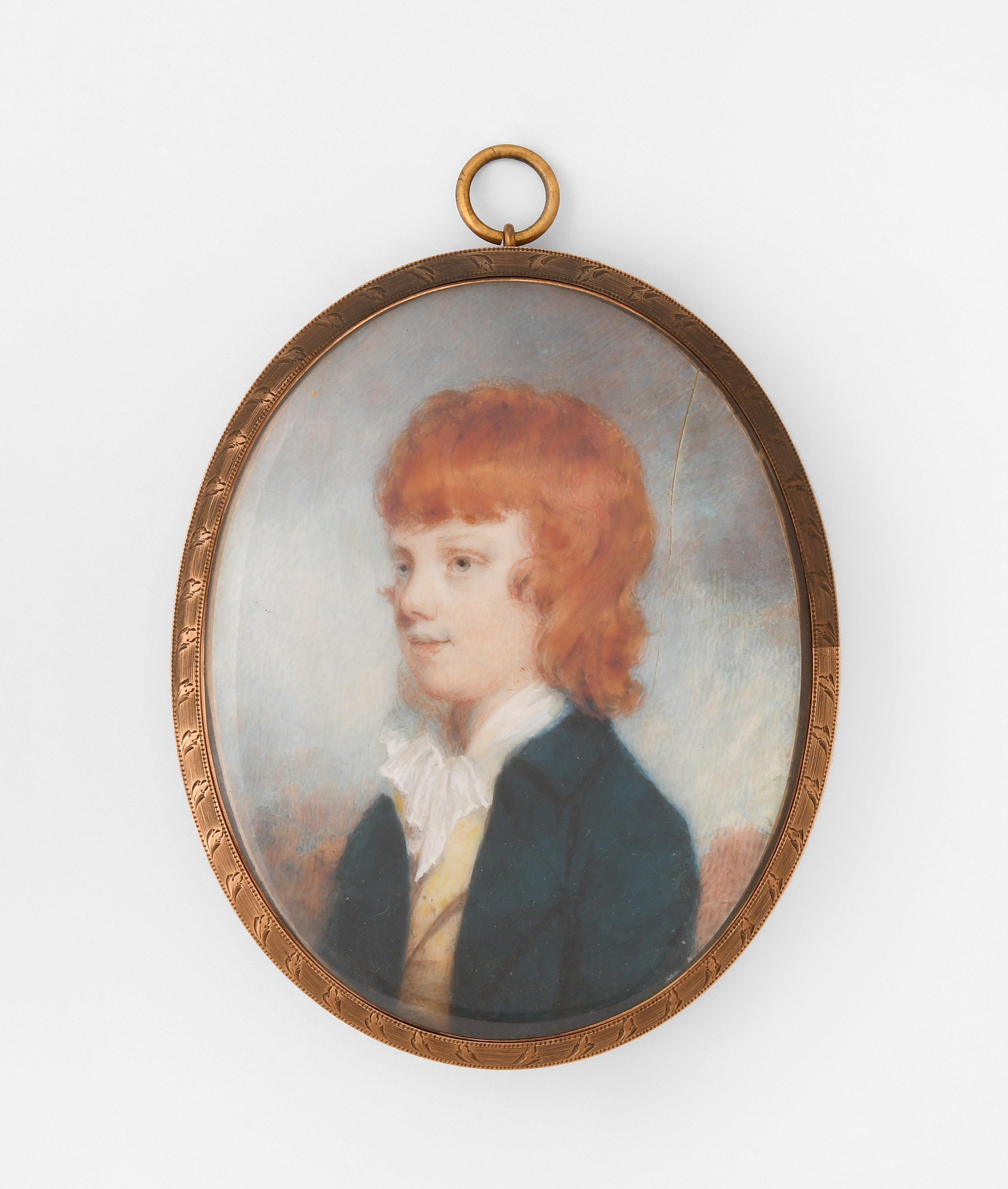 Englische Schule, 19.Jh. Gouachemalerei auf Elfenbein, oval. Brustbild eines Jungen mit rotem Haar, gekleidet in grünem Rock, beiger Weste und weisser Halsbinde vor Himmelshintergrund. Rückseitig verglast. Gefasst. 6,7x8,6 cm.