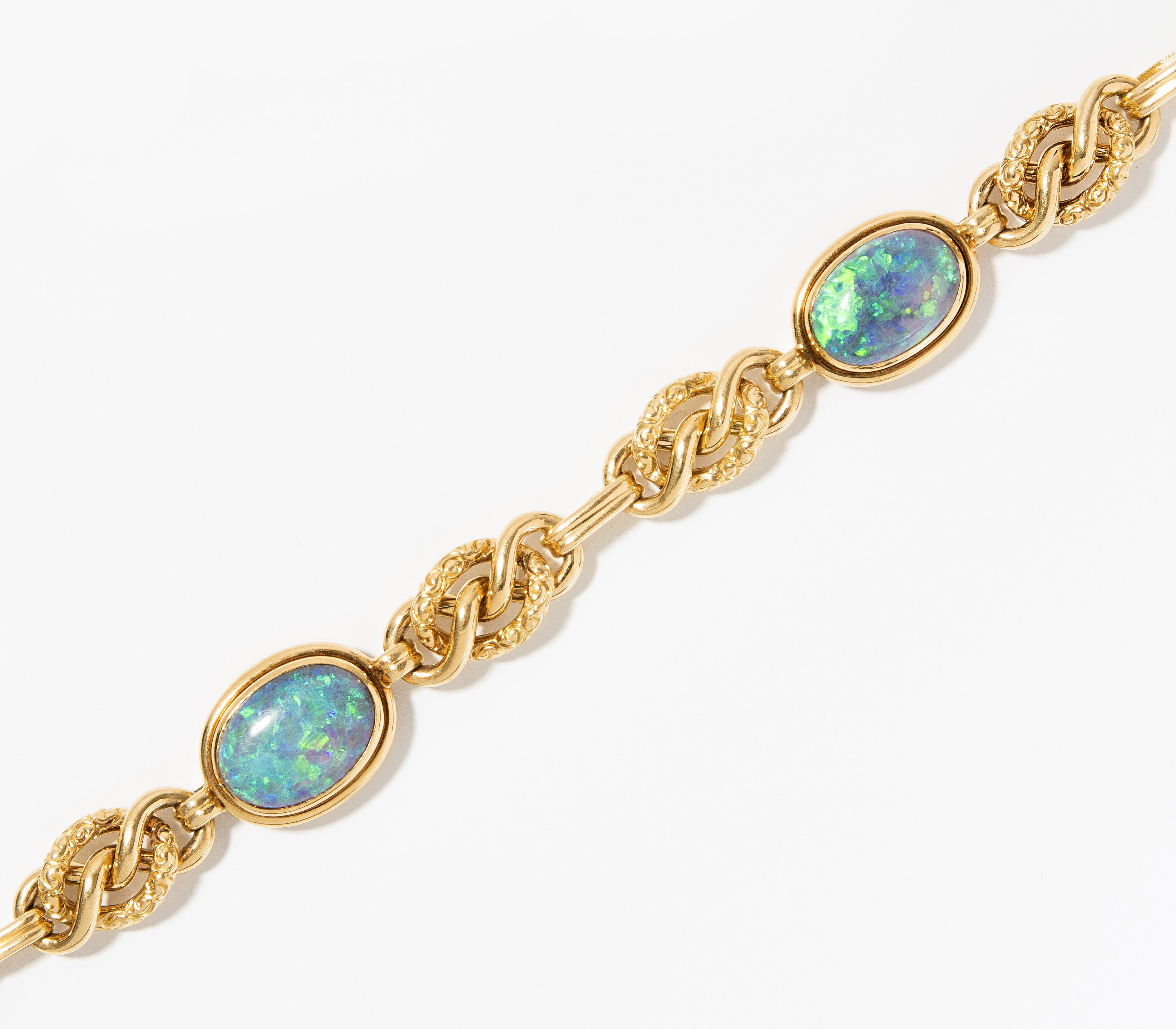 Gübelin, wohl 1960er Jahre. Teilweise strukturierte Knotenmotive mit 2 ovalen Opalen mit schönem Farbspiel von ca. 4 und 5.40 ct. (Trockenrisse). L 18 cm, 31,7 g.