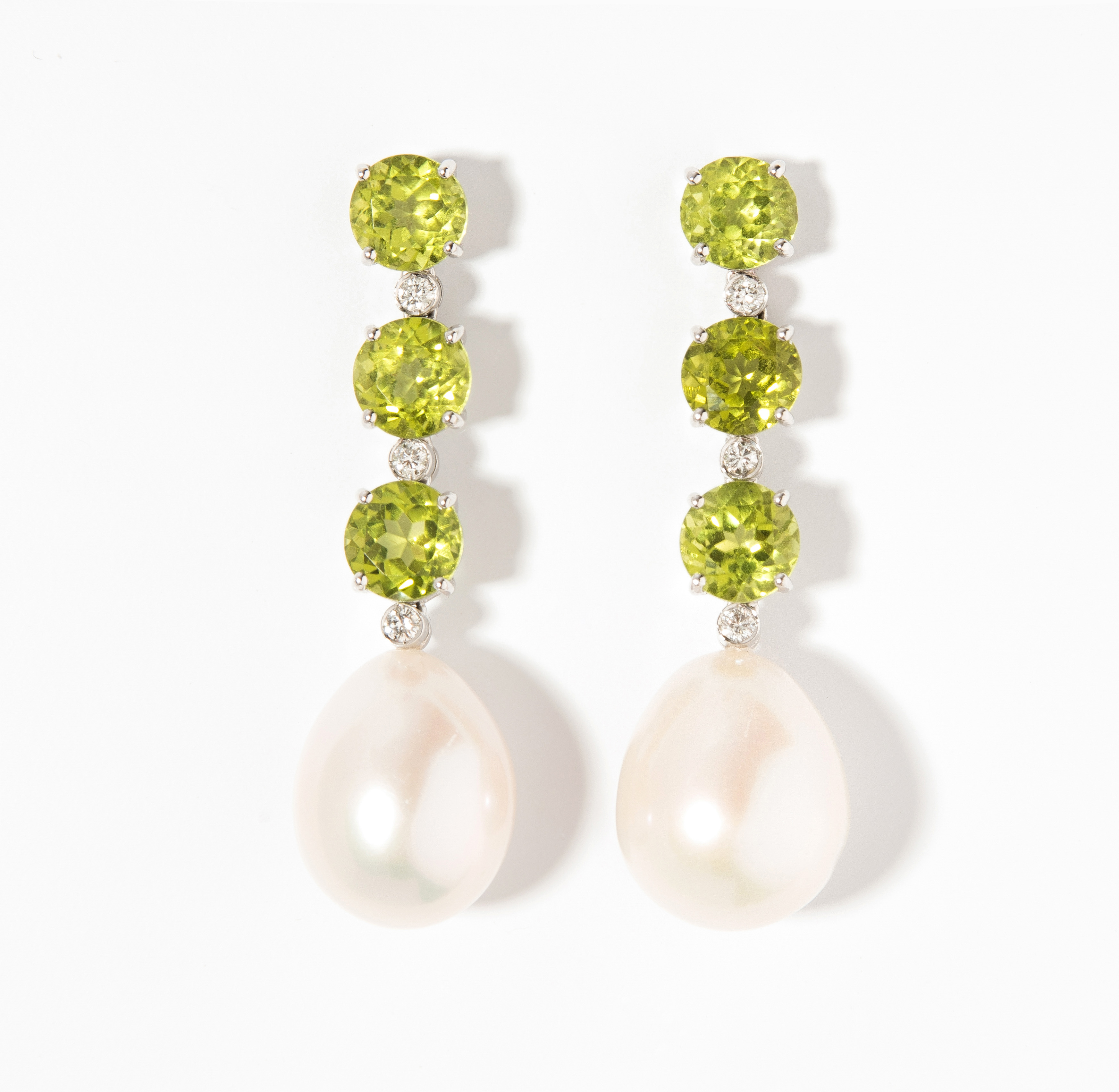 750 Weissgold. 2 Süsswasserperl-Tropfen je ca. 12,5 mm, 6 rund fac. Peridots ca. 7 ct und 6 Brillanten 0.10 ct. L 4 cm. 13 g.