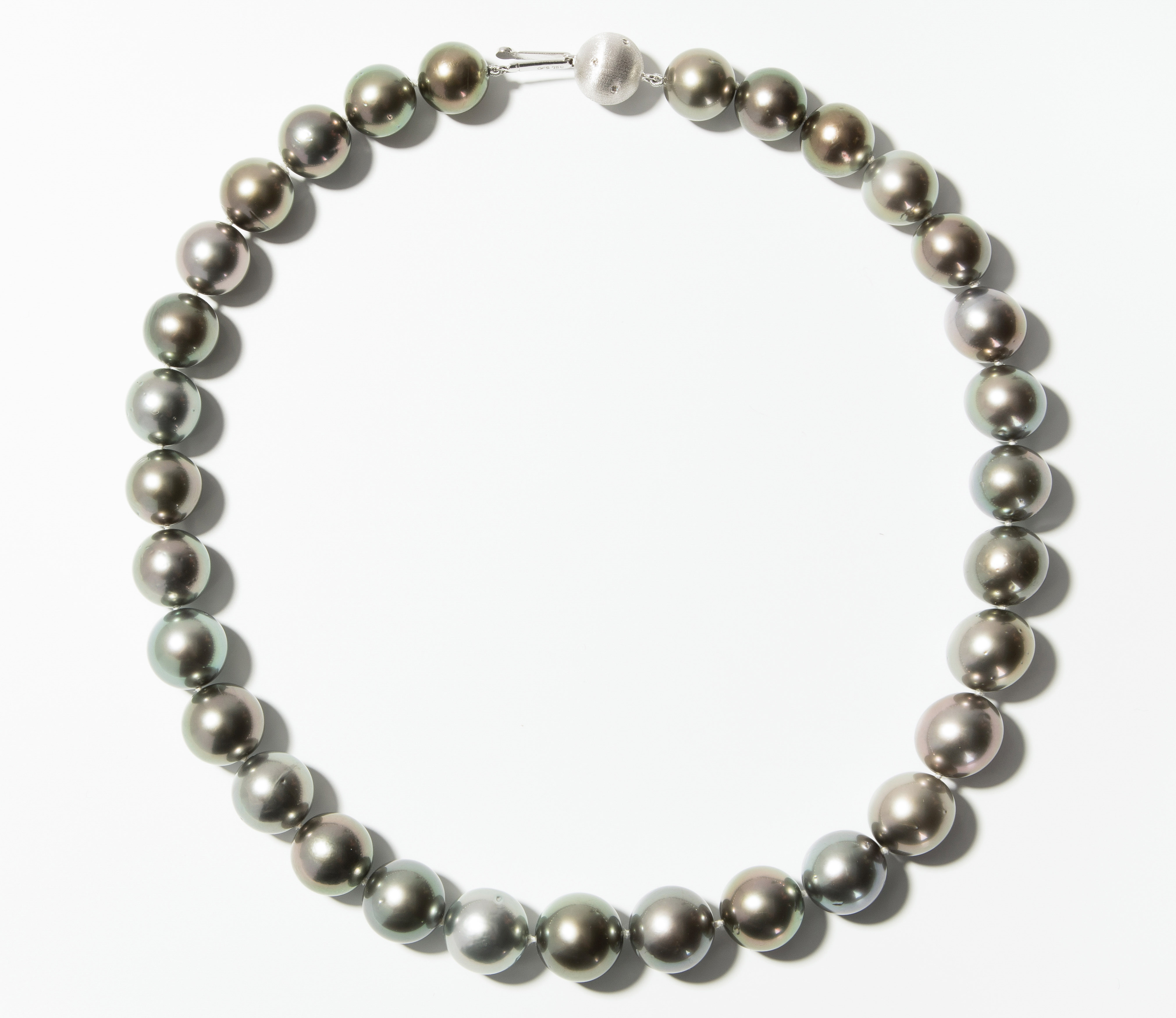 750 Weissgold. Feines Tahitiperlcollier im Verlauf ca. 12–14,5 mm Ø. Mattierter Kugelverschluss mit Diamantbesatz ca. 0.08 ct. L 44 cm.